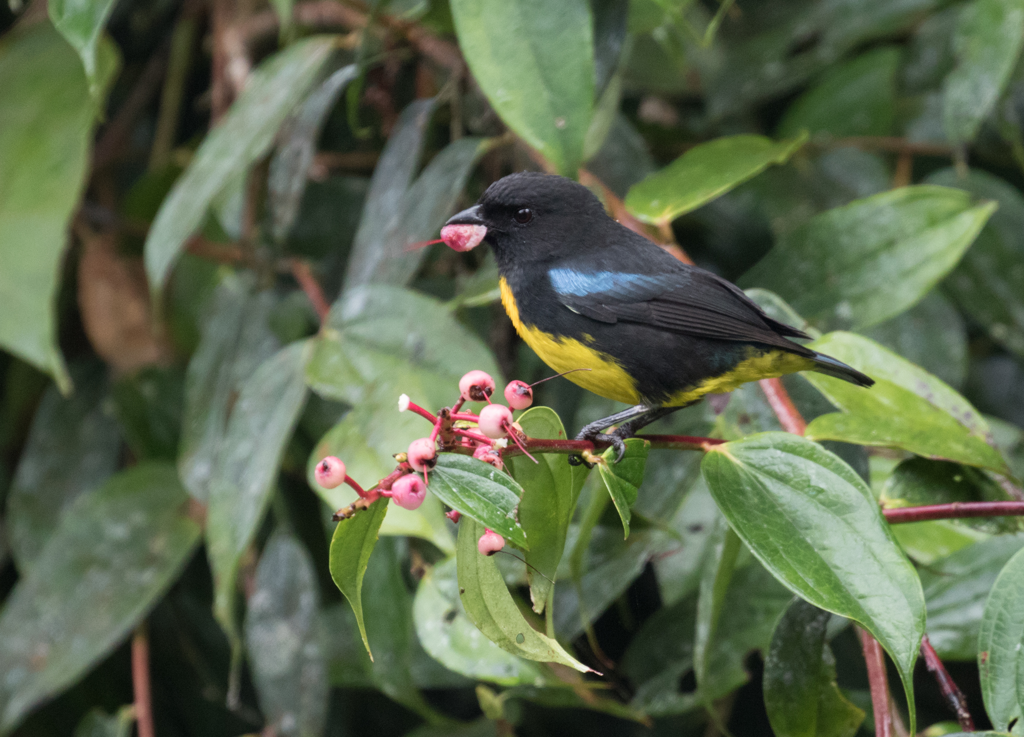 We spent the first part of the morning birding along the road where we encountered some nice flocks as well as some understory birds such as Uniform Treehunter, Alto Pisones Tapaculo, and Narino Tapaculo. After things slowed down a bit we headed off down the only trail and quickly found some White-headed Wrens in a large clearing. As we entered the forest, Yellow-breasted Antpitta and Cloud-forest Pygmy-Owls began calling and Alex taped in a Crested Quetzal. As we continued down the trail we kept finding large feeding flock after large feeding flock. It was an absolutely amazing morning. Our first large flock contained Black Solitaire while our second flock contained Choco Vireo and Crested Ant-Tanager. Other interesting birds commonly found throughout the morning included Toucan Barbet, Buffy Tuftedcheek, Fulvous-dotted Treerunner, and Orange-breasted Fruiteater. We arrived to the highest point midday and after Alex endulged in some “beans and bread” we continued down what was suppoed to be the “loop” trail. Apparently at one point it was a loop, but a massive landside took out a large section of trail so instead we had to turn around and bird our way back out. We once again ran into a few more large flocks which included Purplish-mantled Tanger, Olivaceous Piha, Black-and-Gold Tanger, and I got on a single Club-winged Manakin. We made it back to the main road by late afternoon and finished the day near the hummingbird feeders which included Violet-breasted Coronet, Empress Brillant, and Purple-throated Woodstar.