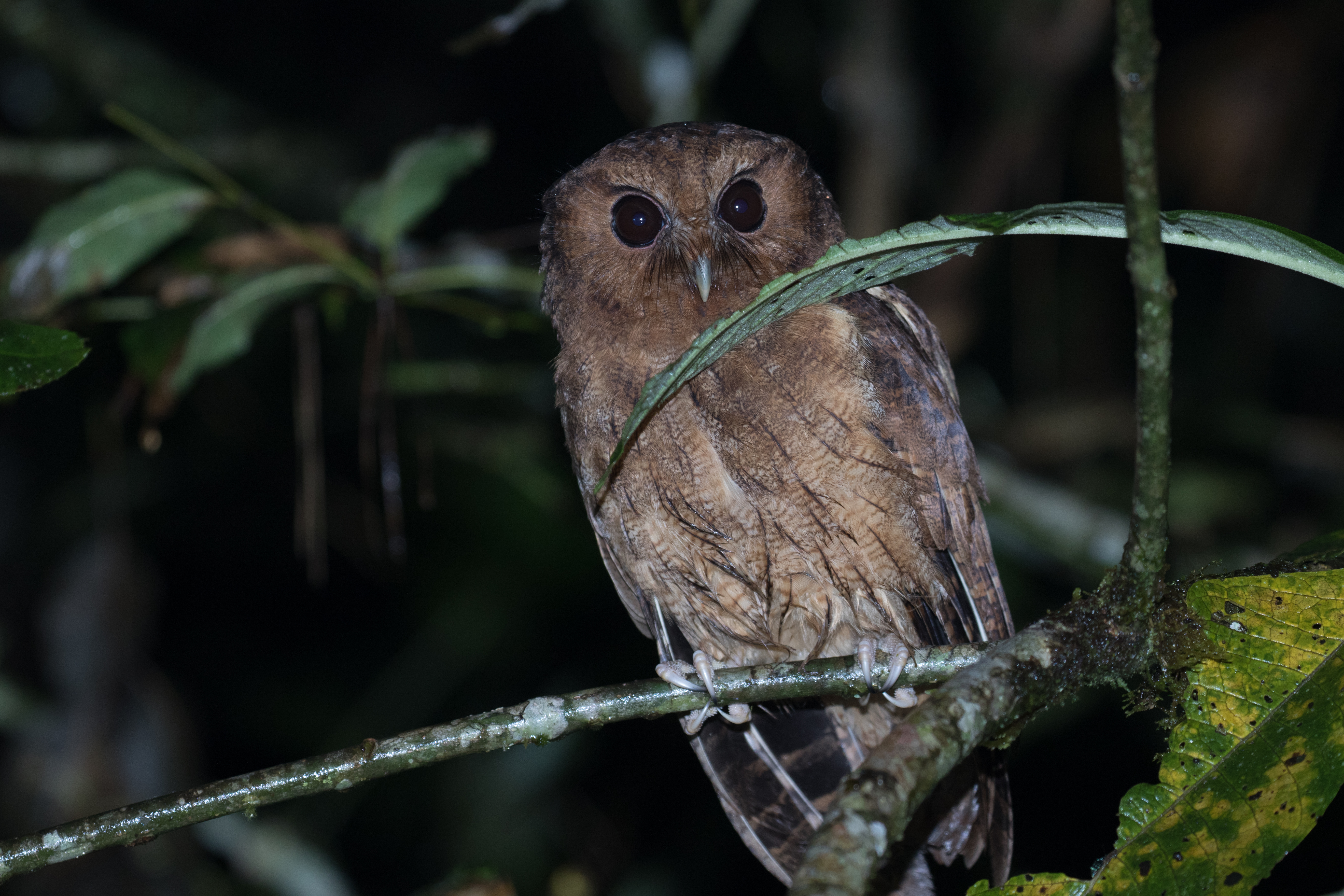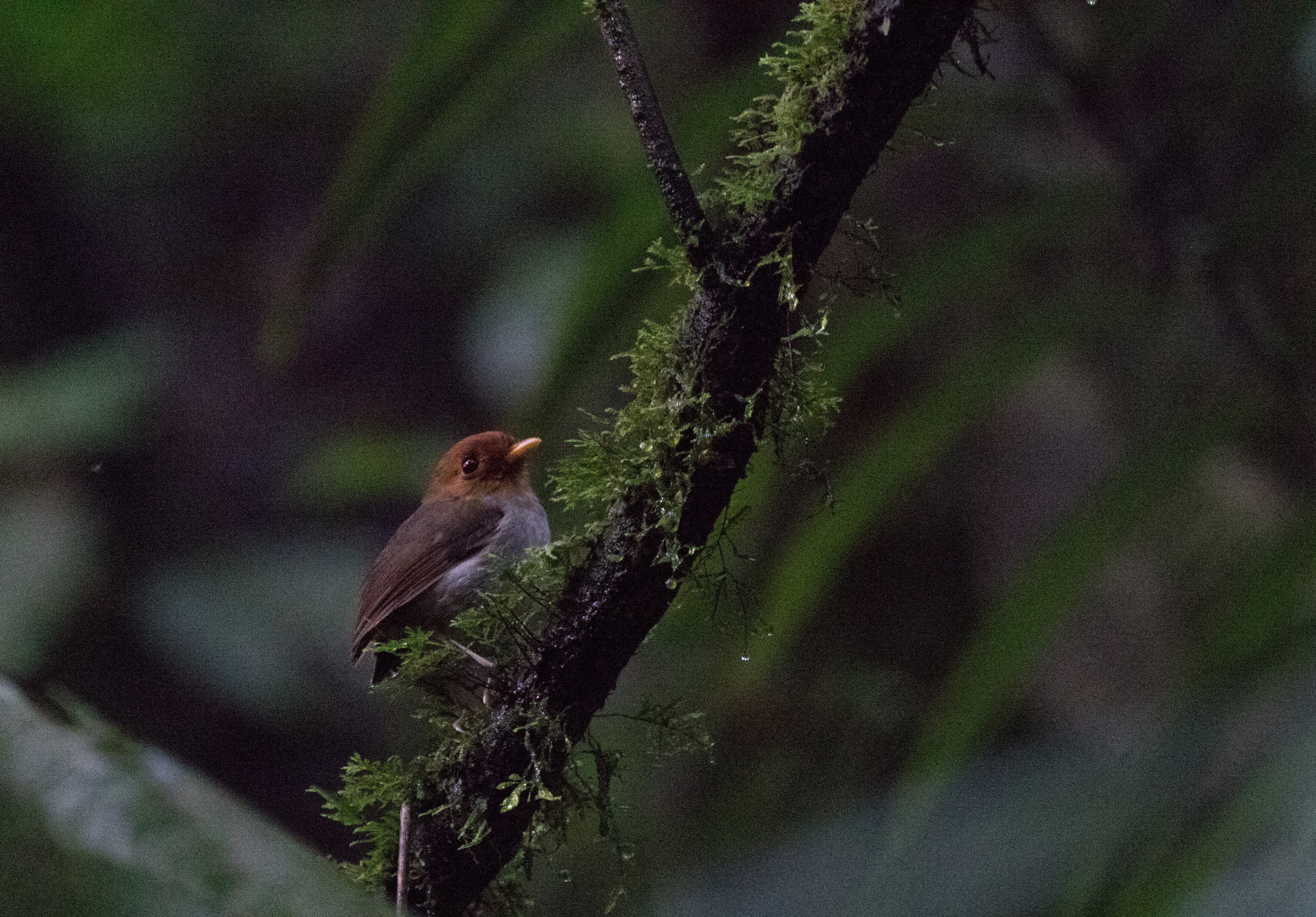 I awoke at 0300 and quickly found myself hiking along the dirt track in the direction of El Cedal. Although it would have only taken a little over an hour to hike there, I wanted to give myself plenty of time to look for Colombian Screech-Owl along the way. My first few stops were unproductive, but finally at the 2.7 km mark, I got my first response from a Colombian Screech-Owl. Luckily the owl came in very close and I was able to find it perched about 10 yards away and only about 3 meters off the ground. Unfortunately it flew off quickly and I was unable to get any pictures. Happy that I had seen my first target I continued on and reached El Cedal at about 0430. With some time to spare before light, I quickly found another Colombian Screech-Owl and this time I was able to get a few shots and recordings before it disappeared back into the night. Knowing that my main target, Hooded Antpitta, only sings briefly in the earliest part of the morning, I left the screech-owl and headed to a spot recommended by a Belgium couple that I had met at Rio Blanco two weeks earlier.