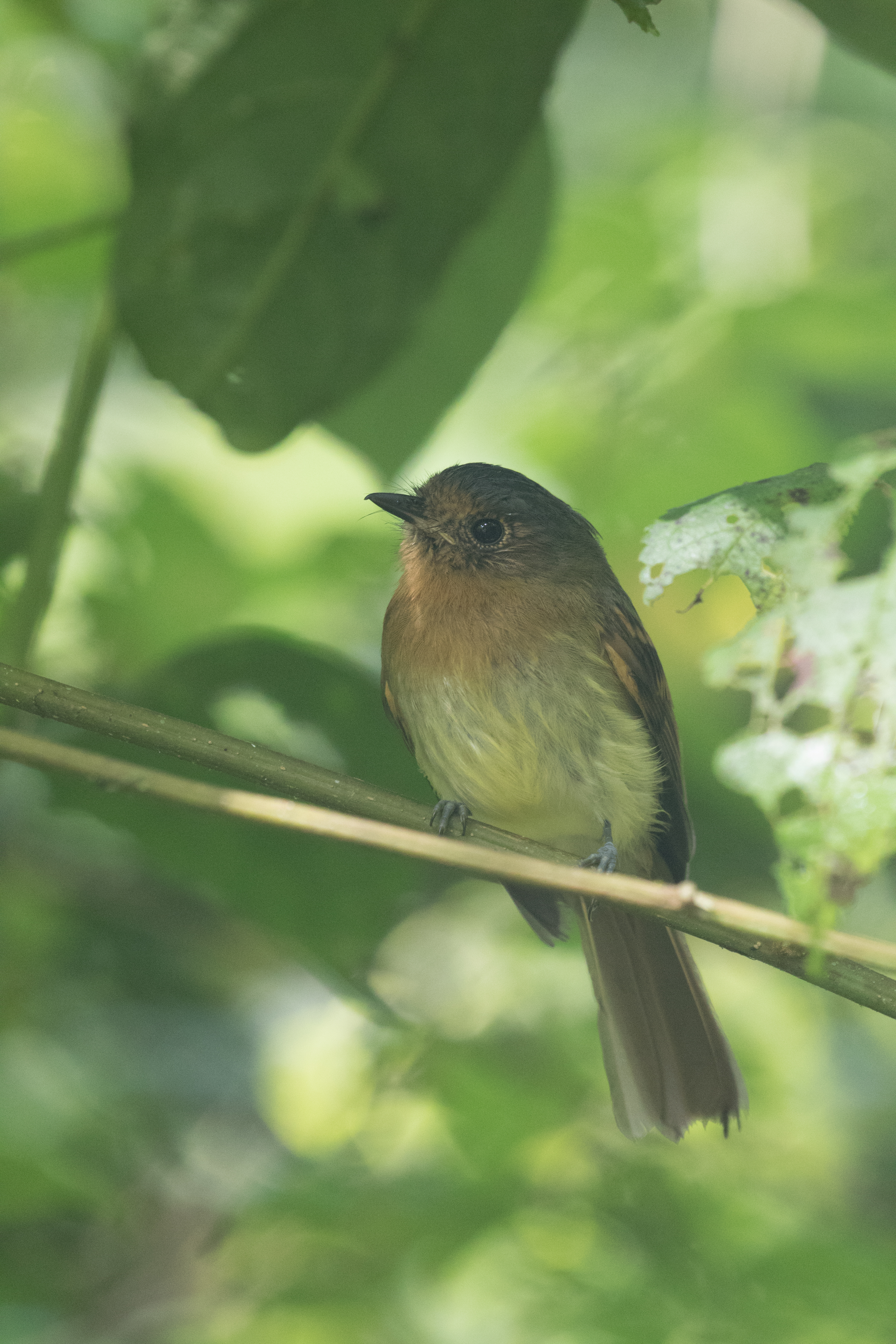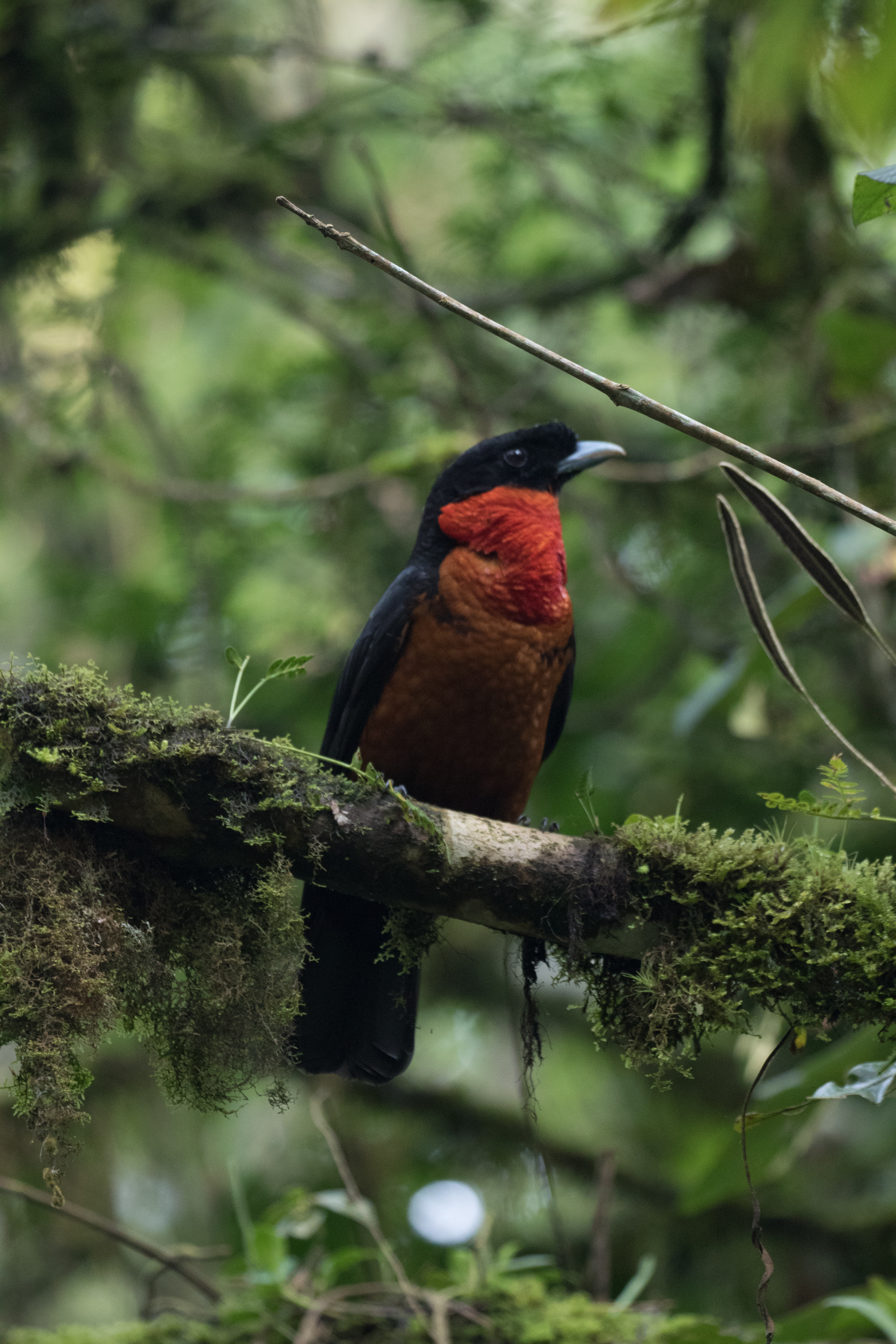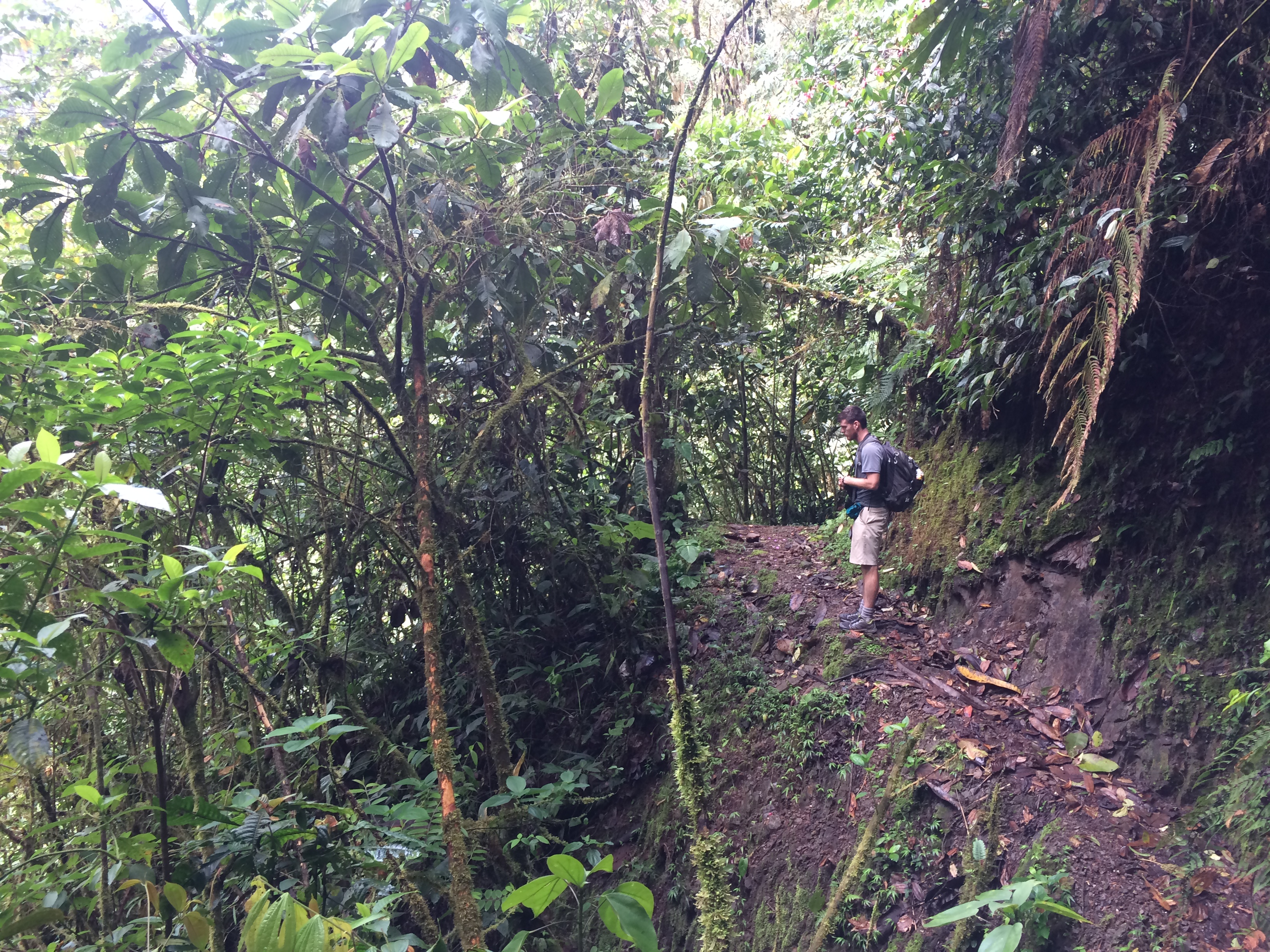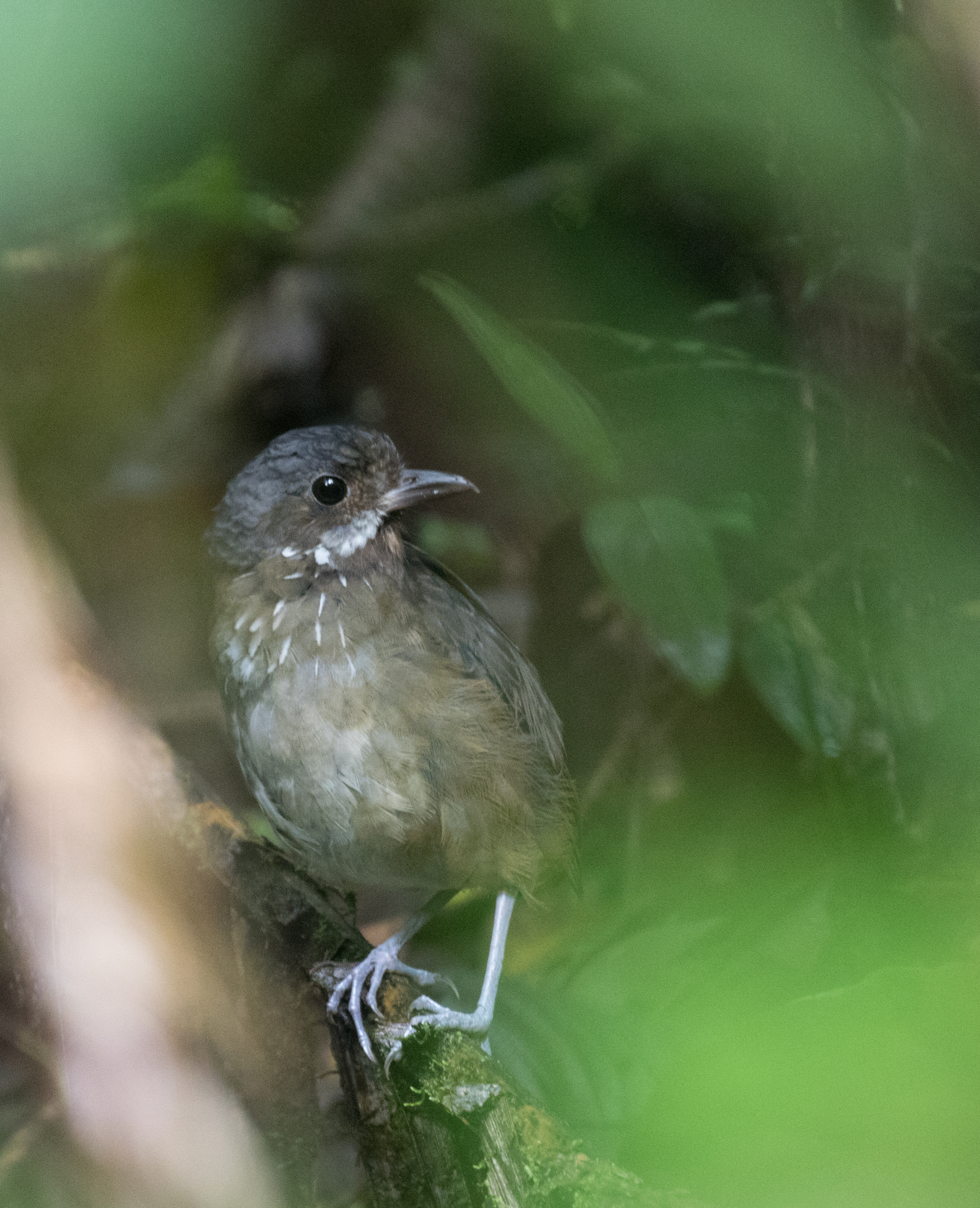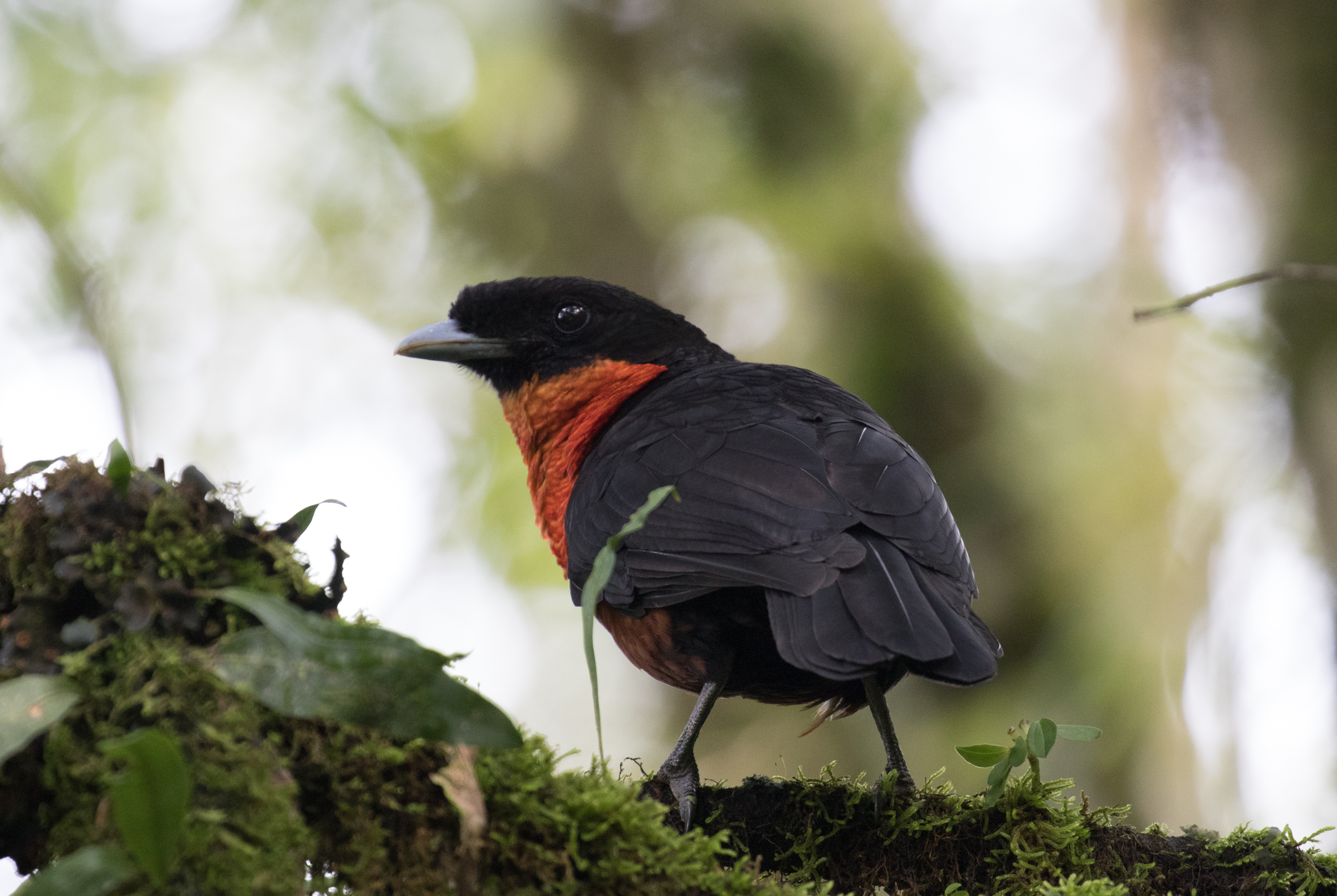 Just as it began to get light, a Hooded Antpitta started to call from the steep hillside in front of me. I was excited that I had quickly found my main target, but knew actually seeing the bird would be much more difficult. I climbed up the hillside and began an hour long game of cat and mouse as I attempted to follow the antpitta along the hillside trying to catch a glimpse. The bird was moving around a lot, and with it still being very dark within the forest, it was impossible to see it. As the lighting got better, I quietly made my way close to the bird and began to play the tape to see if it would come in. After about ten minutes of waiting, I was unable to get a response, so decided to stand up. Luckily, just as I stood, I caught a glimpse of a leaf moving in the distance. Just below the left sat an adult Hooded Antpitta! I was able to follow the bird for about 10 minutes and watch it feed by sailieing out to glean leaves, often returning to the same perch. Very cool!