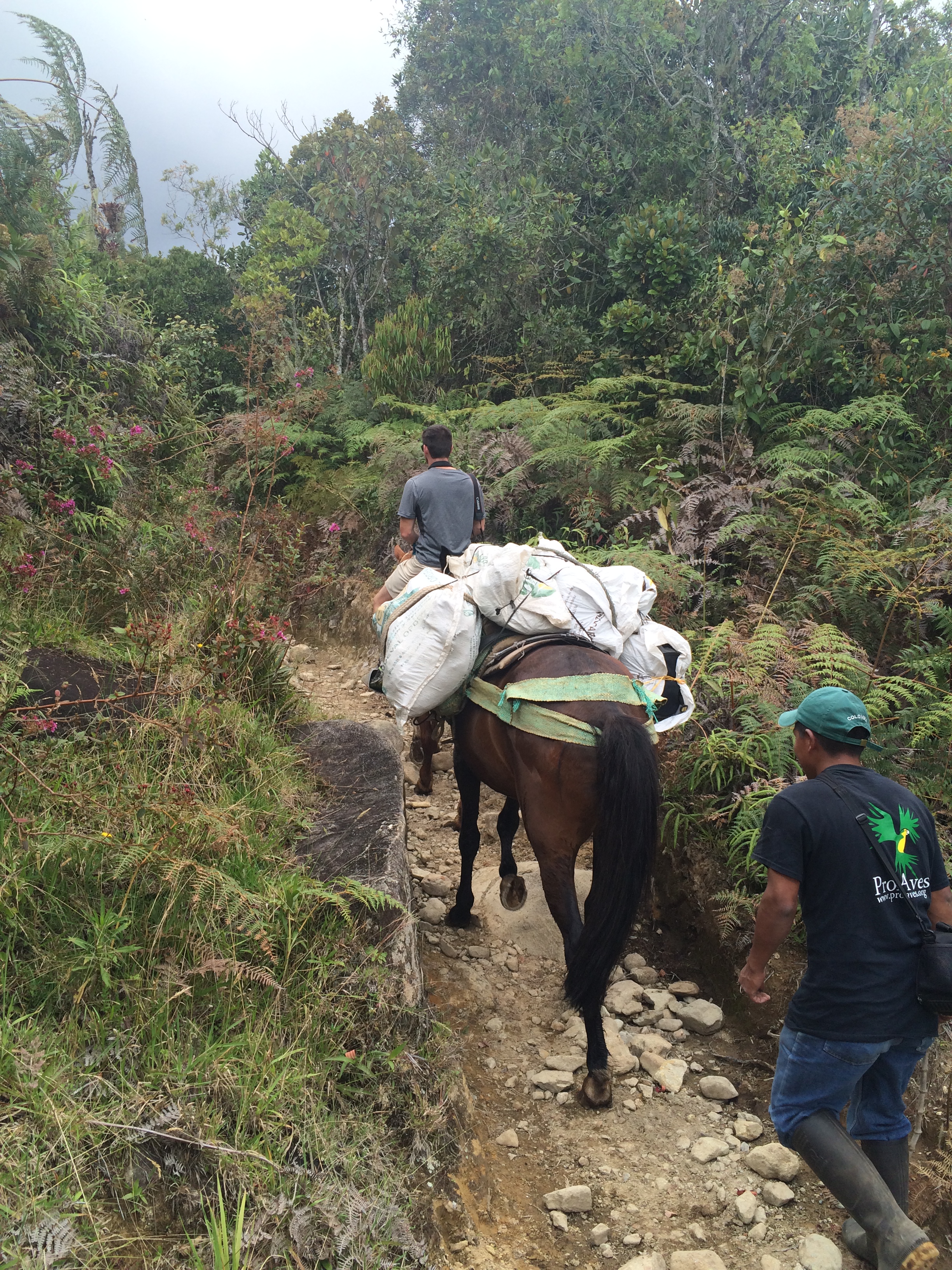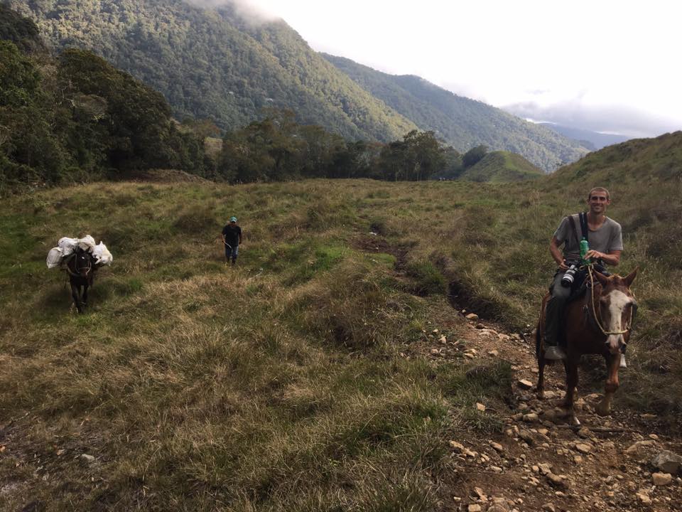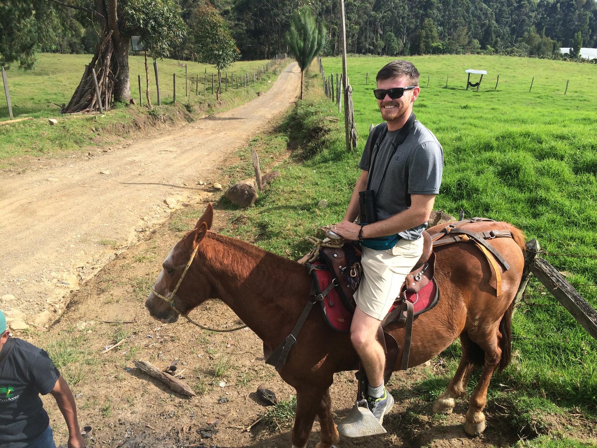 We arrived in Urrao shortly before 1400 and quickly made our way to a nearby meetup point where our guide was waiting with two horses. We loaded our gear on to the first horse and then started off on the hour-long hike to the lodge. Alex started off riding the horse and eventually I took over. It had probably been 15 years since I had last riden a horse, but it was a nice change of pace to get a ride up the steep hillside instead of walking! We arrived at the lodge just before dark (and just before a large rain storm).