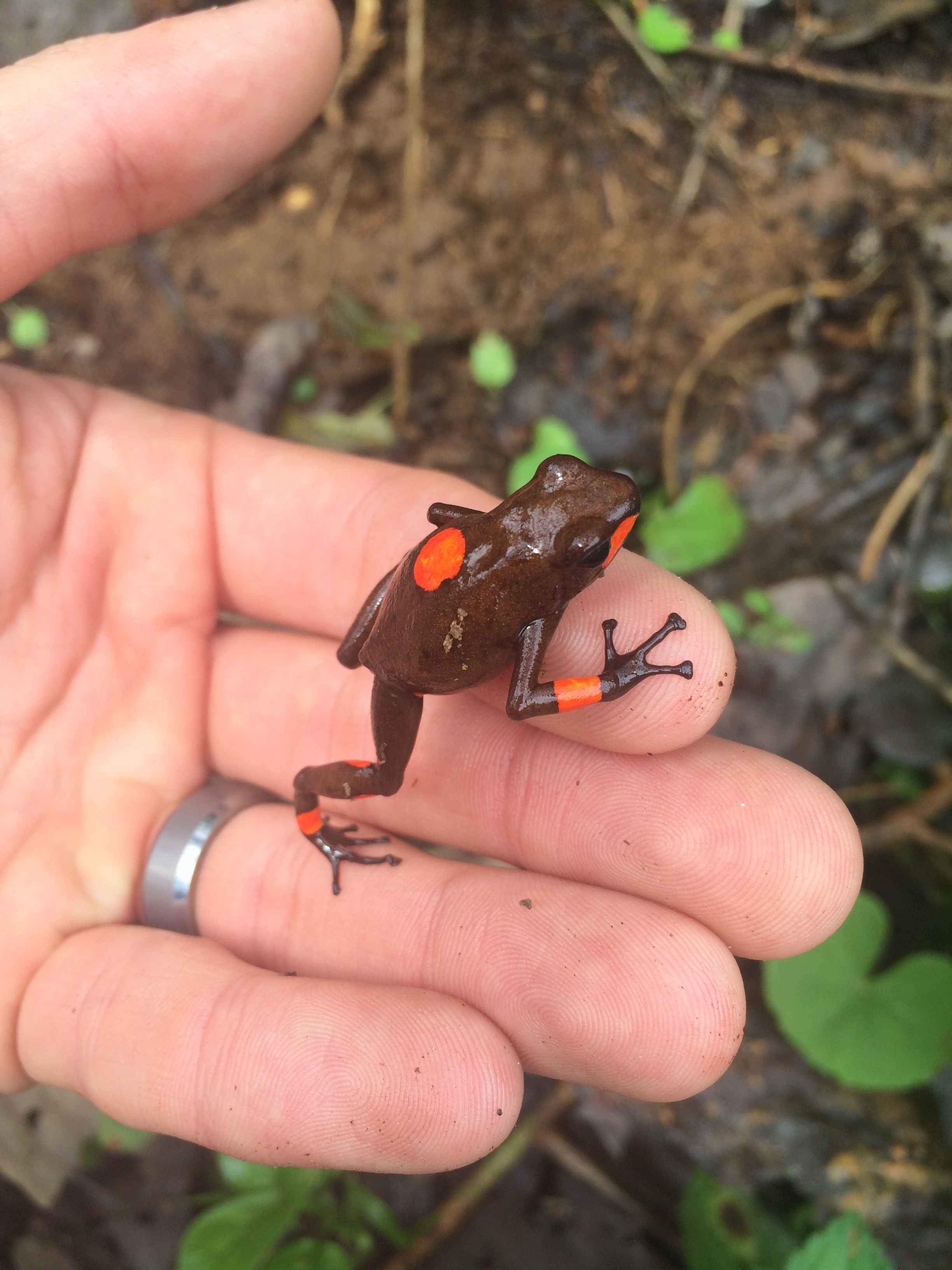 We were running short on time due to the rain (we only planned to spend a half day in the area) but we still wanted to check out a second area called Area de Manejo Especial Etnico del Alto Amurrupa. After hiking along the river for awhile, it became apparent that we weren’t going to reach any good forest any time soon. We turned around and headed back toward the car, but before arriving, there was another trail that I thought looked promising. The guide had pointed out the trail when we first walked in, but said it was very muddy and recommended the river trail. Stephan and Claudia decided to head back to town, but I still wanted to explore a little and figure out where the good forest was so that others would have reliable information when they visited. With only an hour to bird/explore before having to meet back up with the others, the guide and I quickly headed up this steep and muddy trail. Although I got very wet (and wished I had rubber boots) it was still worthwhile checking out as this trail enters some fantastic lowland Choco forest. Unfortunately I just didn’t have the time to explore it! I did see a few cool birds including Golden-collared Manakin, Purple-throated Fruitcrows, and more Baudo Oropendolas. The guide also caught this really cool poinson dart frog! After a quick hour of exploring the area, we headed back to town where I took a much needed shower and then the three of us started the long drive towards Pereria. When we arrived in Pereria I said goodbye to Stephan and Claudia for the last time and caught a bus to Bogota while they headed towards Santa Rose de Cabal.