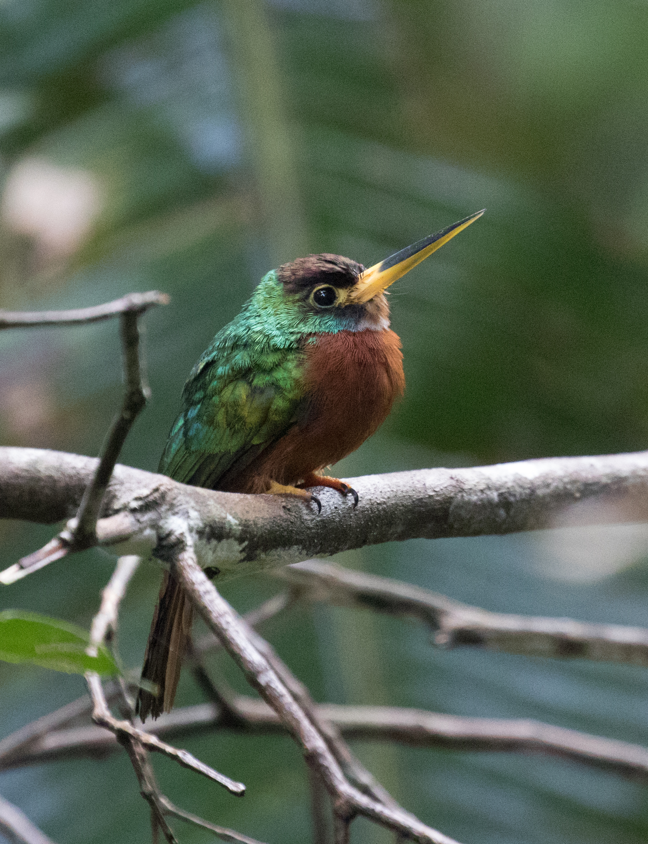 The next day, May 9th, we woke up super early to make our way to Pueblo Nuevo, a relatively new “birding spot” for Mitu. Originally birders would make the 2 hour journey to MCH, a hydro-electric plant, to bird terra firme habitat, meaning dry land that does not get flooded by the Amazon or its tributaries. All of the birds from MCH can also be found at Pueblo Nuevo which is closer and only requires a 1 hour drive to get there. We left our hotel at 4AM and after one hour, arrived at our destination. We walked along the trail and soon had excellent views of Chestnut-crested Antbird with its seemingly large eyes this bird was a favorite for sure! We spent the morning out on the trail searching amongst the vibrant green on all sides of us and other highlights from the morning included Tawney-tufted Toucanet, Scarlet Macaw, Great Jacamar, Yellow-throated Antwren, and Rufous-capped Antthursh. On the walk back I flushed two Great Tinamous and was able to watch them as they walked away. With rain threatening, the three of us made our way to the small house near the entrance of the trail to wait out the downpour. It continued to rain but Ross and Jon decided to go back into the forest. I wisely stayed behind as they didn’t find a single new bird. We opted to leave Pueblo Nuevo relatively early and make our way back to town as the rain didn’t seem to be letting up. Oddly, this single afternoon of birding was the only time we lost due to rain for the trip.