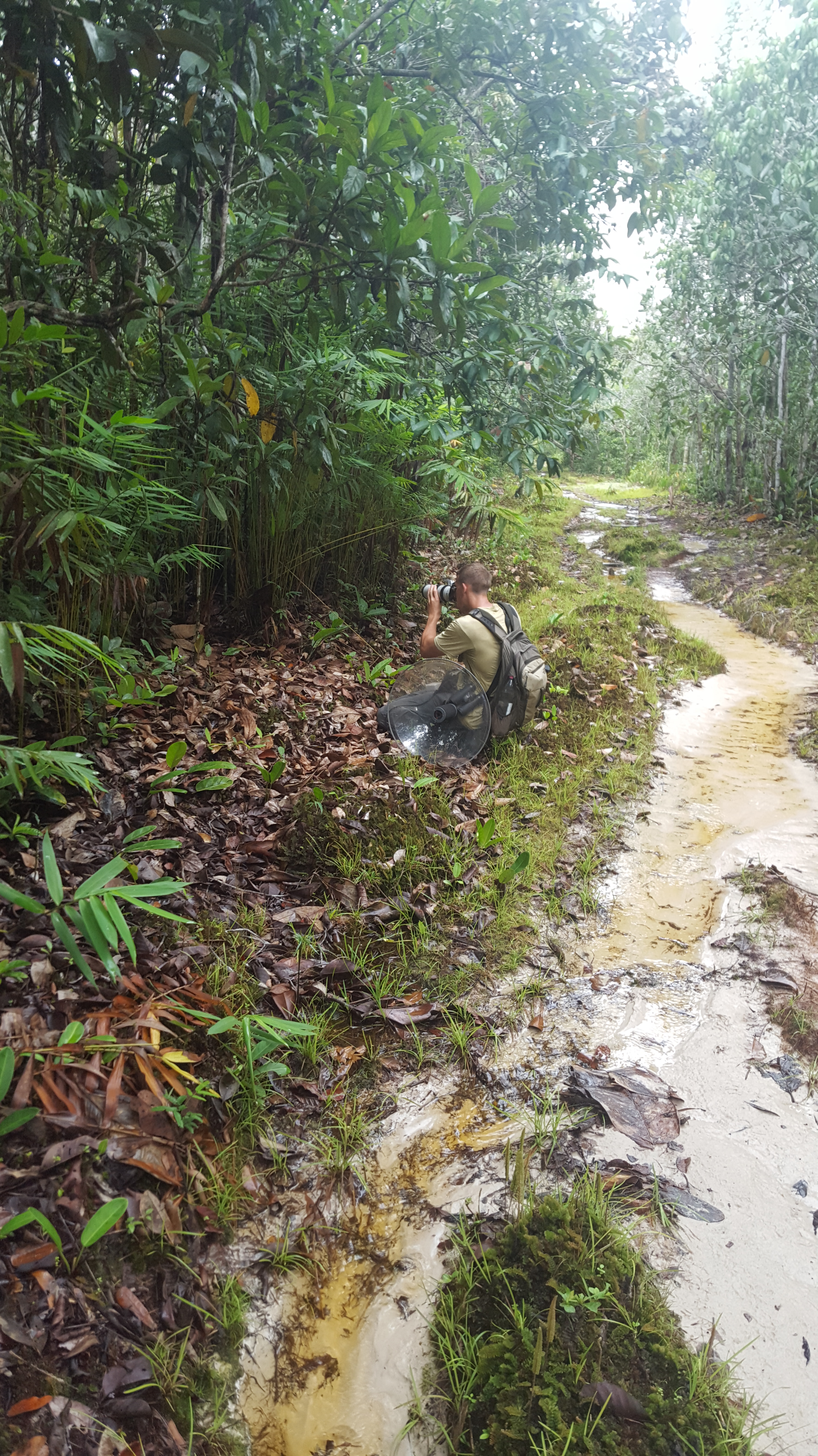 After we birded the bridge we crossed over a flooded section with a small canoe as the prior bridge had was no longer in place, and continued walking a white-sand trail. If there ever was a day to have rubber boots, today was it! We wouldn’t have gotten very far at all without our rubber boots as most of the trail went through a stream and crossed through very muddy sections. We actually had to turn around after we reached a flooded section that was deeper than our boots would allow. The local guide told us we could cross if we stepped exactly where he did, but you couldn’t see where he stepped. Not wanting to fill our boots with tropical floodwater, we decided to turn back around and walk the way we had come, which was quite alright since the area was very birdy and we had already run into several bird flocks. We ran into a large flock containing Fulvous-throated Antwren twice and Ross finally got us on a Black Manakin, something he had been playing tape for for the last few days. Along a side trail we found a few Gray-bellied Antwrens that came in for a close look and also a tiny pair of Golden-crowned Spadebills that gave away their presence after Ross heard their high pitched call. The weather was overcast with a few scattered showers here and there. Each time it would rain we would take out our umbrella and when it would stop we would see a few more birds. It really was a good system. We ate lunch during one of the hardest downpours and were thankful to be sitting under a manmade structure.