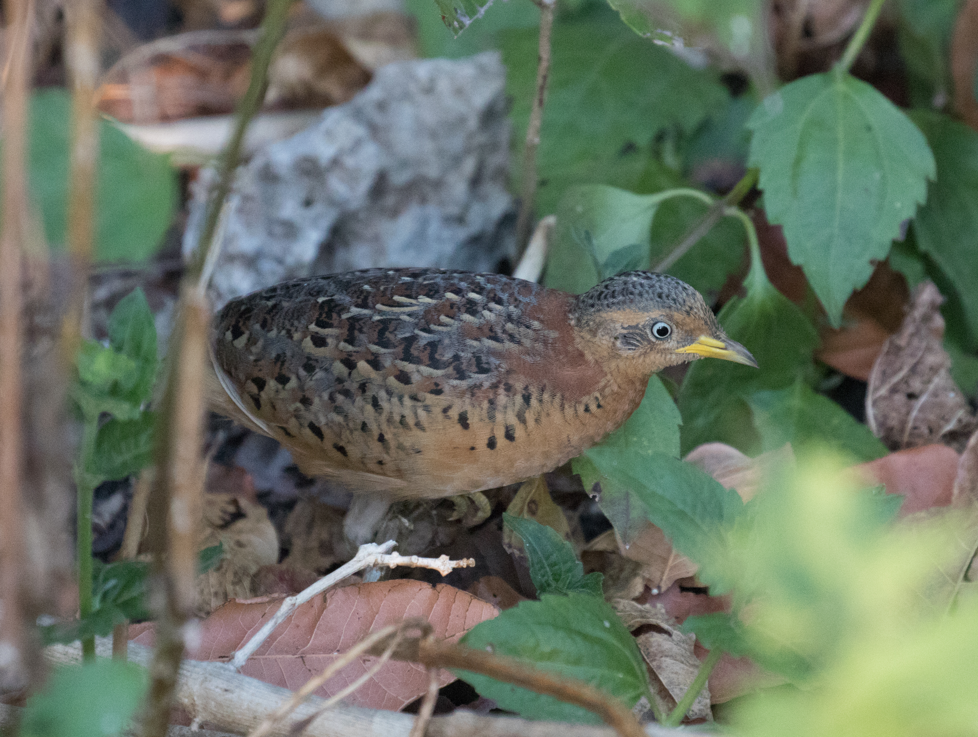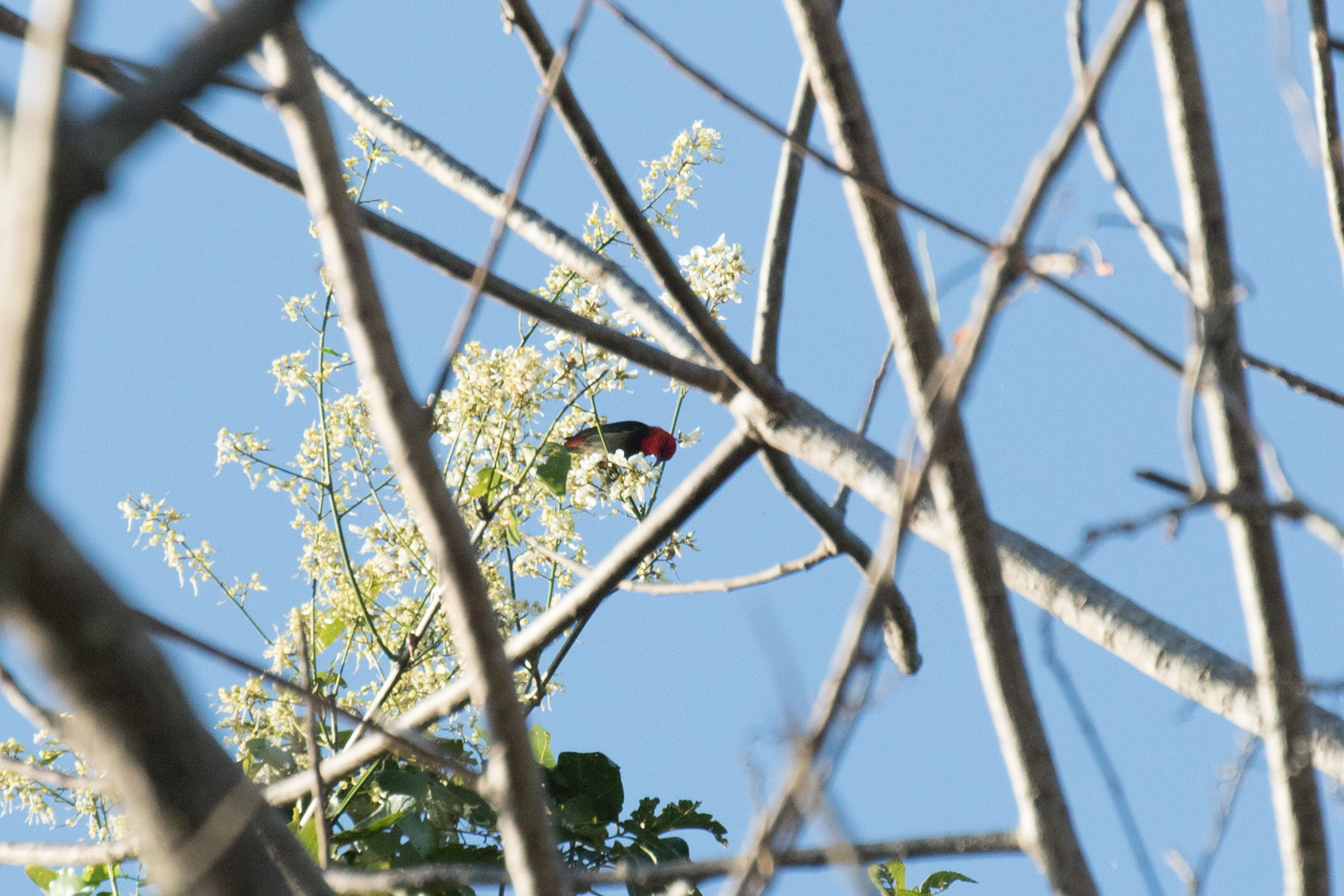 There was some minor confusion in the morning as Ren doesn’t speak much English and when we woke up and he started walking in one direction, we were under the impression that he wanted us to walk to the forest that was 7km away because that was the only forest we knew about. We still aren’t sure if that’s what his plan was or not, but we told him that the sun was going to be up soon and that if he wanted us to go to this patch of forest, he should have told us so we could have left earlier. Either way, Ross and I ended up speed walking, catching a ride on a motorbike and making it to the forest just after the sun had come up. We had two targets, a myzomela, and a leaf-warbler, both future potential splits. Technically we had three targets if you include the bird we just never seemed to be able to find, a Timor Figbird. We had a productive morning and the forest along the road where we were was extremely birdy. It didn’t take long before we had views of Rote Leaf-warbler among a flock of Ashy-bellied White-eyes. We continued walking and surprisingly came across a pair of Red-backed Buttonquails along the road which provided us with such nice views that Ross managed a photo! Unfortunately a local boy walking to school saw the bird and immediately picked up a rock to throw at it! Sad if that’s the view of the wildlife that these children have because they are the only hope the jungle has to save it. We yelled at the kids and they walked away. We scanned the lake on the opposite side of the forest and picked up a few trip birds in the form of Australian Darter, Wandering Whistling Duck and Little Grebe. Soon after we turned our attention back to scanning the birds in the forest when Ross spotted a “Rote” Scarlet-headed Myzomela eating from some white flowers at the top of a tree. It may look very similar to Suma Myzomela, but according to our book sounds entirely different. Unfortunately the bird flew away without ever calling and all we managed was a lousy photo (but great scope views!).
