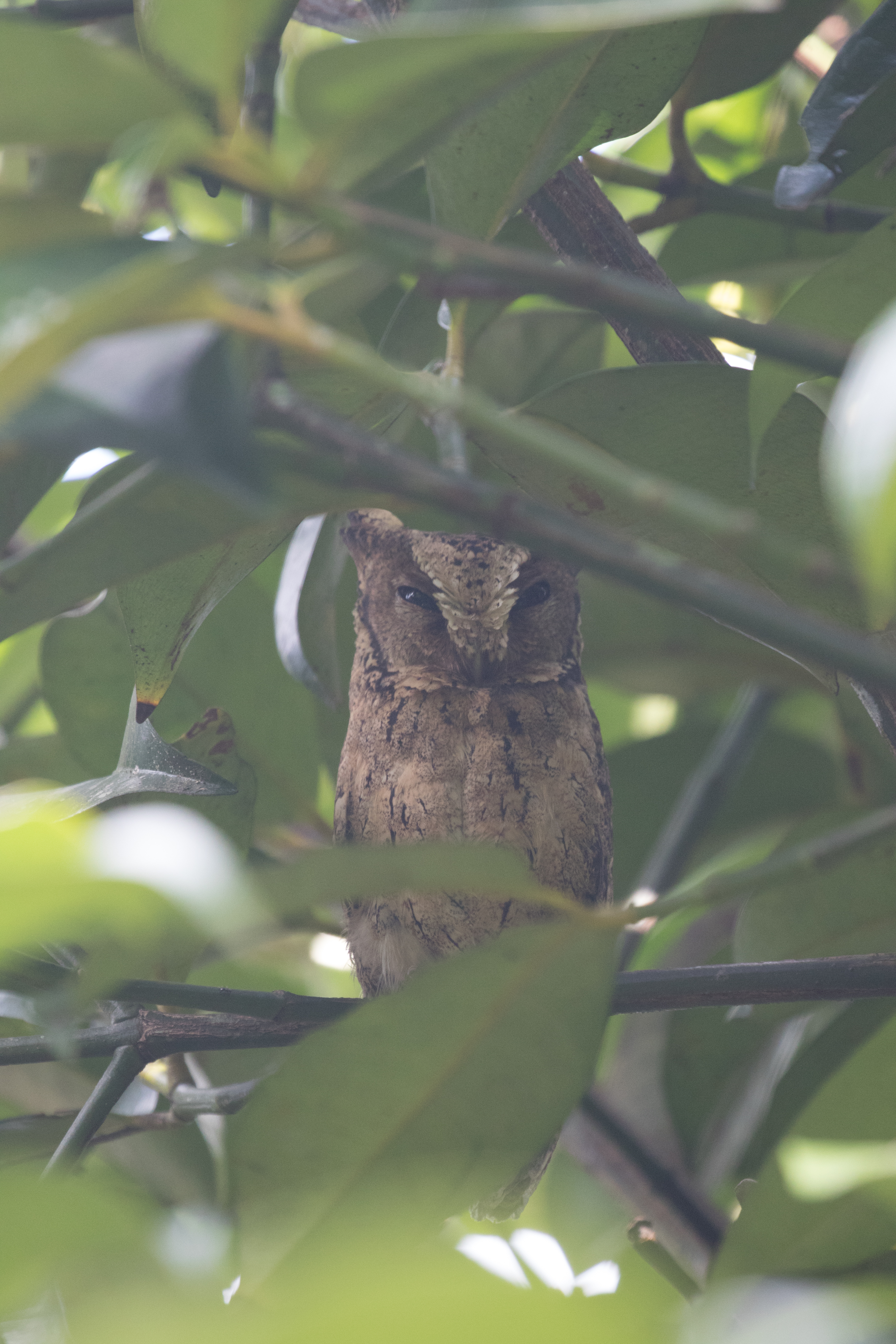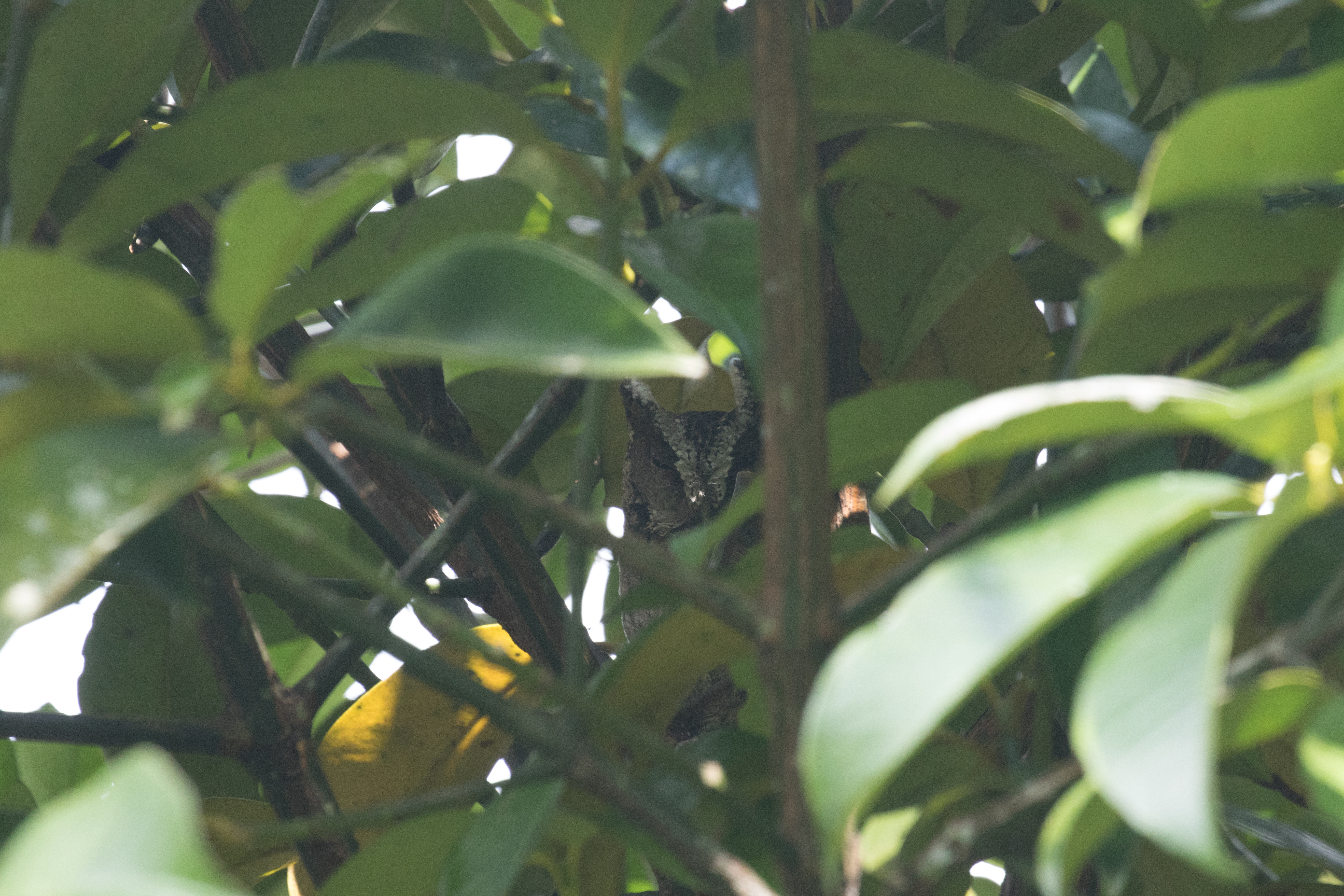 We proceeded to drive to another location, this time back into the forest along a creek bed to search for Rufous-backed Dwarf-Kingfisher. Perhaps this is where having some idea of birding locations would have been helpful because our route for the day was fairly haphazard. We shouldn’t have spent precious morning time scanning saltpans because those birds would still be there in the heat of the day when forest birds were more likely to be quiet. Despite this, we walked along the trail and soon had an extremely responsive Rufous-backed Dwarf Kingfisher. We didn’t spend much time along the riverbed trail and quickly got back in the car to drive to another location to search for a few other kingfishers. The drive to get to these locations was painfully slow for Ross as he watched cars zoom beside us. Finally he told the driver that it was okay to drive faster, perhaps he was driving slowly so we felt safe? Not sure, but he did pick up the pace after we told him it was okay to drive like he normally would. We arrived at a bridge location where we picked up Javan Kingfisher and Blue-eared Kingfisher. From here we went to a friend of our guide’s who is also interested in birds and does some guiding on the side. (Perhaps he would be a much cheaper option for anyone on a tight budget. I’ll include some contact details at the end of this post.) Anyway, outside of guiding, Made Surya runs a homestay and has a stakeout for a roosting pair of Sunda Scops-owls. We arrived at his homestay and lunch place and quickly were shown to a nearby tree where we had excellent views of a pair of Sunda Scops-owls sitting next to each other to roost.