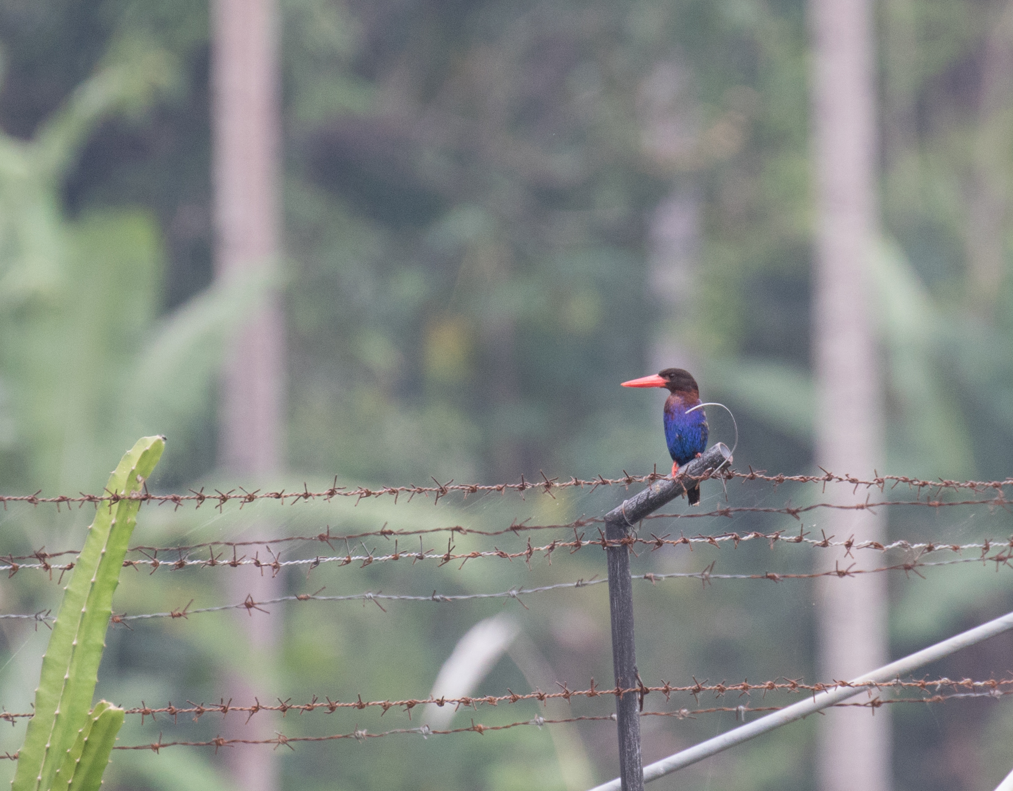 The park boasts a newly built canopy tower where you can look off into the distance while standing above the trees. We made it to the top of the canopy tower and again found another Black-wing Starling, this time perched on top of a tree. While scanning the treetops from up high, we also had views of Small Minivet and Coppersmith Barbet. We climbed back down and were walking again when we saw a pair of Javan Banded Pittas cross the trail. The three of us sat down and soon the pair responded to playback and we had excellent views as the ground birds hopped around nearby. While the colorful pitta was a highlight, and coming across a Barred Buttonquail another reward, they were by no means the most coveted remaining birds to find. The final best bird of the morning came in the form of two Java Sparrows which Ross saw fly across the road before our guide heard and identified their call. I never managed to see them, but they are extremely common in Hawaii where we used to live so I was very familiar with this species and am more than satisfied to count the introduced birds on Hawaii in my life list. Ross on the other hand much prefers to see a species in its native land and wouldn’t have been happy if he missed seeing this critically endangered species in Indonesia. (Again, just like the Bali Myna these birds are often caught and put into cages limiting the wild population immensely.)