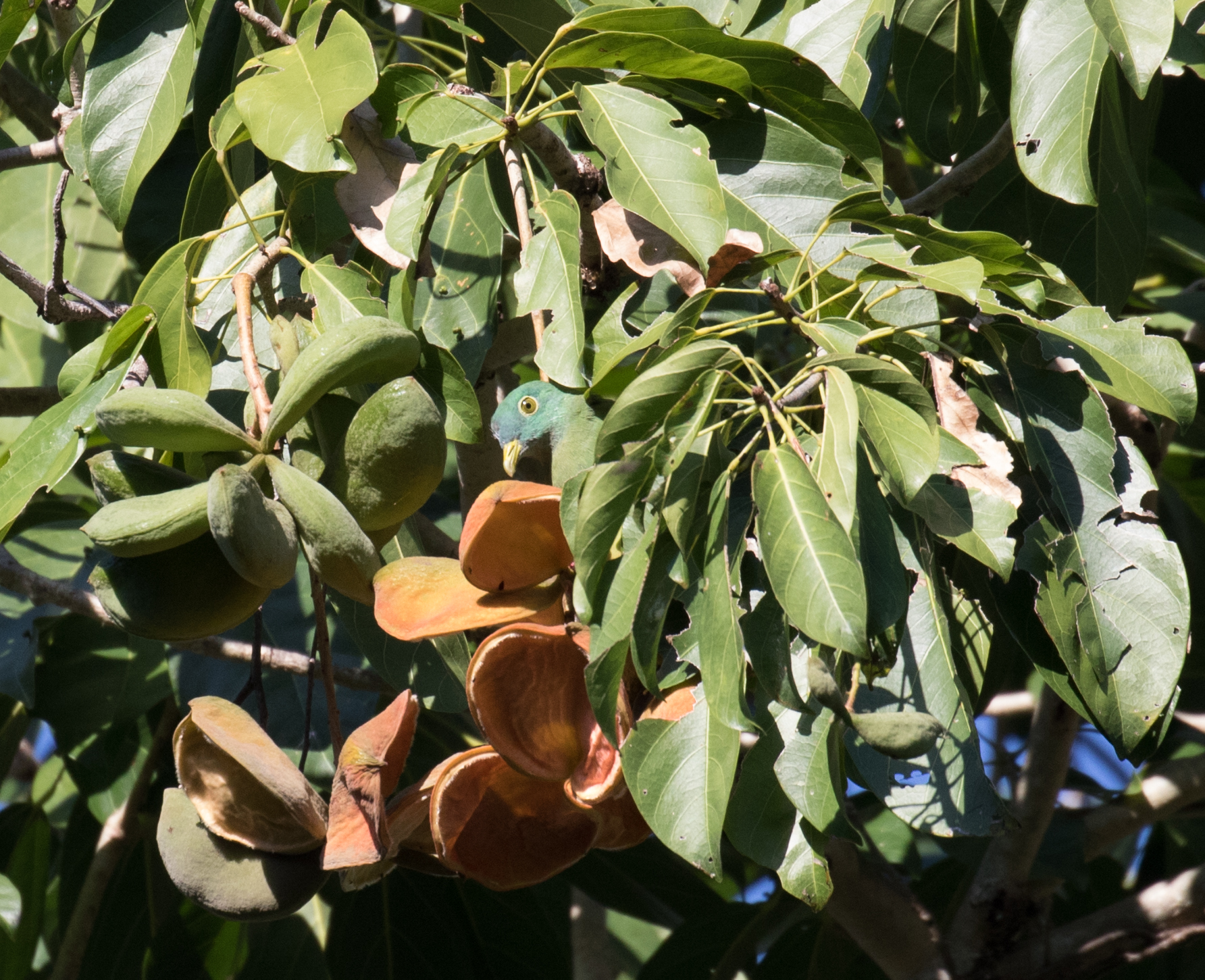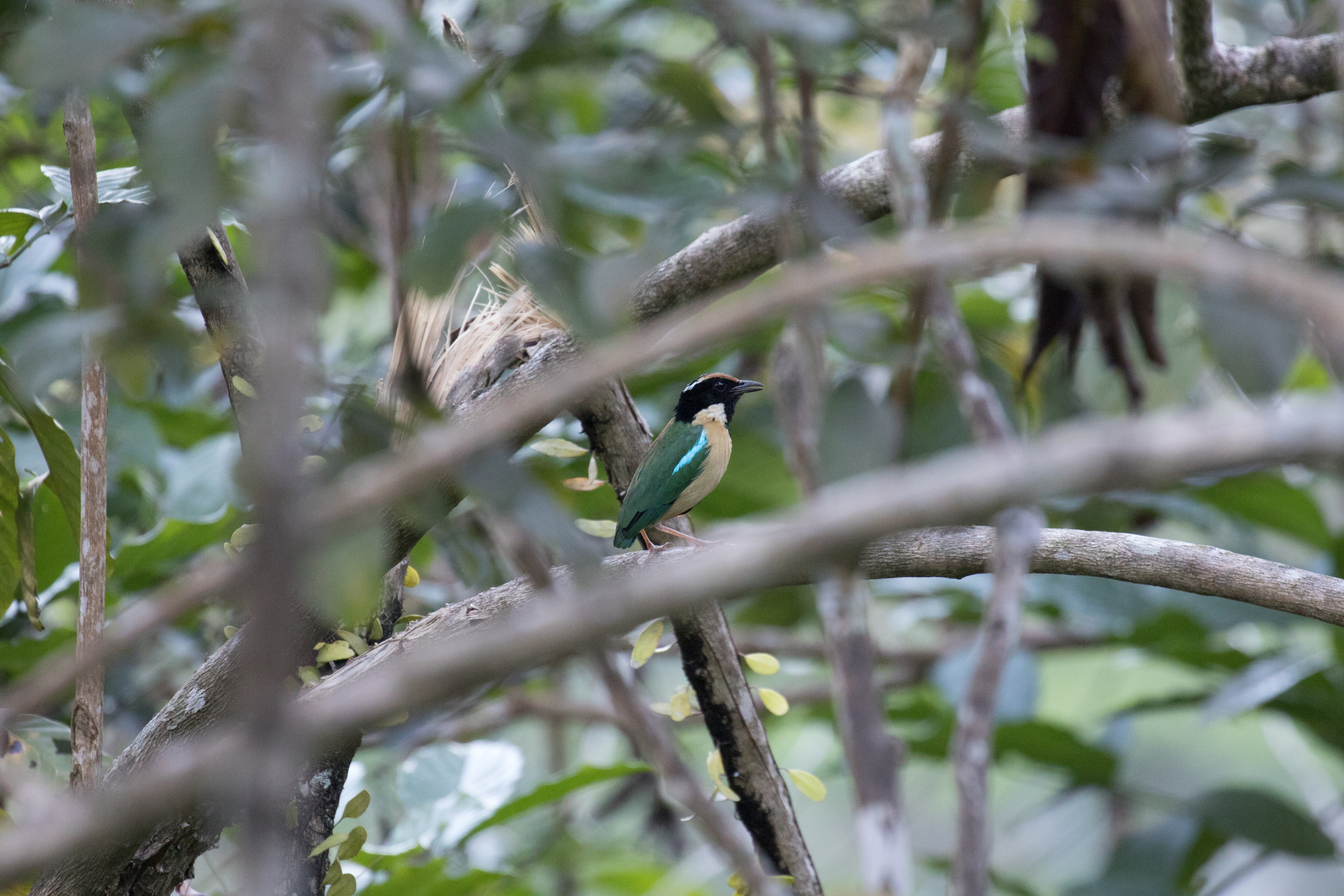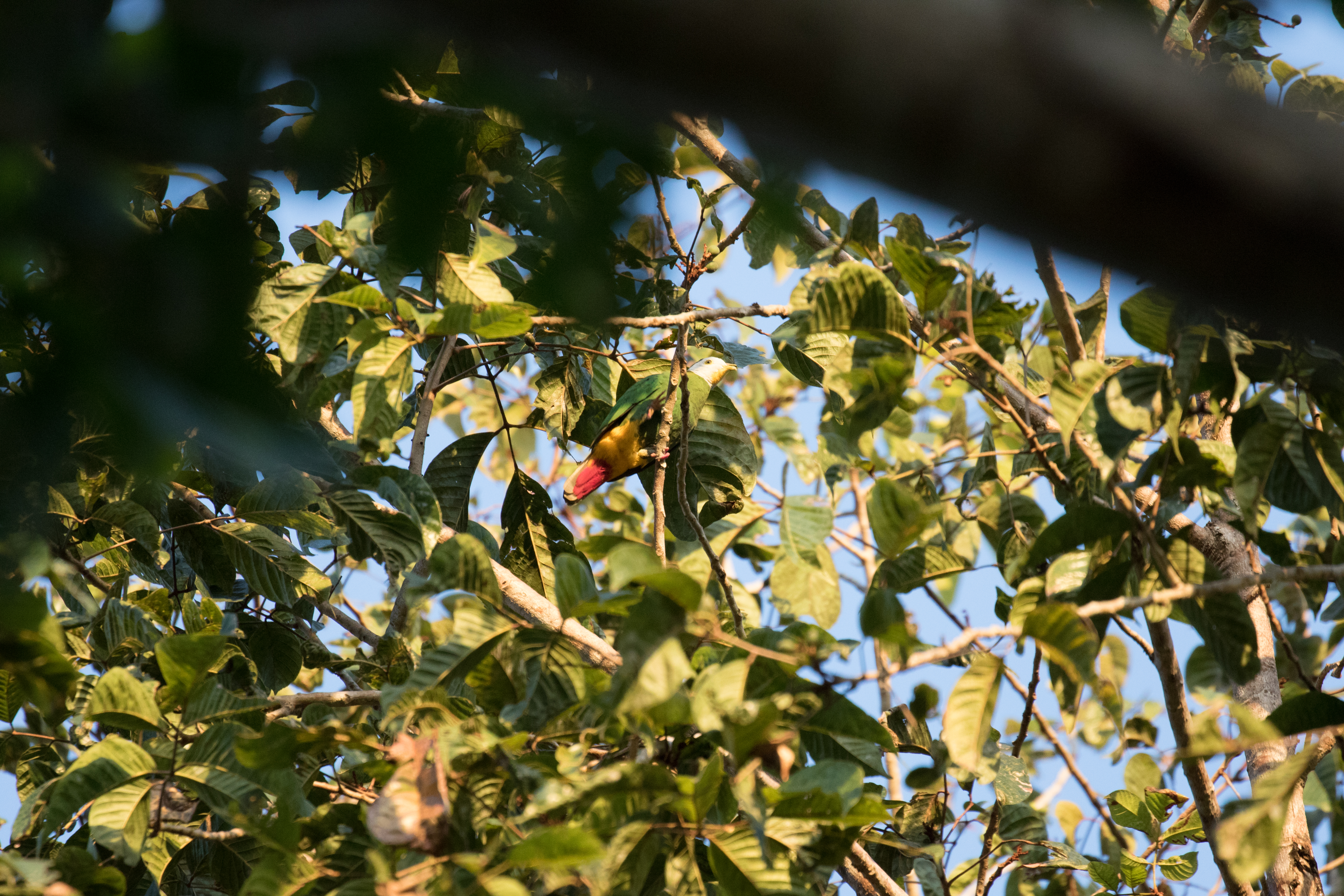 The next morning we decided to visit Pagal Road, a location known to be good for Wallace’s Hanging-parrot, one of the birds we were worried about. I probably sound like a broken record but I’ll say it again, finding parrots can be tricky. Unlike the telecom road where we maybe saw 4 motorbikes the whole day, Pagal Road is a main through-way between two towns and is traveled by a significant number of vehicles. It was a bit of a nuisance to have to worry about oncoming traffic, but that didn’t stop us from seeing the birds. Clearly they don’t mind the road running through the forest. I think we were on the road for maybe 3 minutes before we had views of a Wallace’s Hanging-parrot flying above our heads. So much for worrying about finding parrots, this one found us and found us fast! We spent the morning walking the road and picked up a few other targets such as Elegant Pitta, Flores Green-pigeon, Blyth’s Paradise-flycatcher, Thick-billed and Crested Heleias, and Golden-rumped Flowerpecker. Also, having nice looks at White-rumped Kingfisher, another Flores endemic, was a real treat. Before we left we had seen the hanging-parrot fly by a number of times and luckily Ross was even able to manage a picture (although it was a bit distant!).