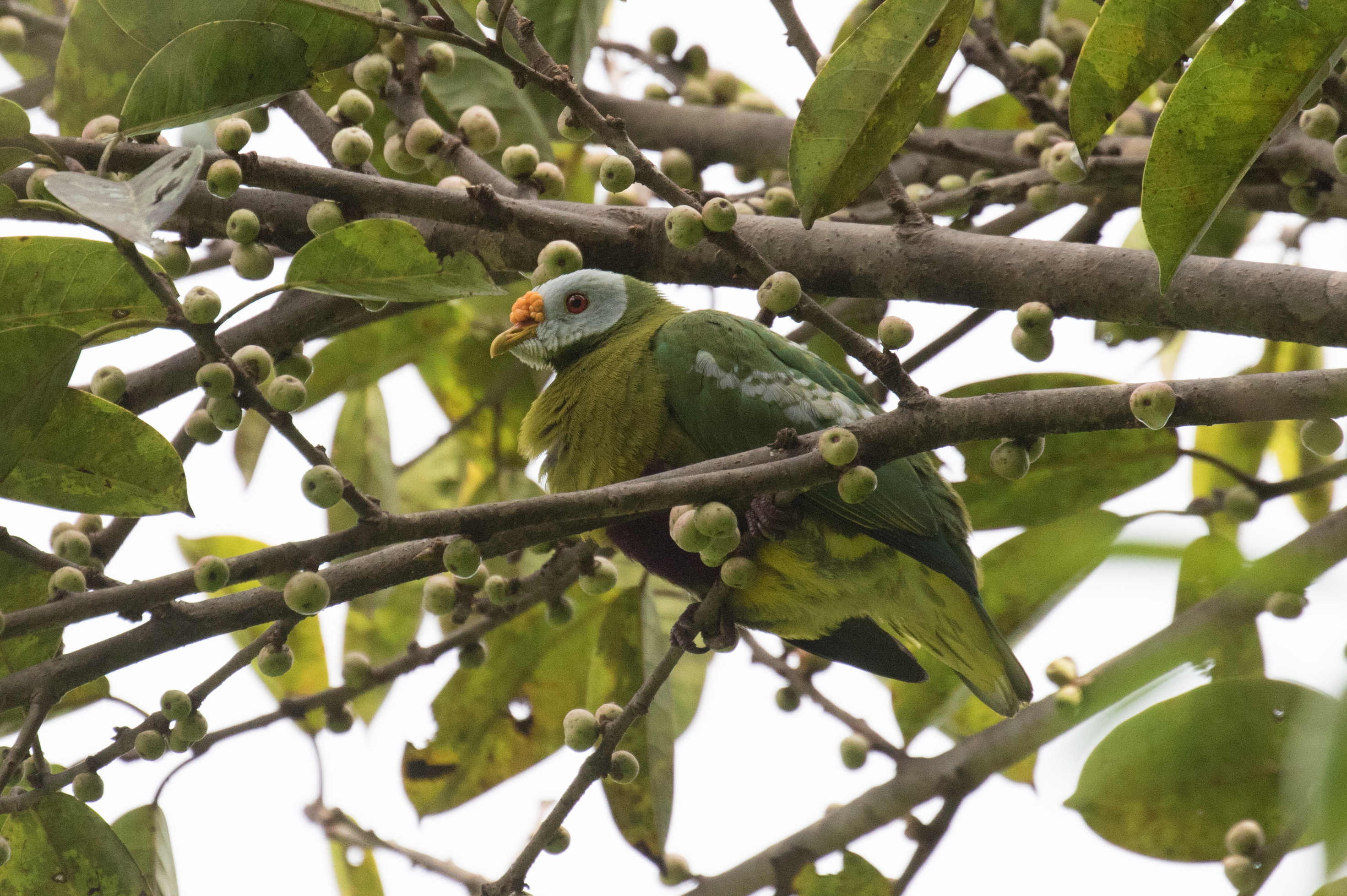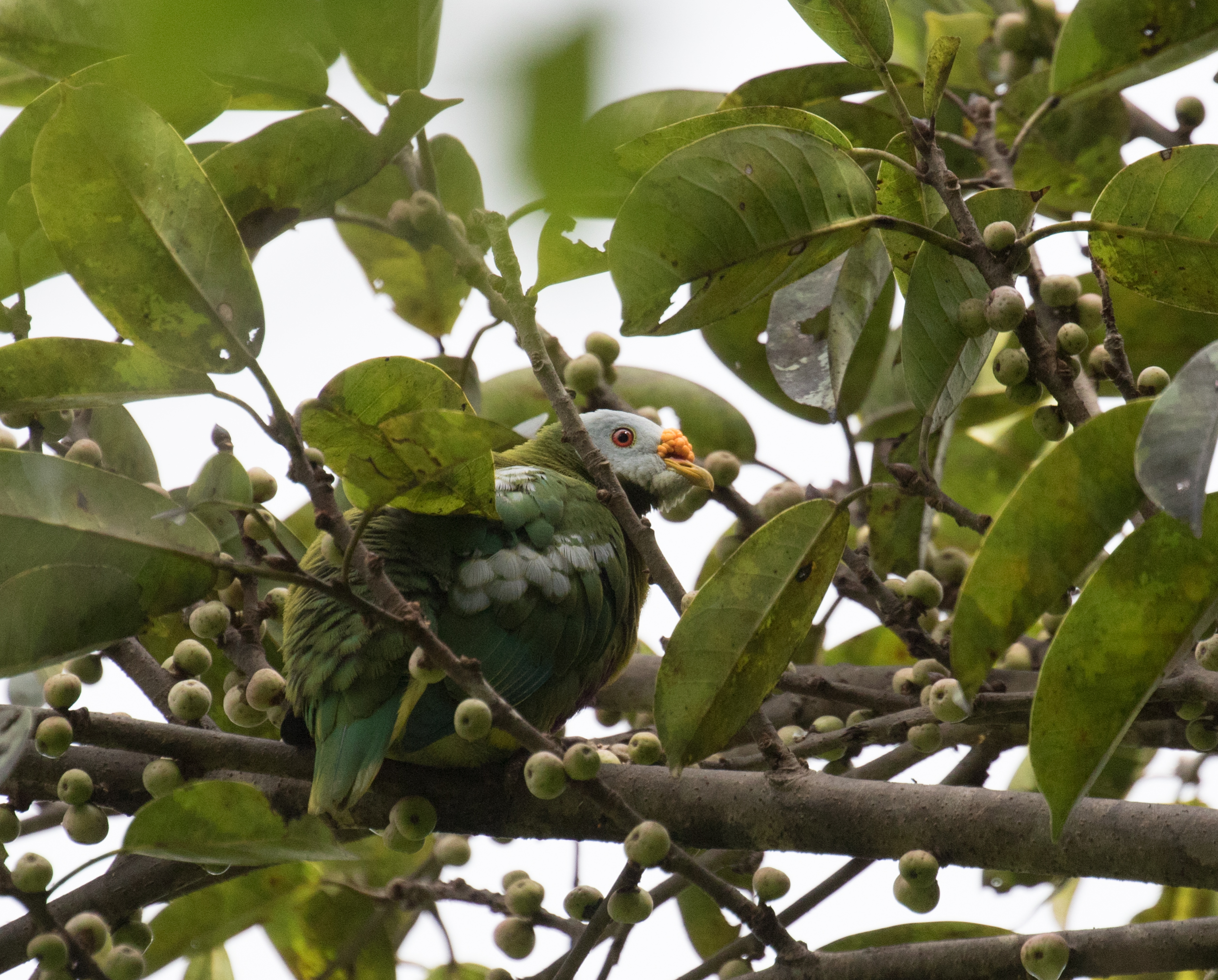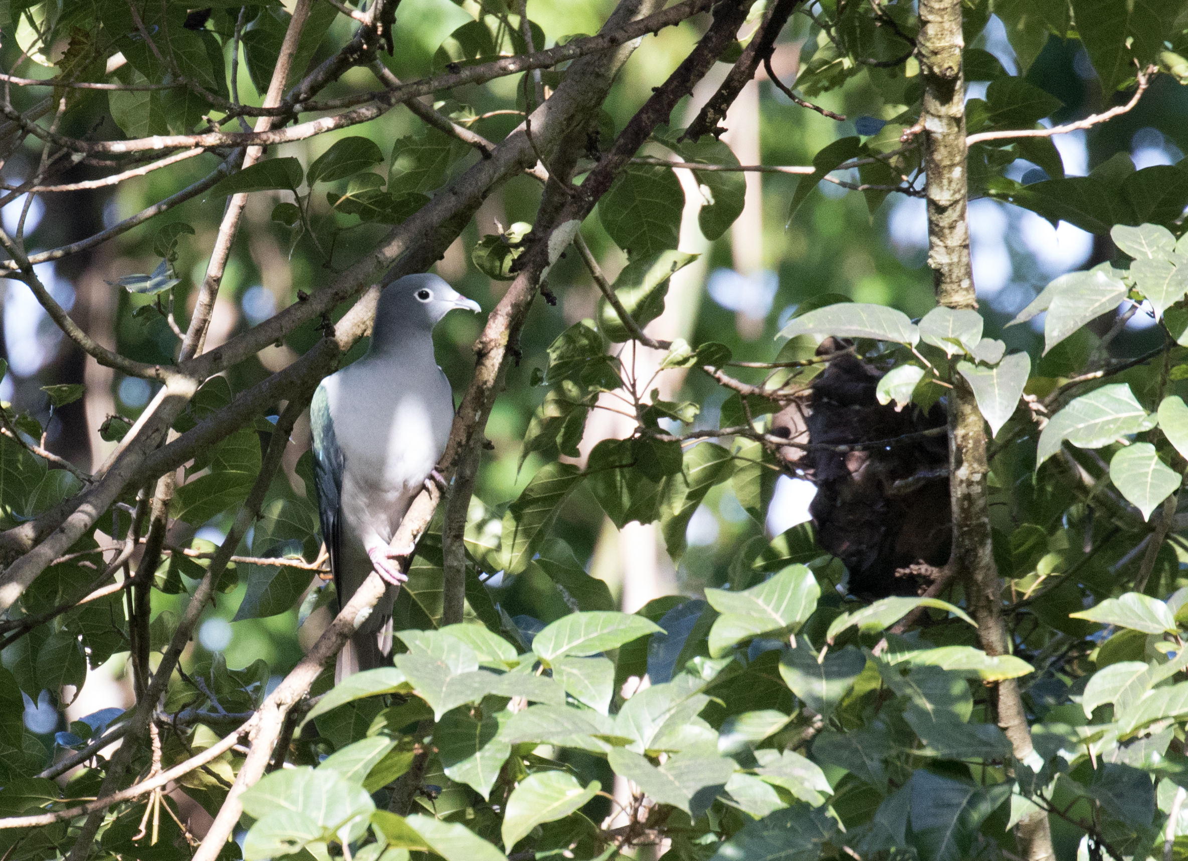 The next morning we headed to that area, but not without a little bit of a headache. People of Indonesia, while extremely nice, can agree to things they may not have any intentions on doing just to make you happy. Such was the case with the motorbike driver who told Ross he would pick us up at 4am and take us back to where he took Ross to scout the day prior. We gave him the benefit of the doubt at first as it was raining at 4am, but soon 5am rolled around and he was a no show. It was a mess. We didn’t actually find two motorbikes until 5:30am. (Word of advice for anyone planning to visit Obi, coordinate your motorbikes through the homestay as they are at least reliable.) We were up to 200m elevation when the motorbike I was on stopped working and Ross and I agreed to walk. We continued up the road following along with where we were on the topographical map but never knowing if the road would zig when we wanted it to zag. We made it as high as 400m elevation before topping off. The morning was unusually quiet and we didn’t hear any of our three main targets but did have views of Obi Paradise Crow, Scaled Lory, and Ross’s third (and my first) Obi Myzomela of the trip, a bird that is supposed to be rather difficult to find on Obi, certainly known to be trickier than the other three high-elevation species we were looking for. There was a Y in the road so we decided to hike back down and see if going the other way would take us up to the other mountain in the area. We walked for a ways up the valley before deciding it was just too far to go before we would even begin climbing in elevation again. We didn’t have the time to walk across the valley, up a mountain, do some birding and get back before the afternoon downpour that we’d come to expect so we started to walk back out. I had just finished complaining to Ross that I was going to dip Carunculated Fruit-dove when we flushed a dove out of a tree and into a nearby one. Unfortunately it was just a Black-naped Fruit-Dove, and not the one I was looking for. But thanks to it flushing we decided to spend some time in the area and before long noticed that a different tree in the back looked like it was fruiting and might have a few visitors. We walked up close and there it was, a Carunculated Fruit-dove with its namesake orange fleshy knobs at the base of the bill easily visible as the bird perched right in the open for us to see! We heard a few little calls but Ross was under the impression that the species was mute based on some of the information he had, so he had moved on to focus on photographing the silly-looking birds. I wasn’t convinced the species was mute so I was setting up the recording gear when I heard Ross tell me to bring him the stuff. Lucky for him it was already set up. He managed a few top-notch recordings of the low-pitched purr/growl they were making and a few photos when we decided to get a ride on the next available vehicle out. That vehicle turned out to be a large truck transporting coconuts. It got the job done and we made it back to the hotel just as the rain started. It really wasn’t raining like it had the past few days, but we were a bit annoyed so we opted to stay in and catch up on some rest.
