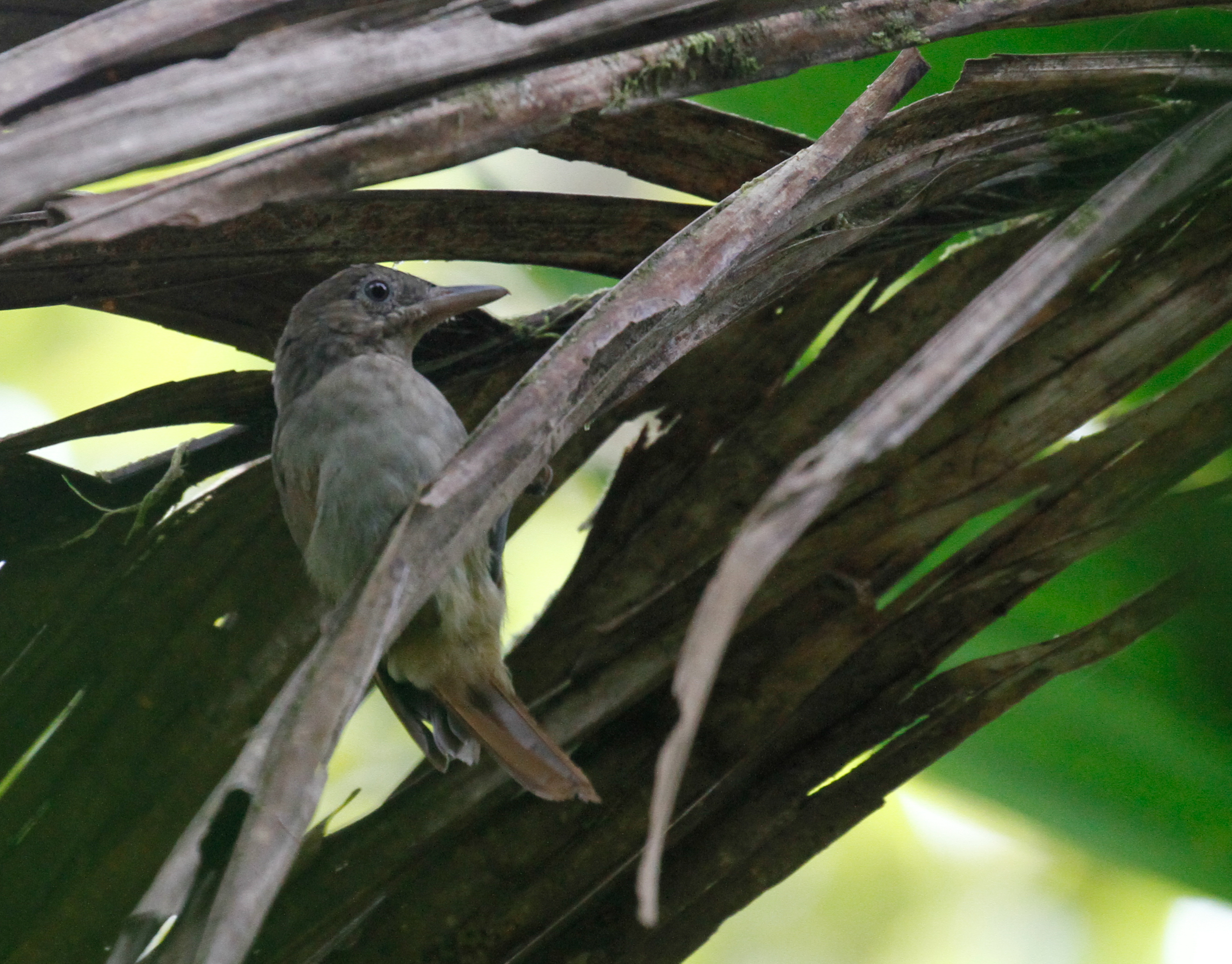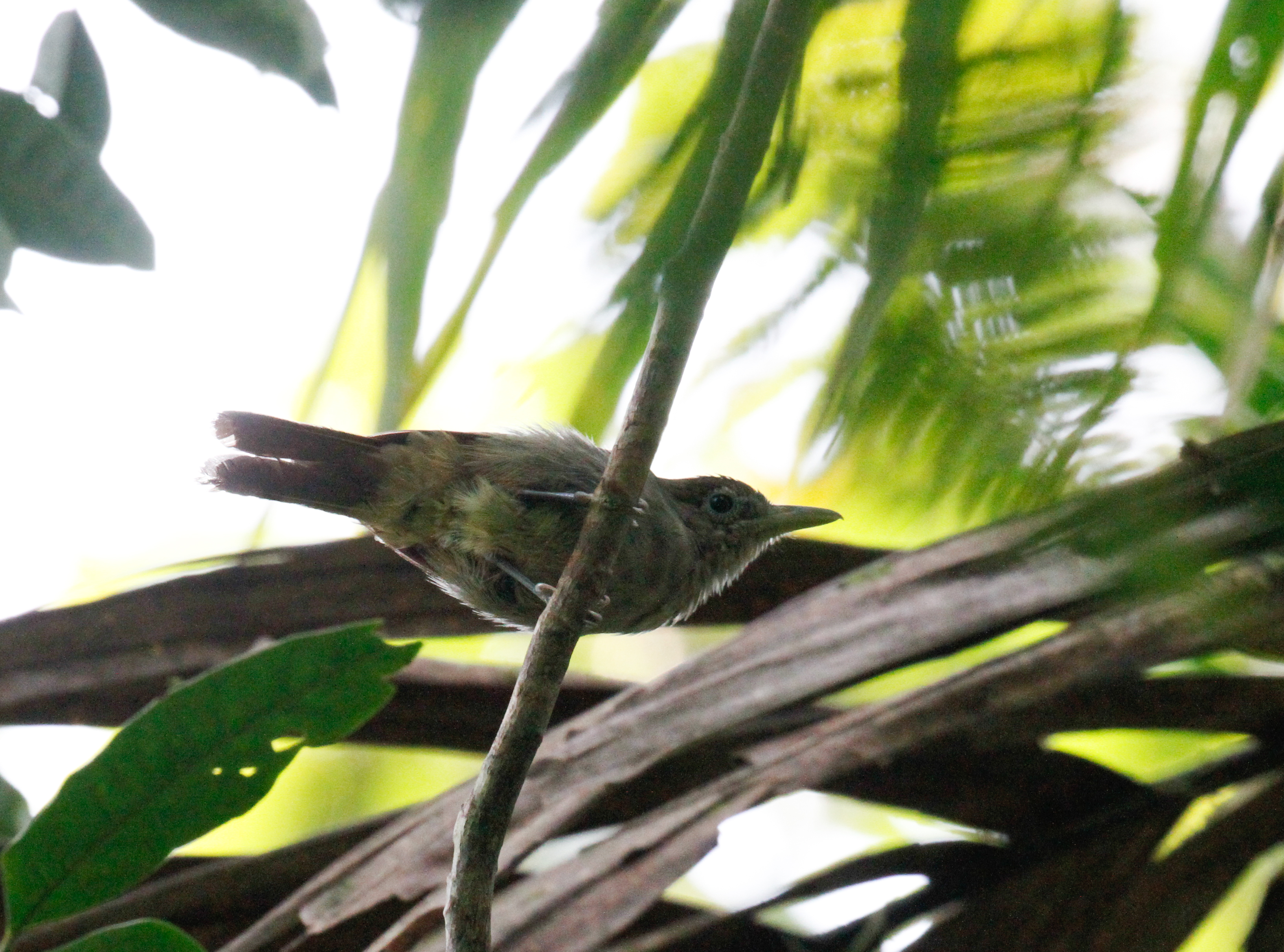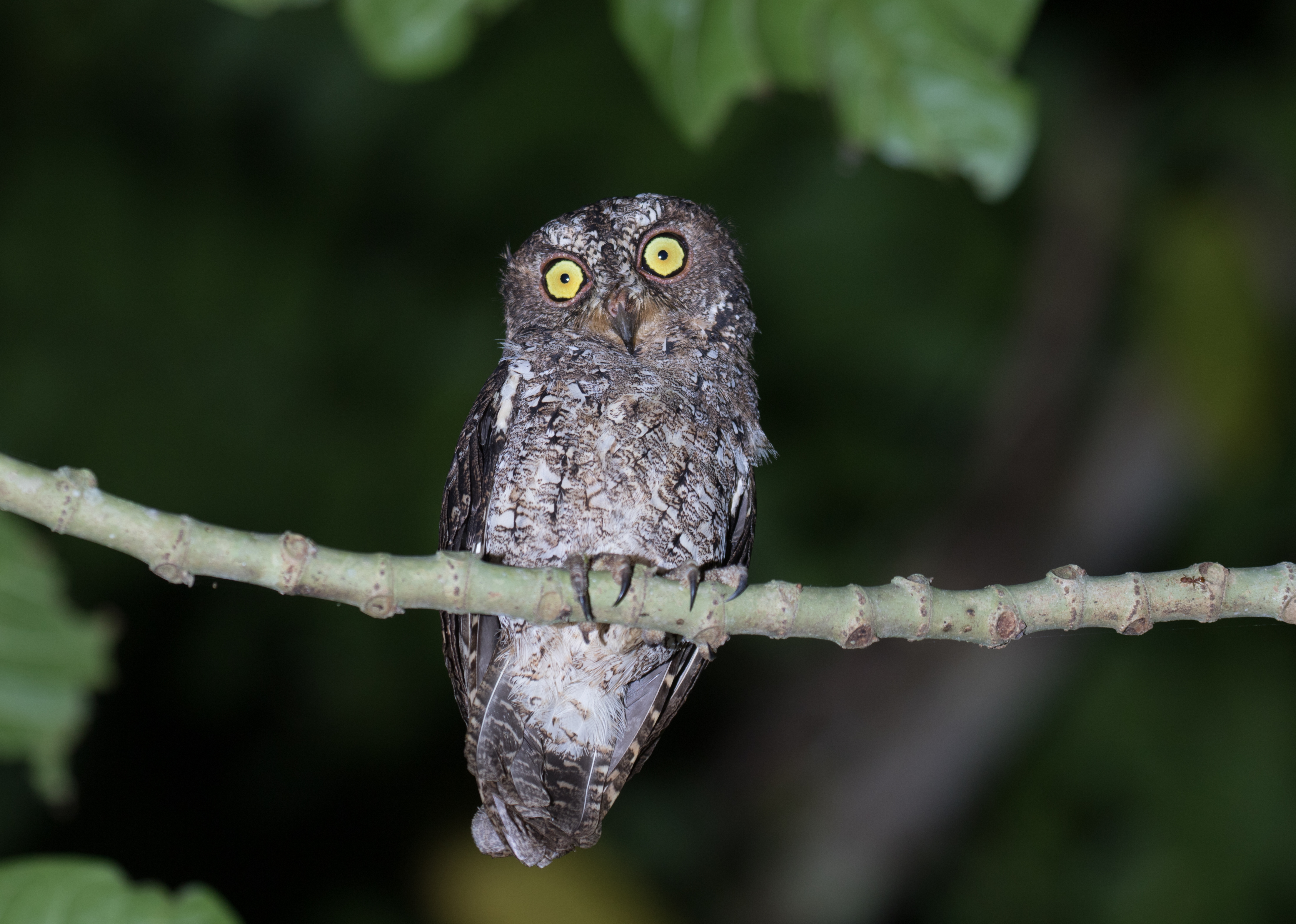 We continued walking and soon reached the top of the mountain around 860m elevation. We ate a small lunch and started walking around exploring the top. There were no views from the top, but the green moss covered trees towering above us were enough of a sight! Believe it or not (and I’m sure you will since I’ll be including a photo) we had sightings of a single Sangihe Whistler, another of the targets that we weren’t sure would even be around! We were very fortunate to have amazing weather on our visit up the mountain. We spent a bit more time wandering the trail and decided we should start birding back down before it got dark. On the way back down we had sightings of Elegant Imperial-Pigeon and more Elegant Sunbirds before catching up with yet another Sangihe Whistler! This time the bird posed in the open for photos and we watched for several minutes as the bird hunted and successfully retrieved a moth from a dead piece of palm matter. It was definitely neat to see! We tried again for the golden bulbul but no such luck. When we made it back to Rainbow Loseman Homestay, we decided to try for Sangihe Scops-Owl and it wasn’t long before we heard one call. We spent a bit of time watching and photographing a cooperative Sangihe Scops-Owl before calling it quits for the night.