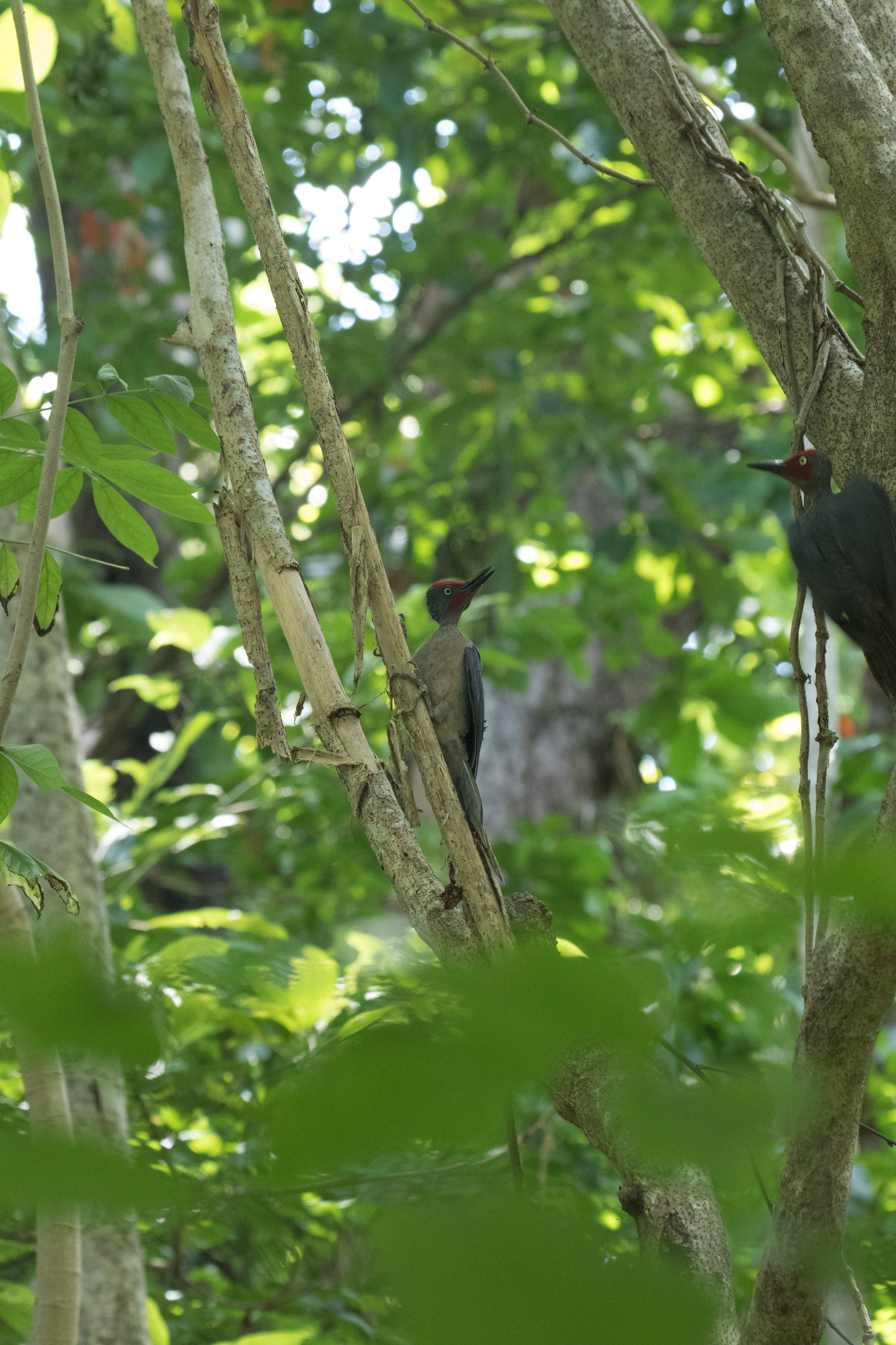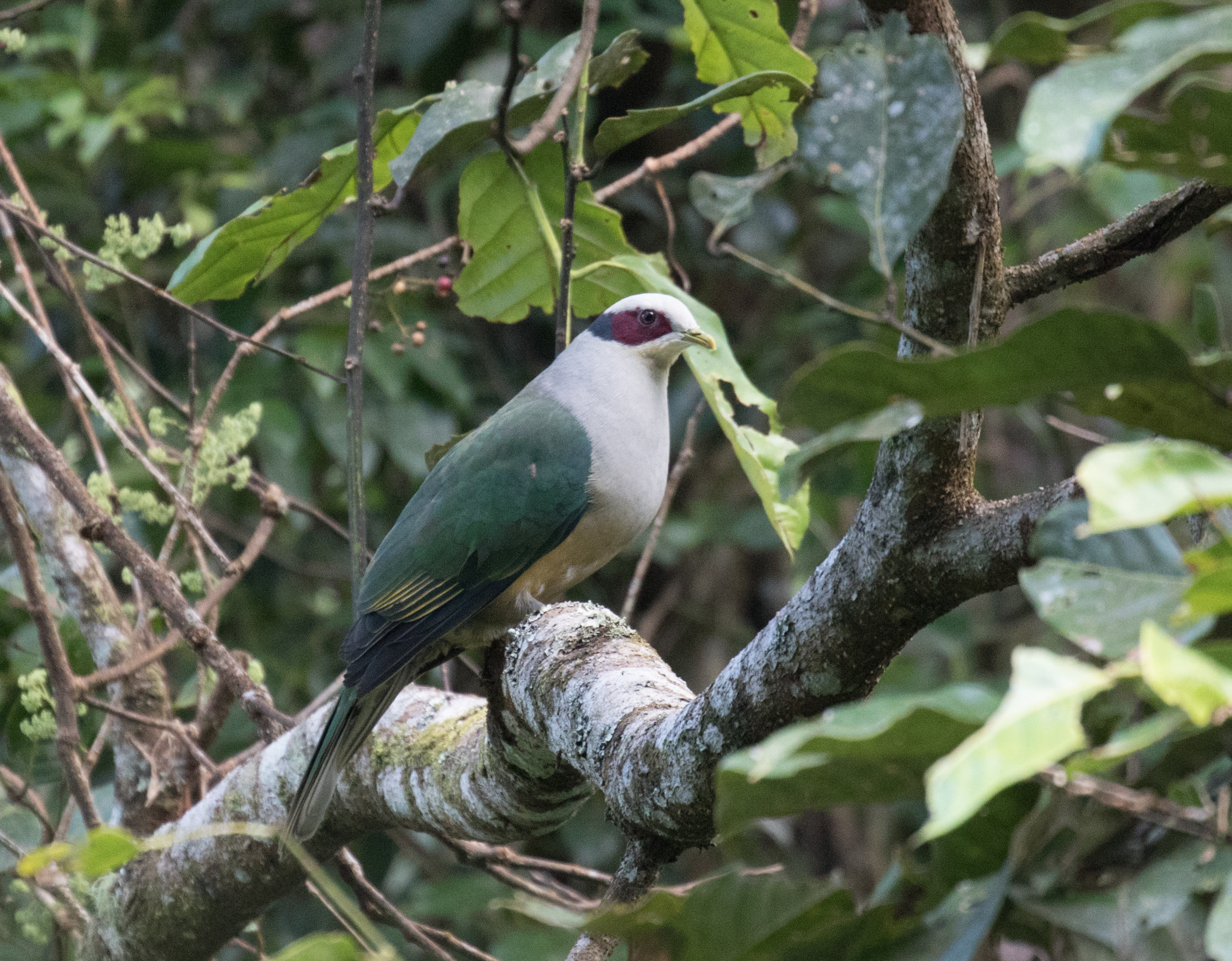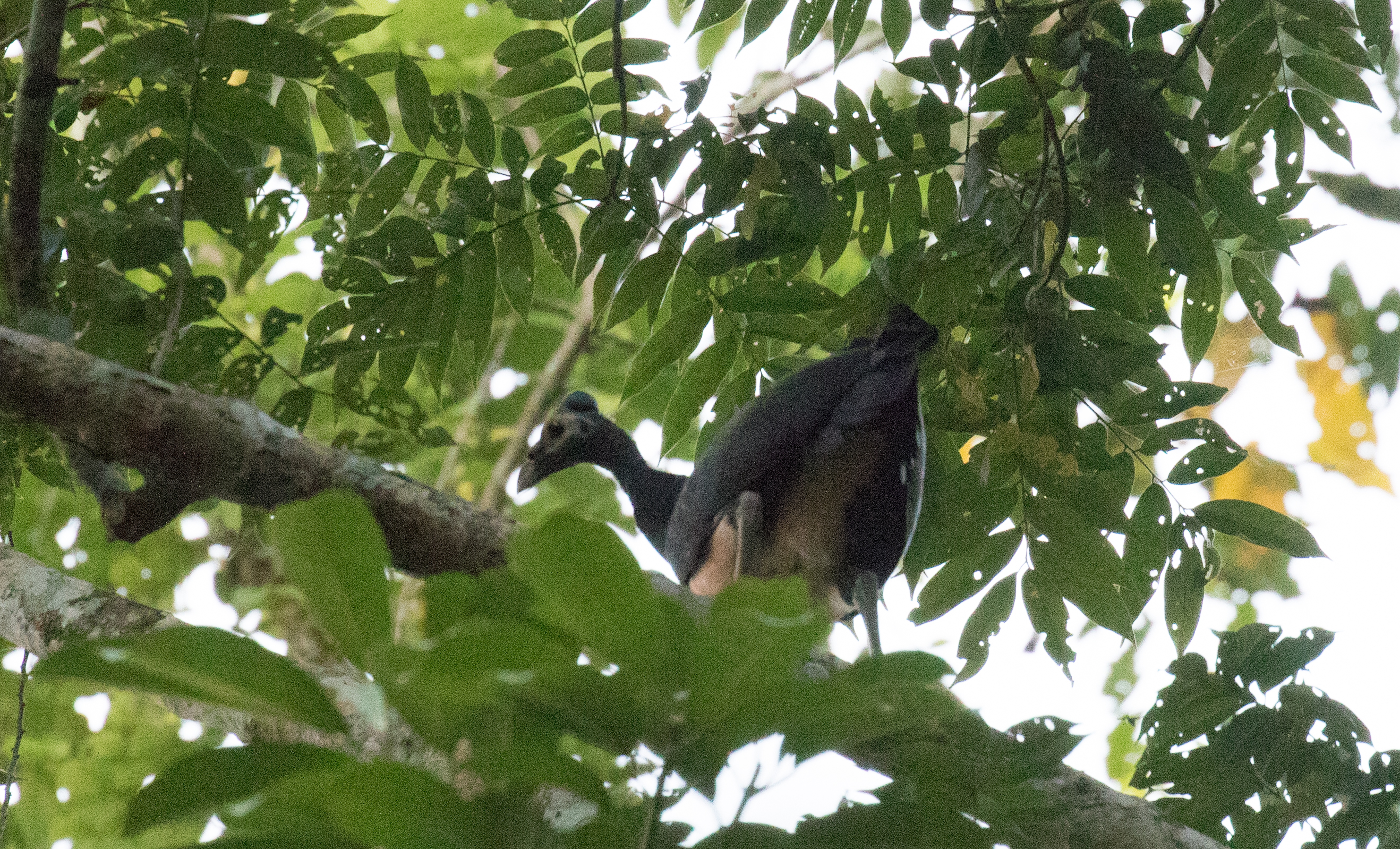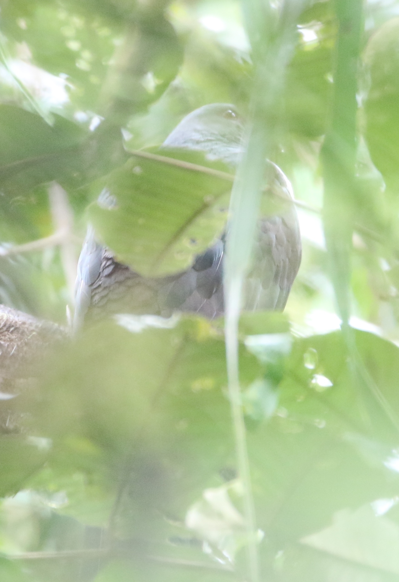 We walked up and down the trails and the day was quite productive with views of Matinan Flycatcher, Malia, Dark-eared Myza, and Flame-browed Myna, but easily the best bird of the day was finally catching a glimpse (and actually great views) of Sombre Pigeon, a bird we attempted to tape in earlier in the day after hearing it call. Many people dip this bird altogether and certainly rarely see it perched in a tree. We had the bird perched nicely but Ross’s camera was refusing to turn on (an ongoing and amazingly frustrating problem) so he wasn’t able to get a photo. Michael did snap a few record shots but his position made the bird much more obscured, and since he isn’t able to use manual focus, the picture isn’t the greatest, but despite the flaws, he did agree to let me post a photo of it so y’all know I’m not making this up!