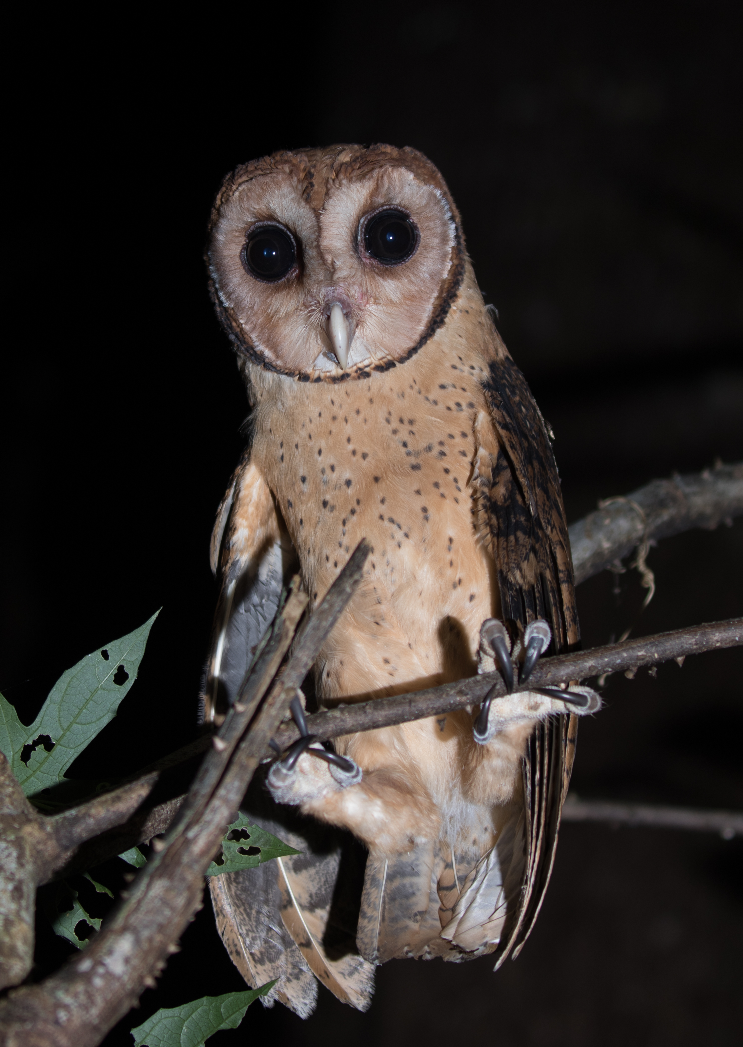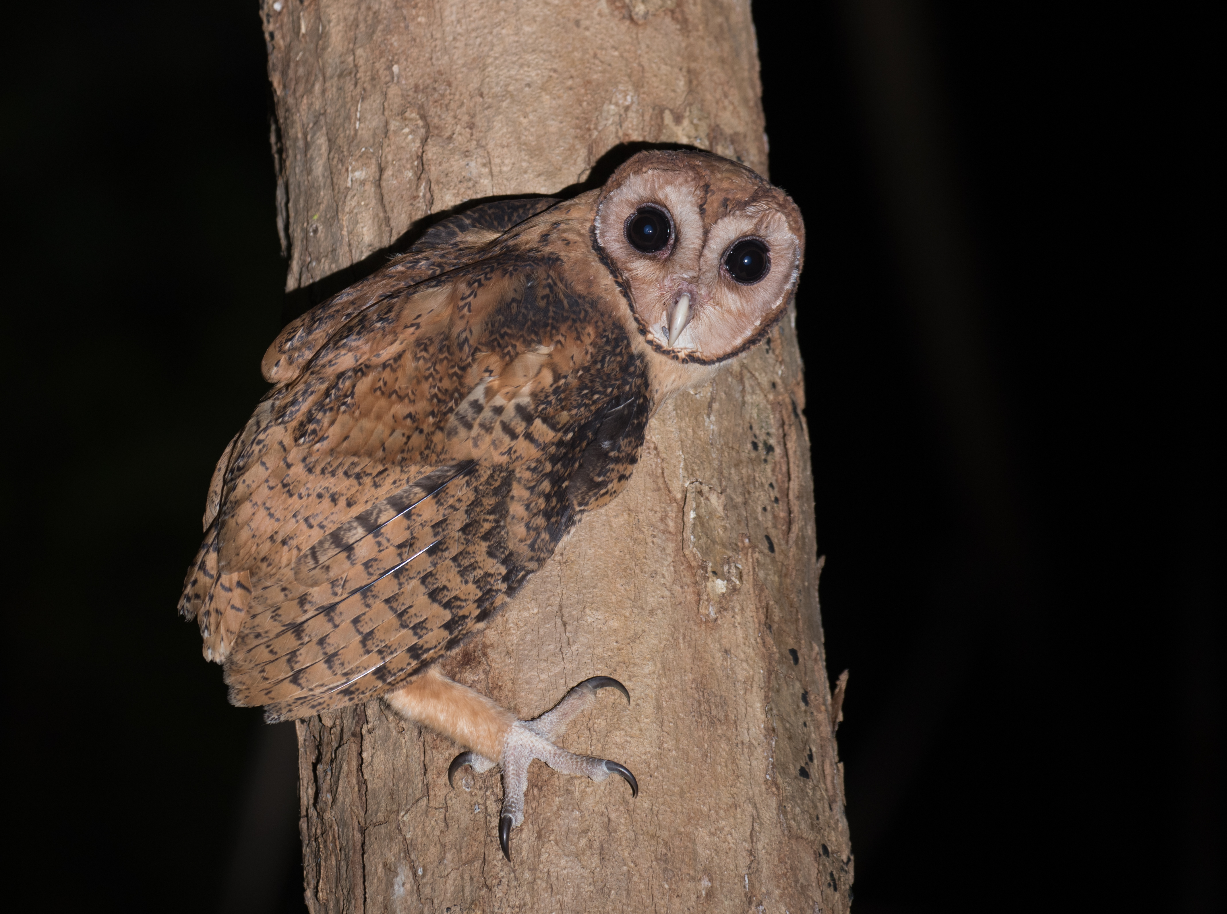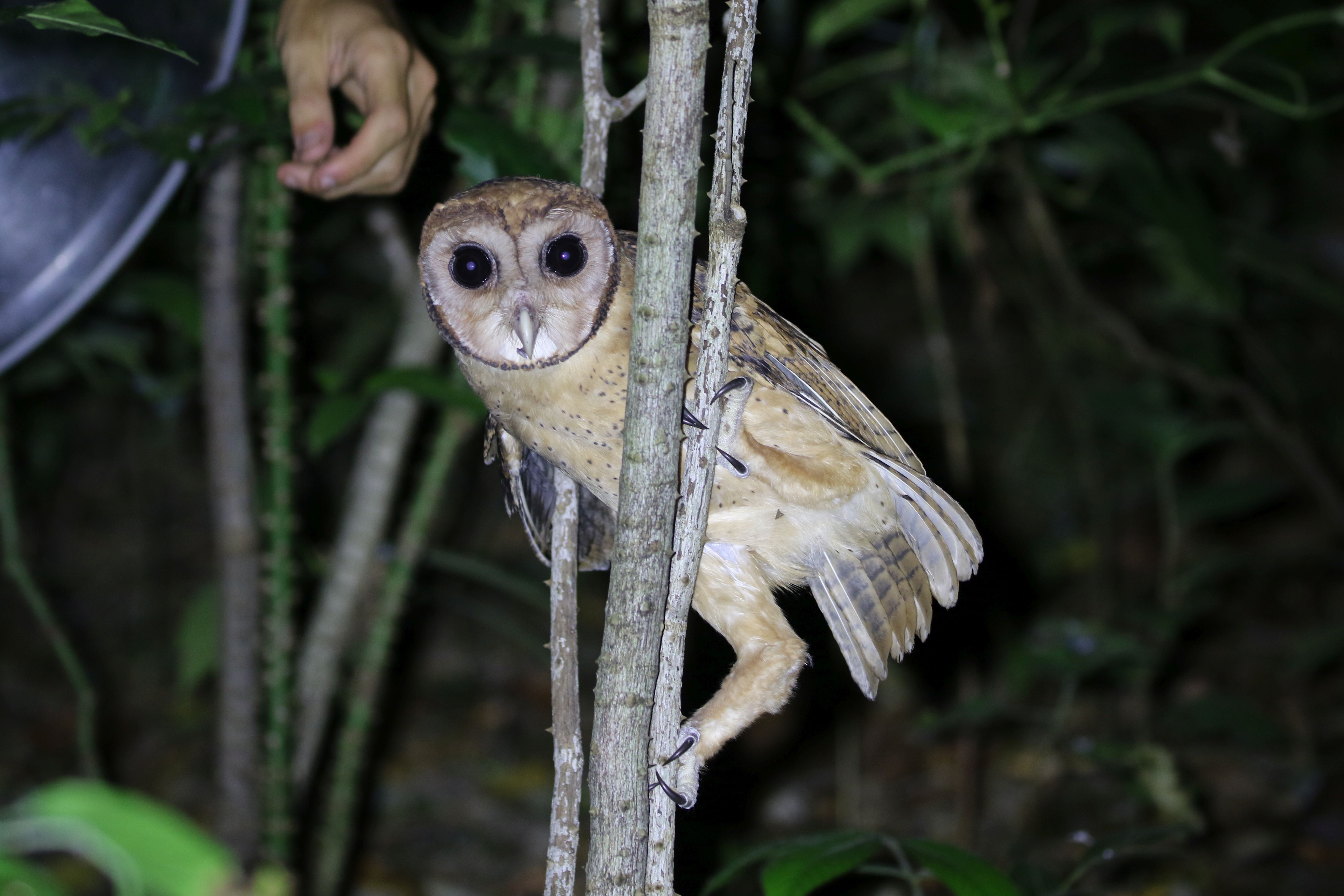 When evening rolled around, we had already decided we weren’t messing around. We had one last night before we flew out of Sulawesi and we planned to use every hour that we could to track down and see this Minahasa Masked-Owl so we packed our tent, some food for dinner and set off on the hour-long hike to the same spot we had been trying, only this time we planned to camp there and spend as long as it took. We arrived and opted to start the night off underneath a different tree close to our same spot. Darkness rolled around and we started to play the sound of the masked-owl. This bird calls very infrequently so we would play tape infrequently to match the bird’s typical behavior. When we didn’t have a response, we decided to walk back over to the big tree we’d been trying under before. On the way back I hear Ross scream “that’s it! Melissa get over here!” Apparently Ross had stumbled across a Minahasa Masked-Owl in a bush. The bird freed itself from the plant and perched on the side of a nearby tree only about 7ft off of the ground! We had excellent photos but realized the bird wasn’t acting anything like we thought it would. It had moved a few times, but not well and we began to wonder if it was injured or hurt so Ross decided to take a closer look and found himself stroking the back of a Minahasa Masked-Owl after checking it for injuries. Oddly the bird didn’t seem to mind and didn’t make any effort to fly away. It appeared to be okay enough and we felt it would be in its best interest to be left alone as it was. Our only guess is that it had gotten stuck in that bush while trying to snatch a rat and was more or less stunned from the impact. It probably didn’t help that this was exactly the same time that we found it. When I say “we” I really mean “Ross.” Michael is self-admittedly “useless at finding owls” and I simply do not have the right amount of perseverance. Ross on the other hand has the skill and determination necessary and takes pride in his ability to find – and photograph – even the most difficult of owls! Plus he just refuses to dip owls!