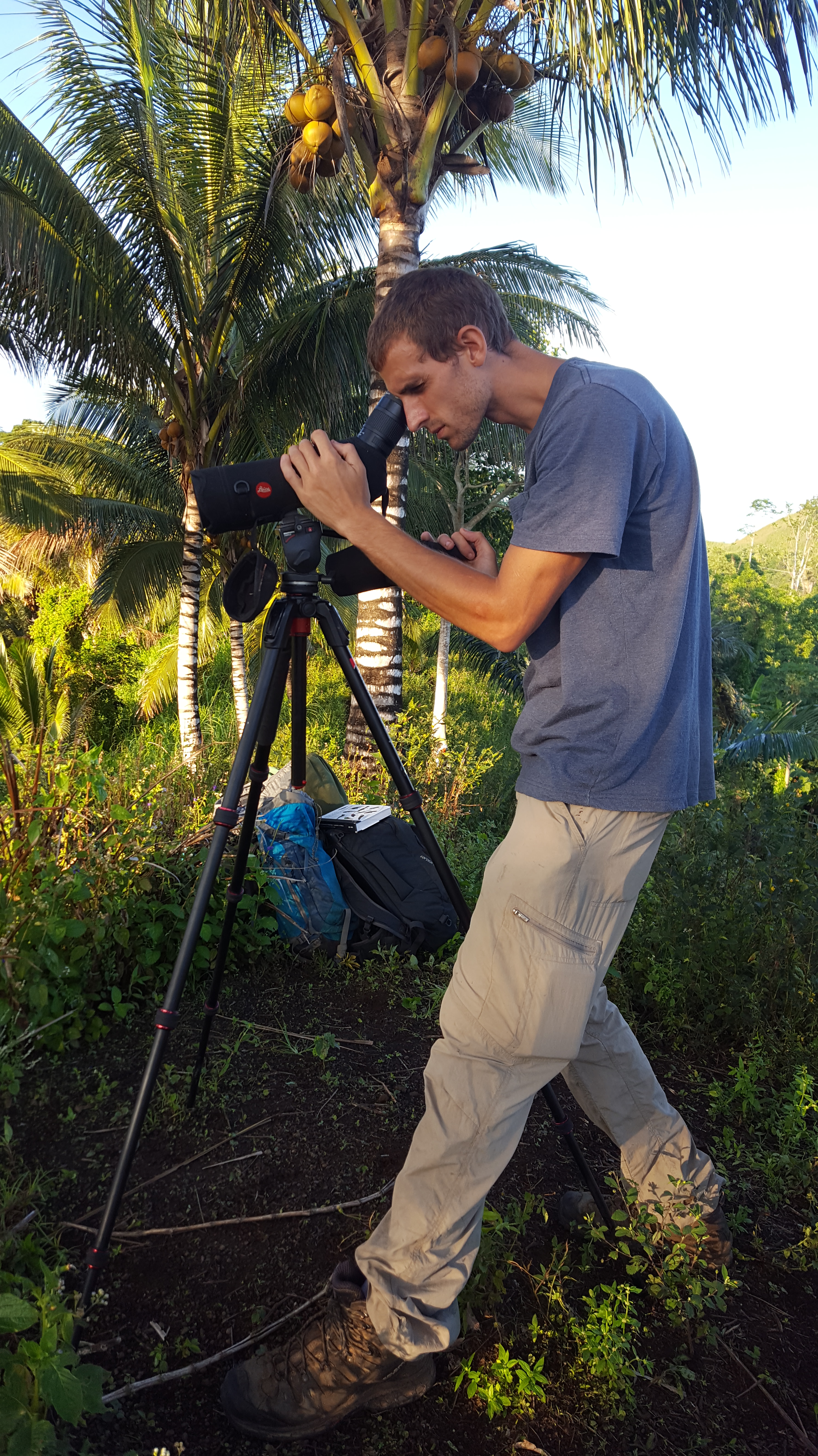 Our overnight ferry arrived in the harbor at 4AM on July 27th (my birthday!!!) and we immediately began to search for a taxi willing to take us to our next destination, Tangkoko Nature Reserve. Having a plethora of taxi drivers at the port makes negotiating prices much easier. Every time someone said a silly price we just walked away and talked to someone else. We were quoted a few ridiculous prices before we found a guy willing to drive the 2 hours for 200,000 rupiah. We were going to be pressed for time and were a bit sad that we wouldn’t make it to our location, a birding site known as “kilometer 10”, until well after dawn, but there was nothing we could do about that (it wasn’t like we could have made our ferry go faster and arrive earlier.) We knew we would be a bit late but since Kilometer 10 is closer than the nature reserve, we still thought we could get there at a decent time. Kilometer 10 is a lookout site where you stand at a small hilltop overlooking the valley below and scan for birds flying through. We were coming here to hopefully check off some difficult to see targets and knew that birds were going to be most active during the early parts of the day. Lucky for us, when it comes to speed taxi drivers, we hit the jackpot. Or perhaps unlucky for us because we didn’t have seatbelts and found ourselves travelling at speeds of over 110 miles per hour on narrow, winding roads. We didn’t tell our taxi that we were in a hurry but he drove like he was on a mission. We may have been afraid for our lives, but we weren’t late and got to our location just as the sun was rising. Didn’t see that one coming. We arrived on the side of the road and attempted to make our way to the GPS coordinates that we had for the overlook site but we couldn’t find them. In fact we never got any closer than within 300m of the coordinates, but instead we found our own little overlook and this spot proved to be more than adequate. Ross swears that you can’t go on a birding trip without a scope and that morning proved it as he did what he does best, scan distant hillsides and find target birds. We had excellent views of White-bellied Imperial Pigeon, Grey-headed Imperial-Pigeon, Pied Cuckooshrike, Purple-winged Roller, Sulawesi Hanging-Parrot, Pygmy Hanging-Parrot, and Minahasa Racquettail and after just one morning we had already ticked off more than half of our Tangkoko targets. It was a good birthday morning for sure, even if I still didn’t have binoculars to use…. (Lucky for me my birthday present was going to be arriving in just a few days!)
