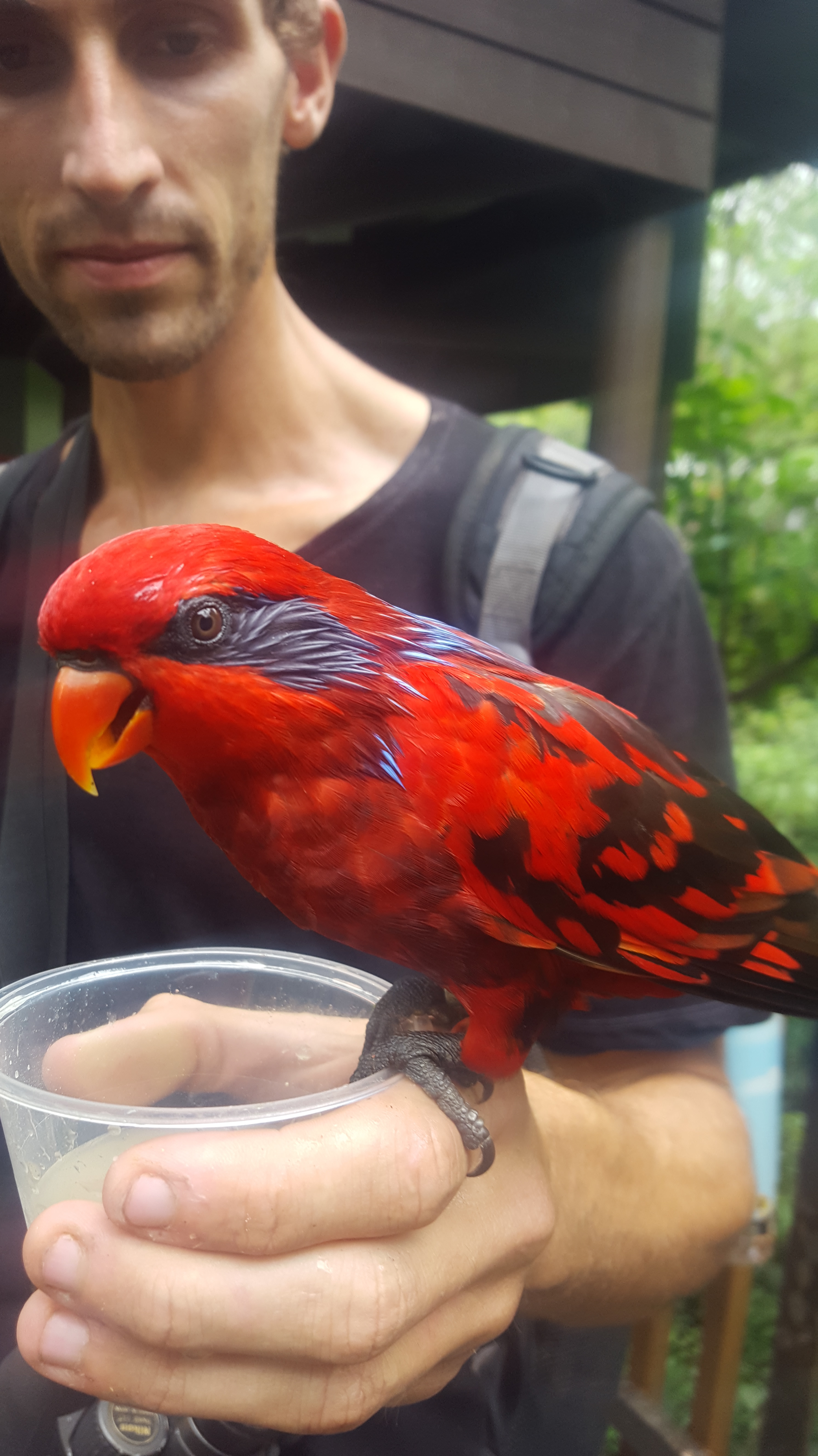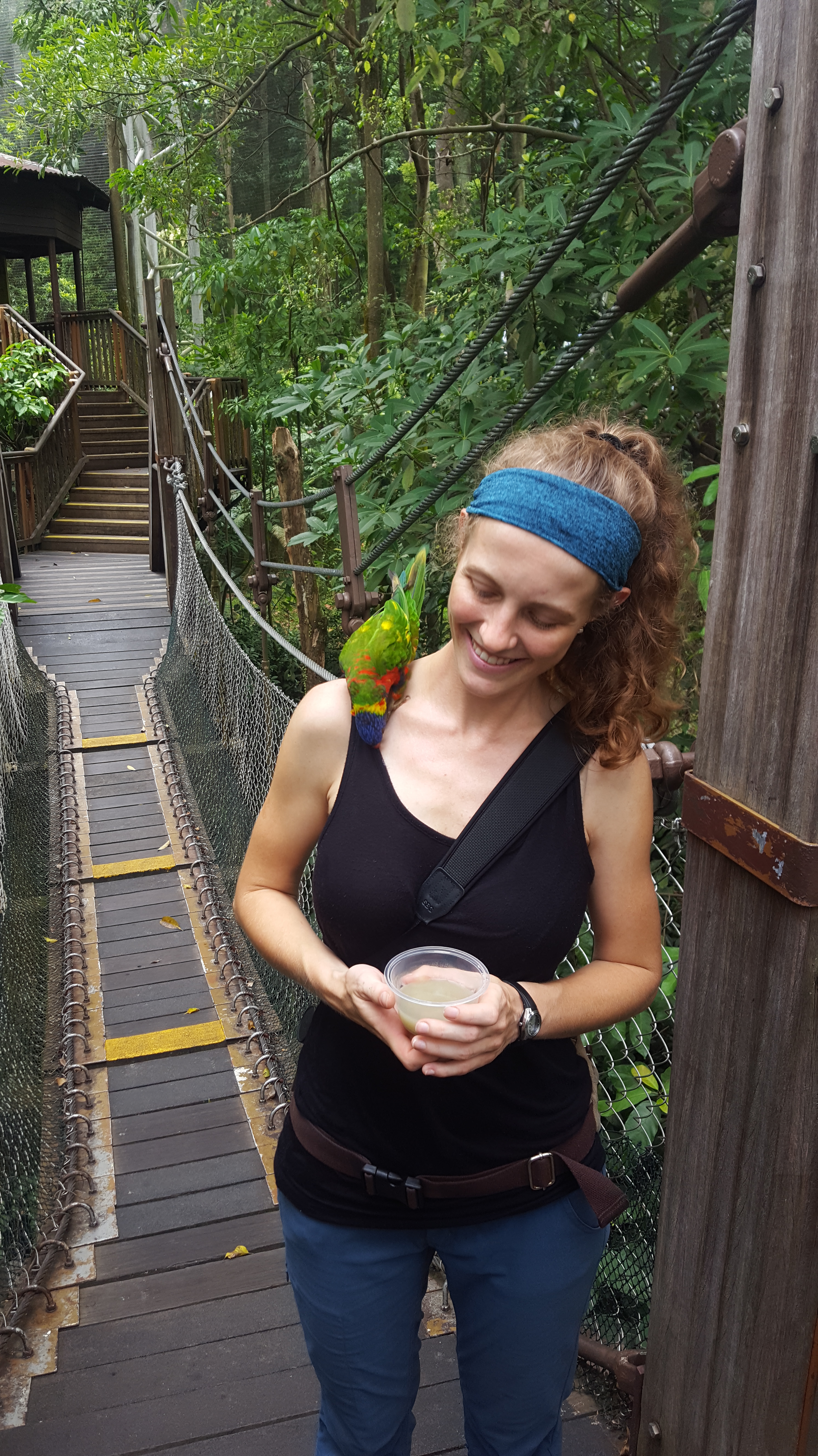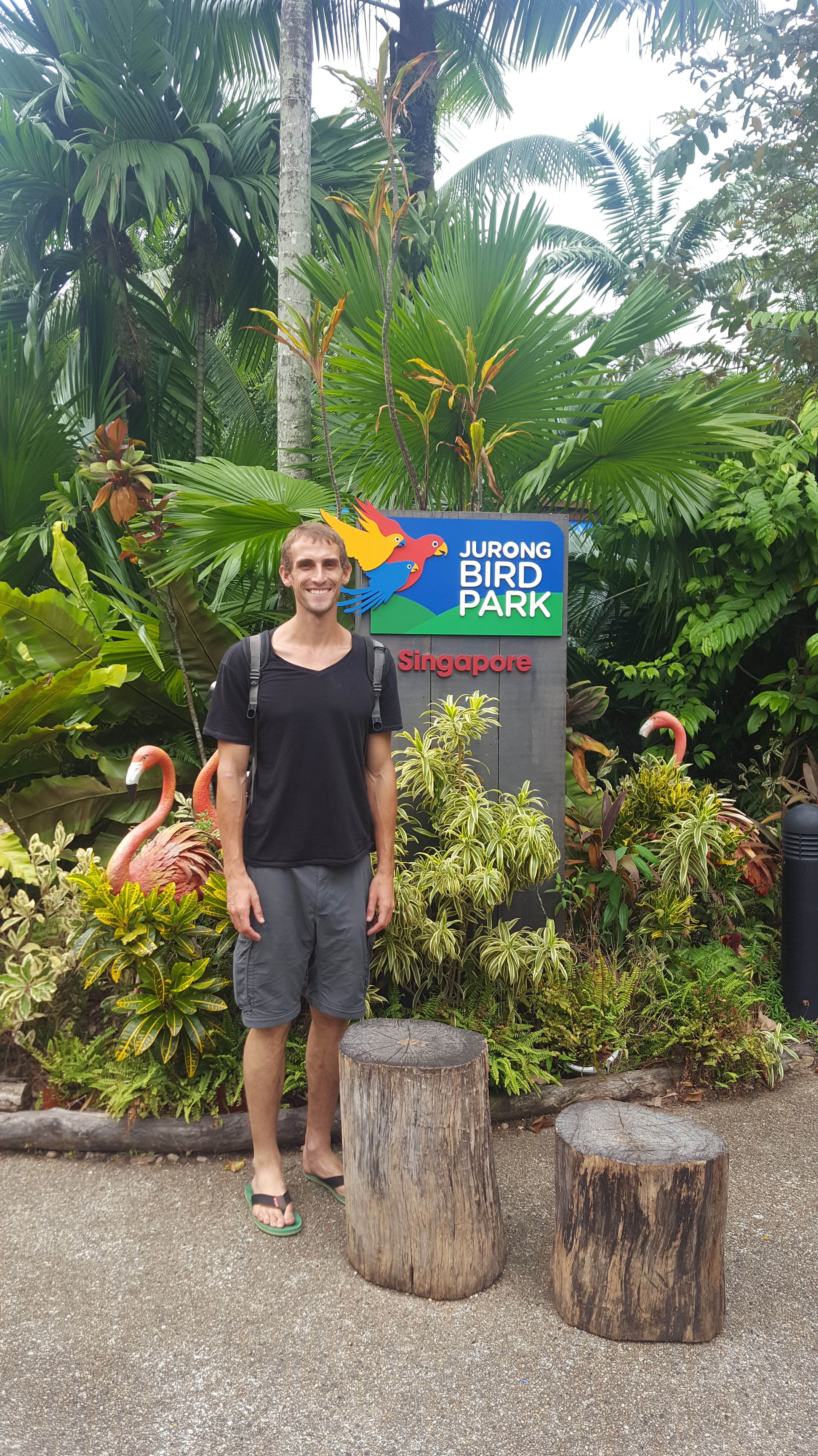 We woke up at 6:30am, ate some breakfast, hopped on the train, jumped off at a bus terminal and onto a bus that landed us right at the front door of Singapore’s Jurung Bird park, an outdoor aviary boasting habitats of birds from all over the world containing over 400 species. Public transportation in Singapore is ample and very, very easy to navigate. We spent the next 4 hours meandering through Asia’s largest bird park and were amazed with how much we enjoyed it. They had many exotic birds from around the world and having a chance to see these beautiful creatures up close was super fun! Regardless of your opinion on birds in captivity, we believe that the only way people are going to care about birds and be willing save them is for them to learn about them. Not to mention the amount of conservation done at a place like this is pretty amazing. They were the first to successfully captively breed a 12-wired Bird-of-Paradise, a bird we would soon be seeing in Indonesia! A highlight for sure had to be feeding lorikeets some nectar and having the brightly colored birds climb all over us! Seeing Blue-streaked Lory up so close was especially nice because we would (hopefully) be seeing some when we arrived back to Indonesia!