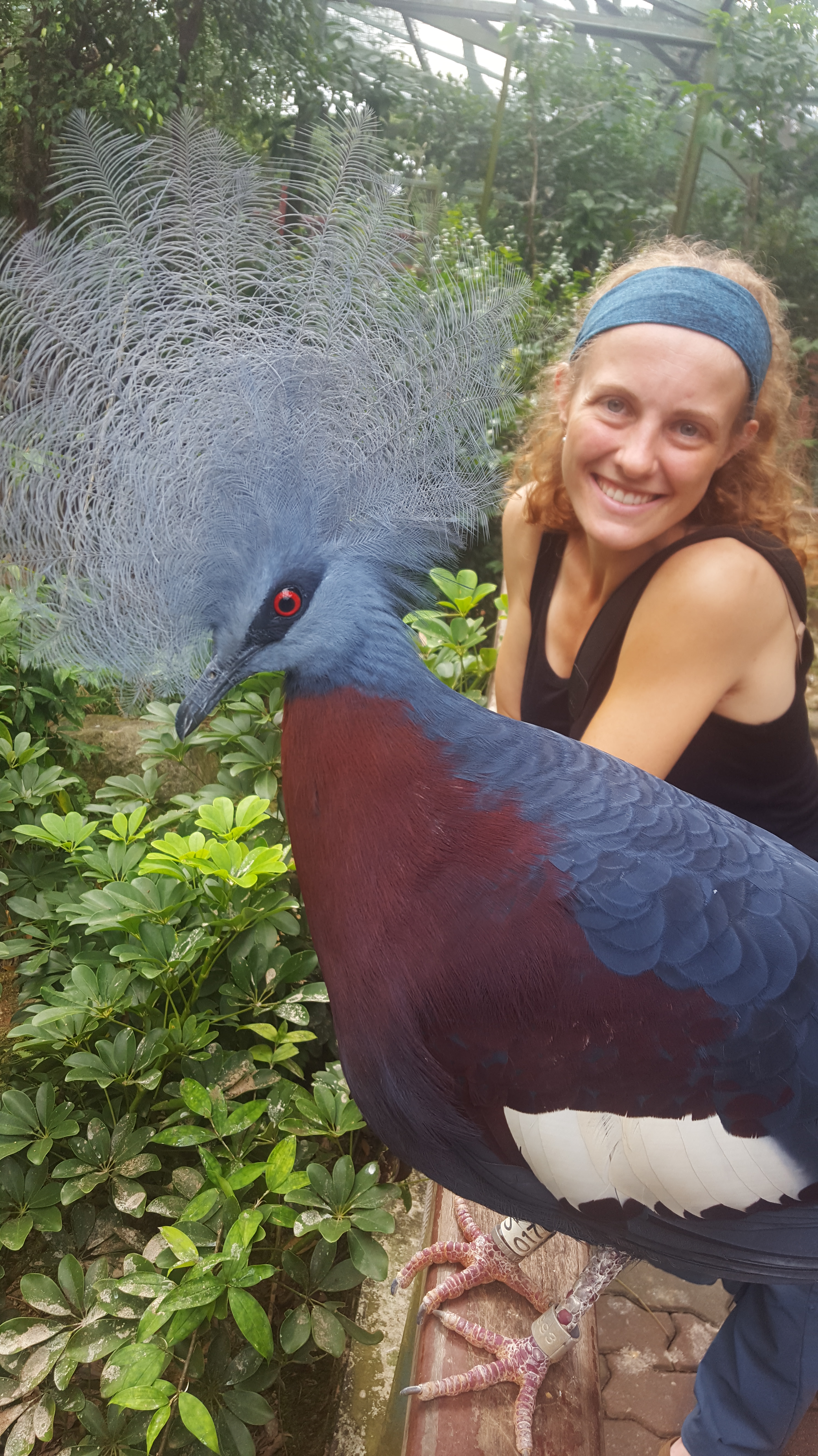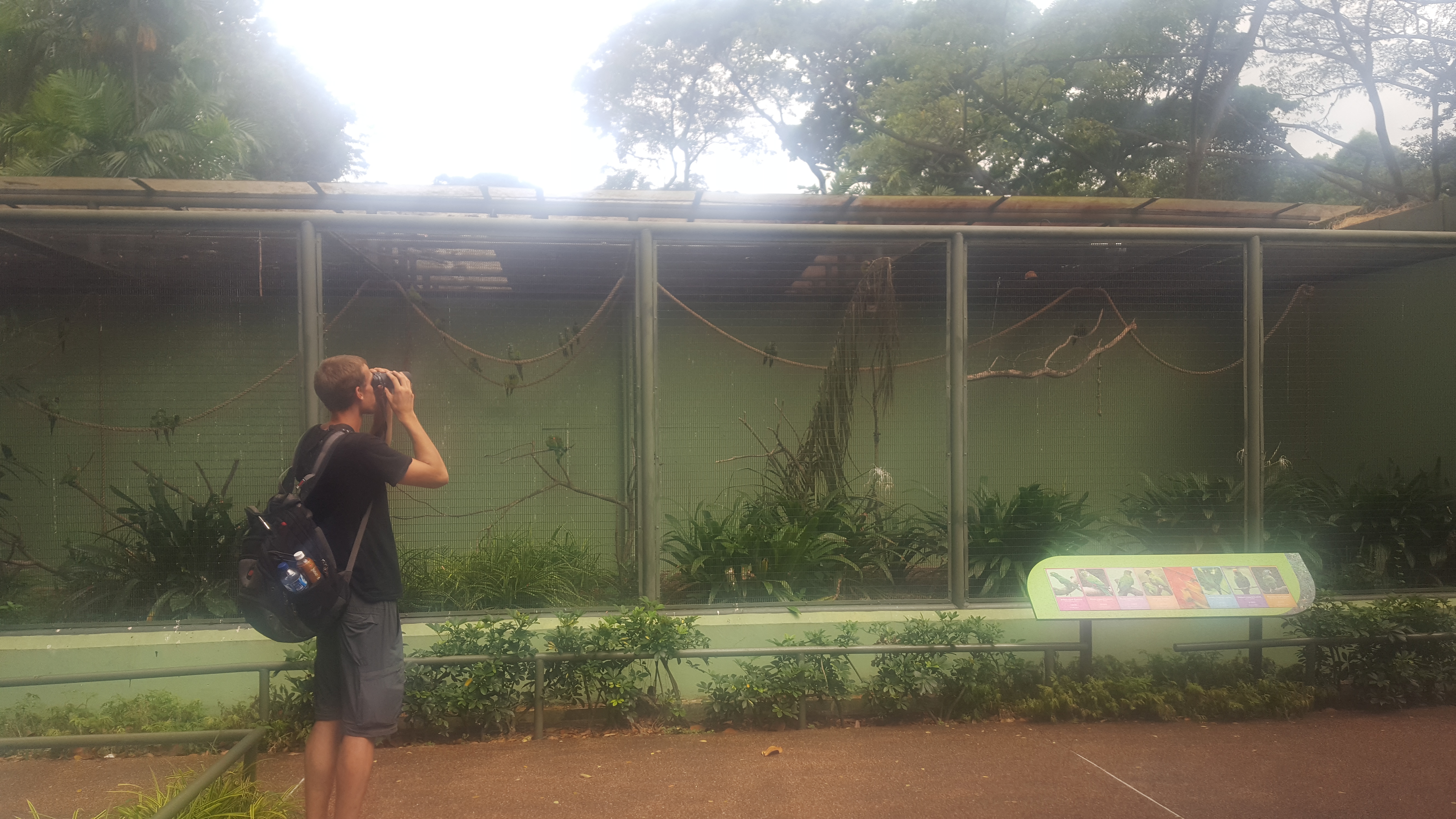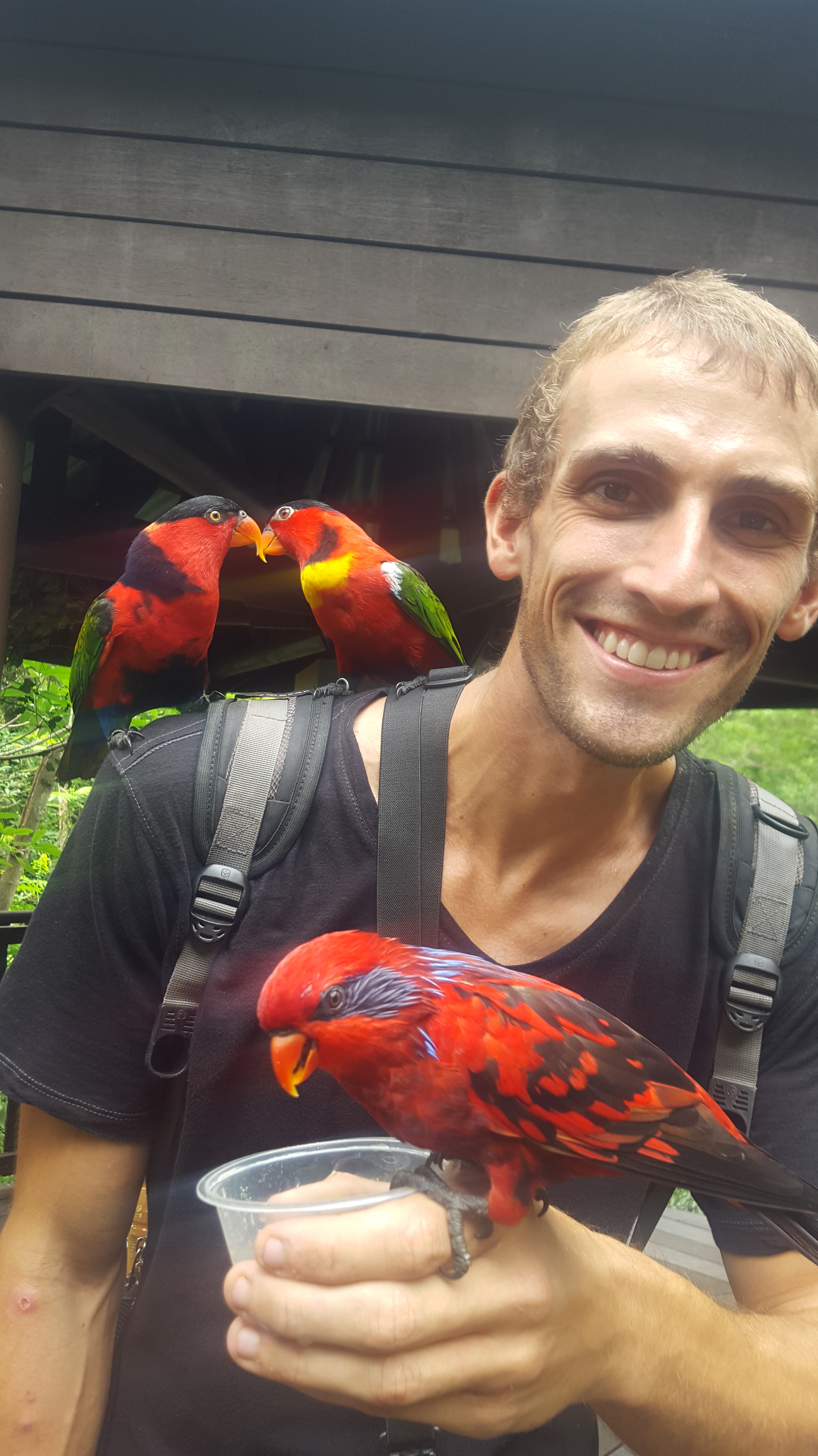 We woke up at 6:30am, ate some breakfast, hopped on the train, jumped off at a bus terminal and onto a bus that landed us right at the front door of Singapore’s Jurung Bird park, an outdoor aviary boasting habitats of birds from all over the world containing over 400 species. Public transportation in Singapore is ample and very, very easy to navigate. We spent the next 4 hours meandering through Asia’s largest bird park and were amazed with how much we enjoyed it. They had many exotic birds from around the world and having a chance to see these beautiful creatures up close was super fun! Regardless of your opinion on birds in captivity, we believe that the only way people are going to care about birds and be willing save them is for them to learn about them. Not to mention the amount of conservation done at a place like this is pretty amazing. They were the first to successfully captively breed a 12-wired Bird-of-Paradise, a bird we would soon be seeing in Indonesia! A highlight for sure had to be feeding lorikeets some nectar and having the brightly colored birds climb all over us! Seeing Blue-streaked Lory up so close was especially nice because we would (hopefully) be seeing some when we arrived back to Indonesia!