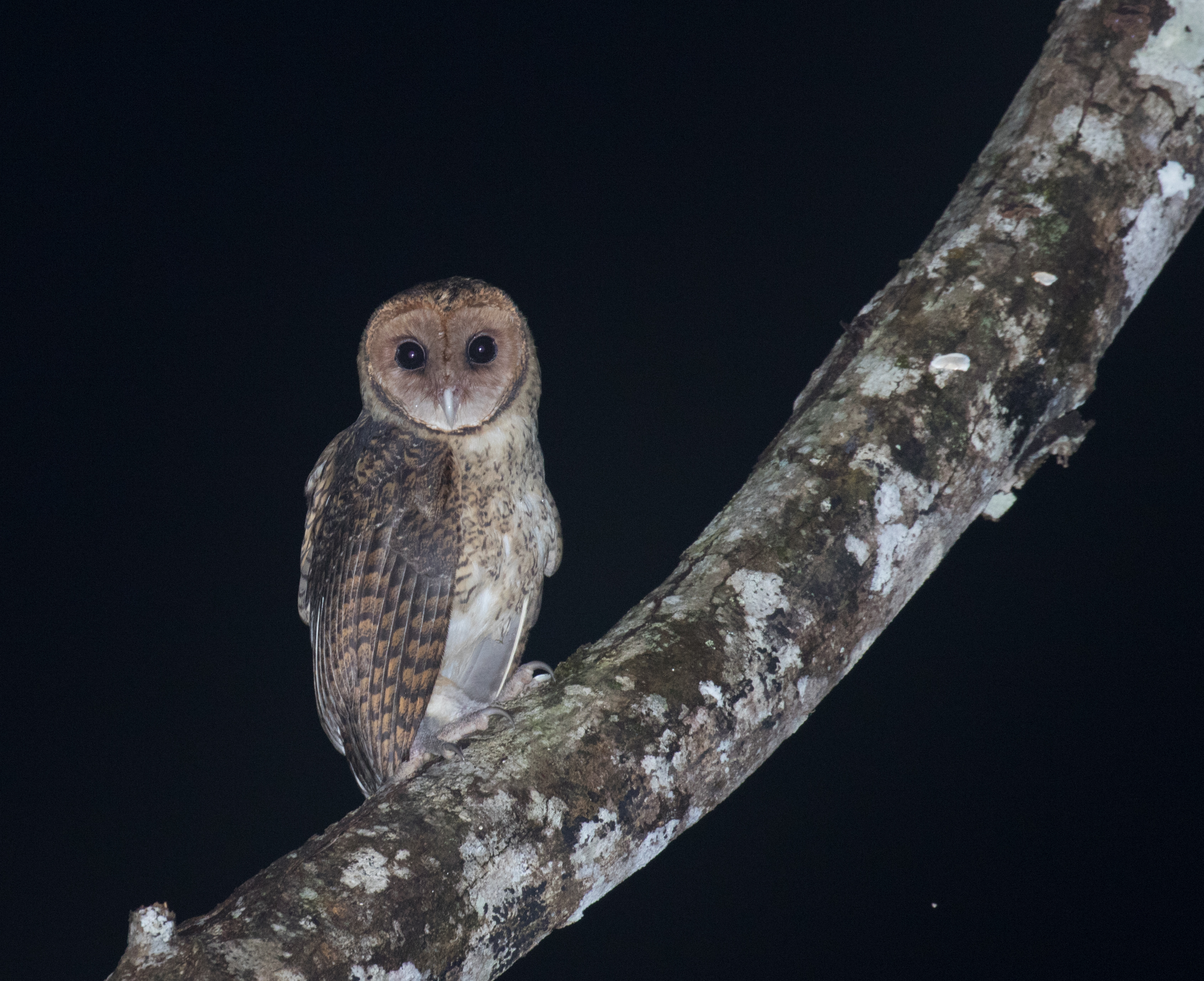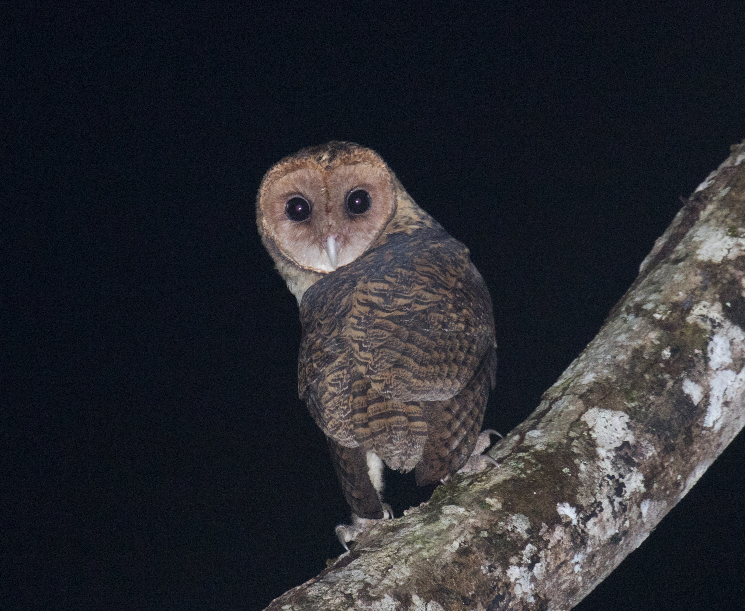 That night it stopped raining so we went back out to try for owls. We crossed the stream to get out of town and started up the road back in the direction we had come in from just a few days ago. We were still looking for the Hantu Boobook and were getting increasingly frustrated as we didn’t have a good recording for it and the description in the book didn’t match the crappy recording that we had. While trying to tape for the boobook, Ross thought he might have heard a Buru Masked-Owl calling very far in the distance. Either he did or he’s just lucky because not even 3 seconds after playing the call, a Buru Masked-Owl came in with a vengeance and flew right over our heads! One more play of the call and it perched right in the open allowing perfect views and a near perfect photo. We were very happy to have this owl so easy because it can be tricky and usually involves spending a night in another town close to the coast.