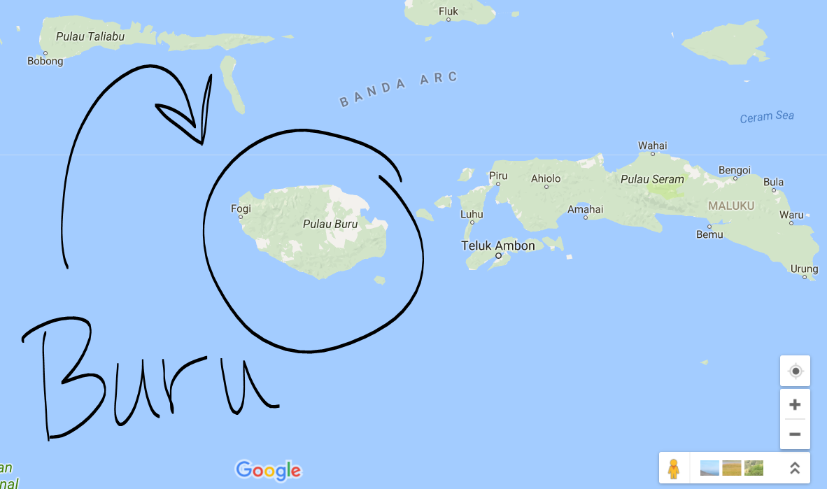 Buru Island lies between two seas of the Pacific Ocean, Seram Sea on the north and Banda Sea to the south and west. Buru is shaped like an oval and is the third largest among the Maluku Islands after Halmahera and Seram, per Wikipedia. Buru has a pretty fascinating history, as many of the Spice Islands do, and was once a valuable source of cloves. (I highly recommend this Wikipedia article.) These days the island remains largely agricultural with most of the population being involved in farming, animal farming, or fishing. Buru was to be the next stop on our Indonesian journey.