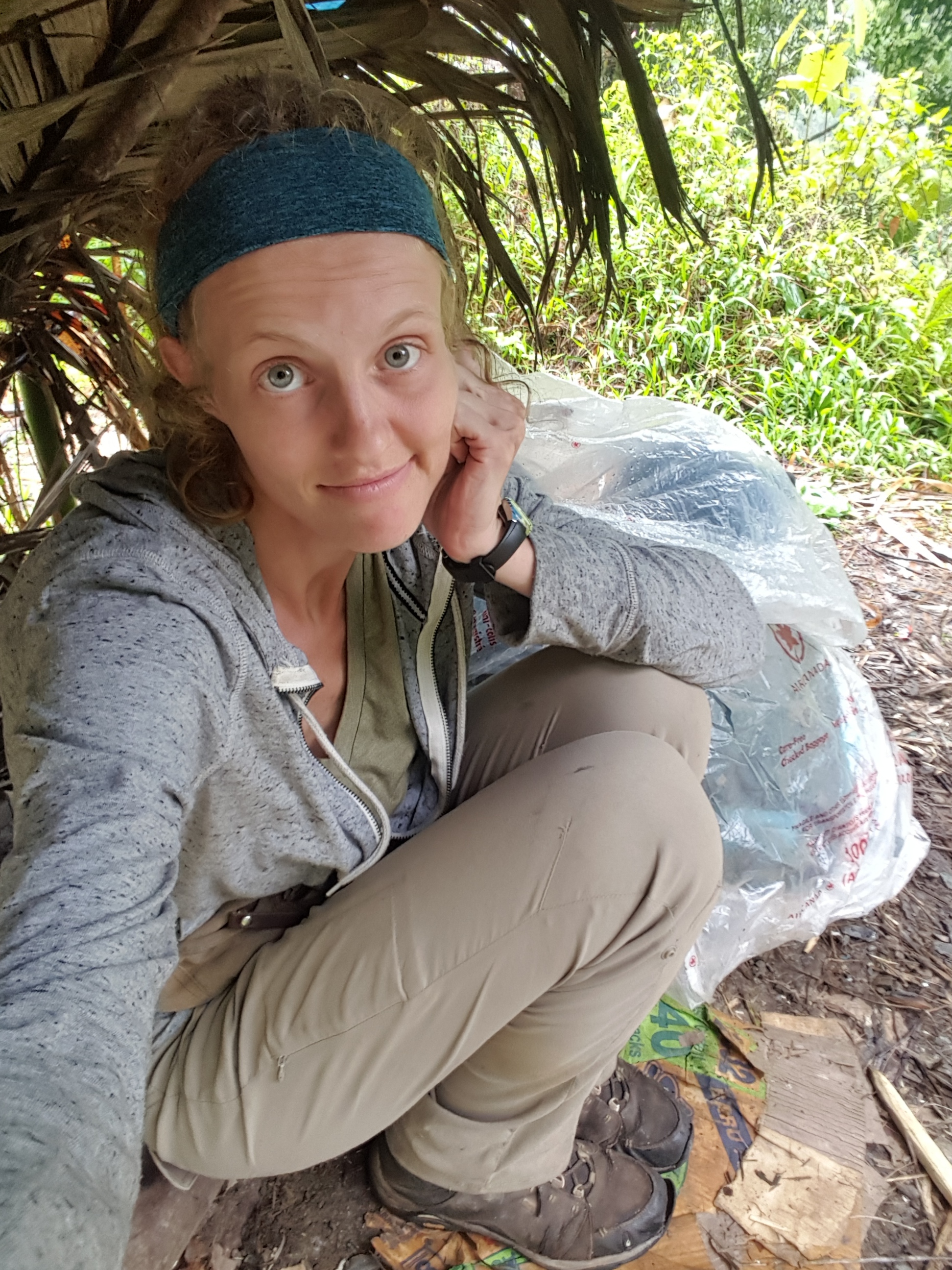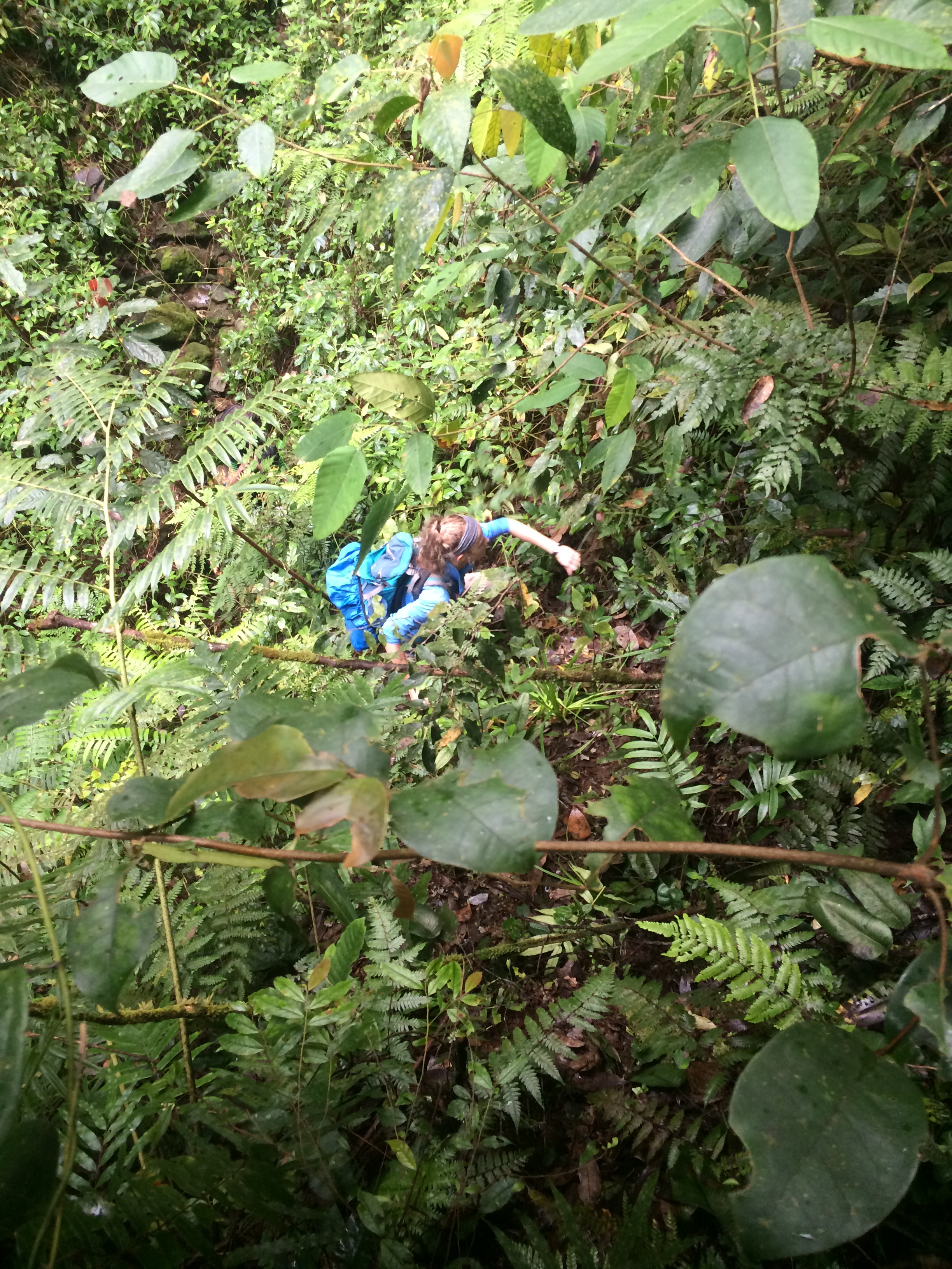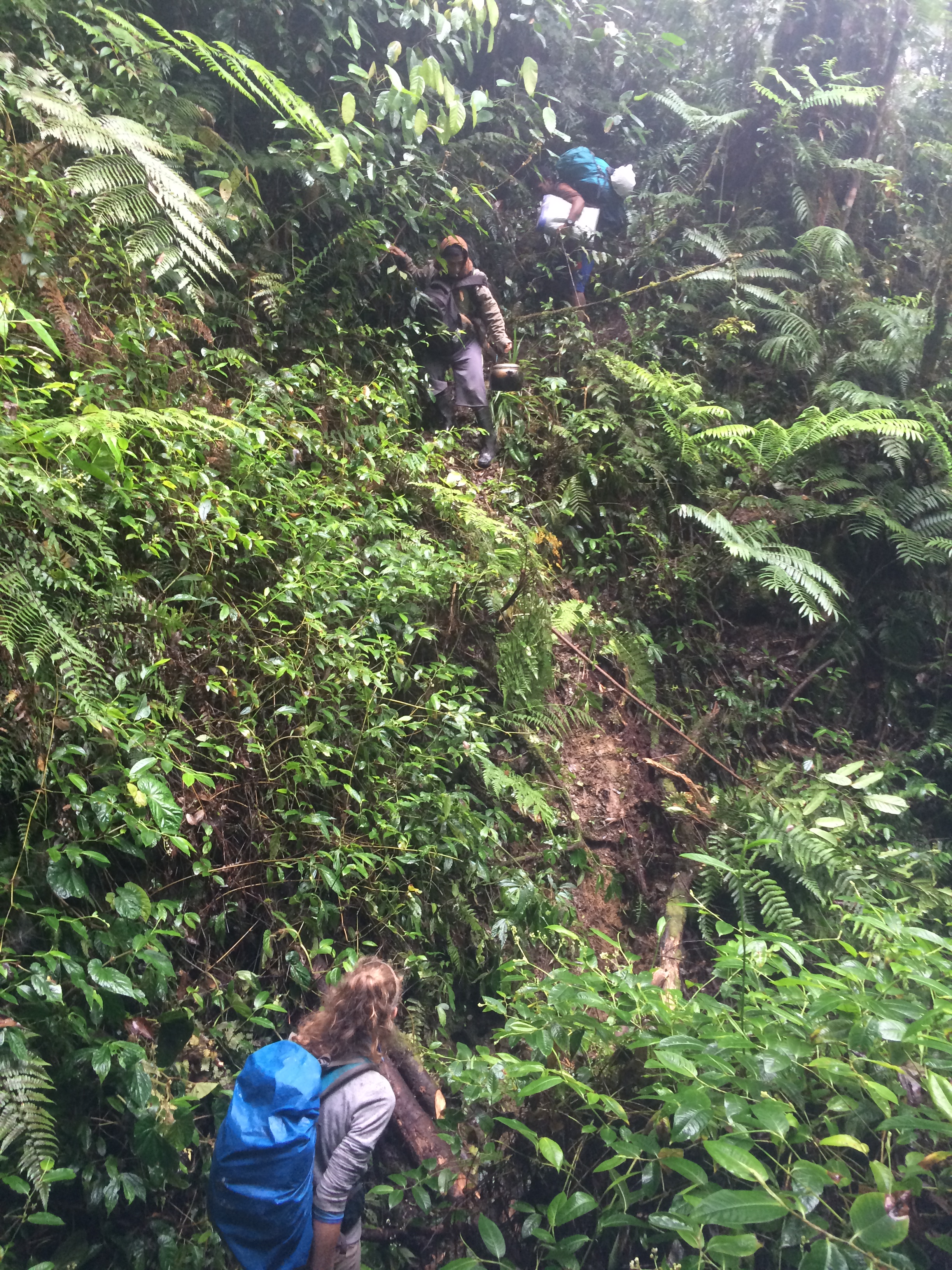 Eventually we made it to 1400m elevation at the top of a ridge. We were hoping to get up to 1600m to camp and then go even higher because the higher the better right? Well, it is never as easy as it sounds. Unfortunately after following the ridge at 1450m, the trail stopped going uphill and instead started paralleling the 1450m contour line. To make matters worse, our nice trail quickly deteriorated and our hopes of easily getting to 1600m began to fade. The nice path that we had been on completed dissipated and getting up the other side of a ravine at the end of the ridge required us to use all 4 limbs to propel upwards on the nearly vertical, muddy side of a mountain. Truly I have no idea how our guides did it with big packs on their backs and pots in their hands.