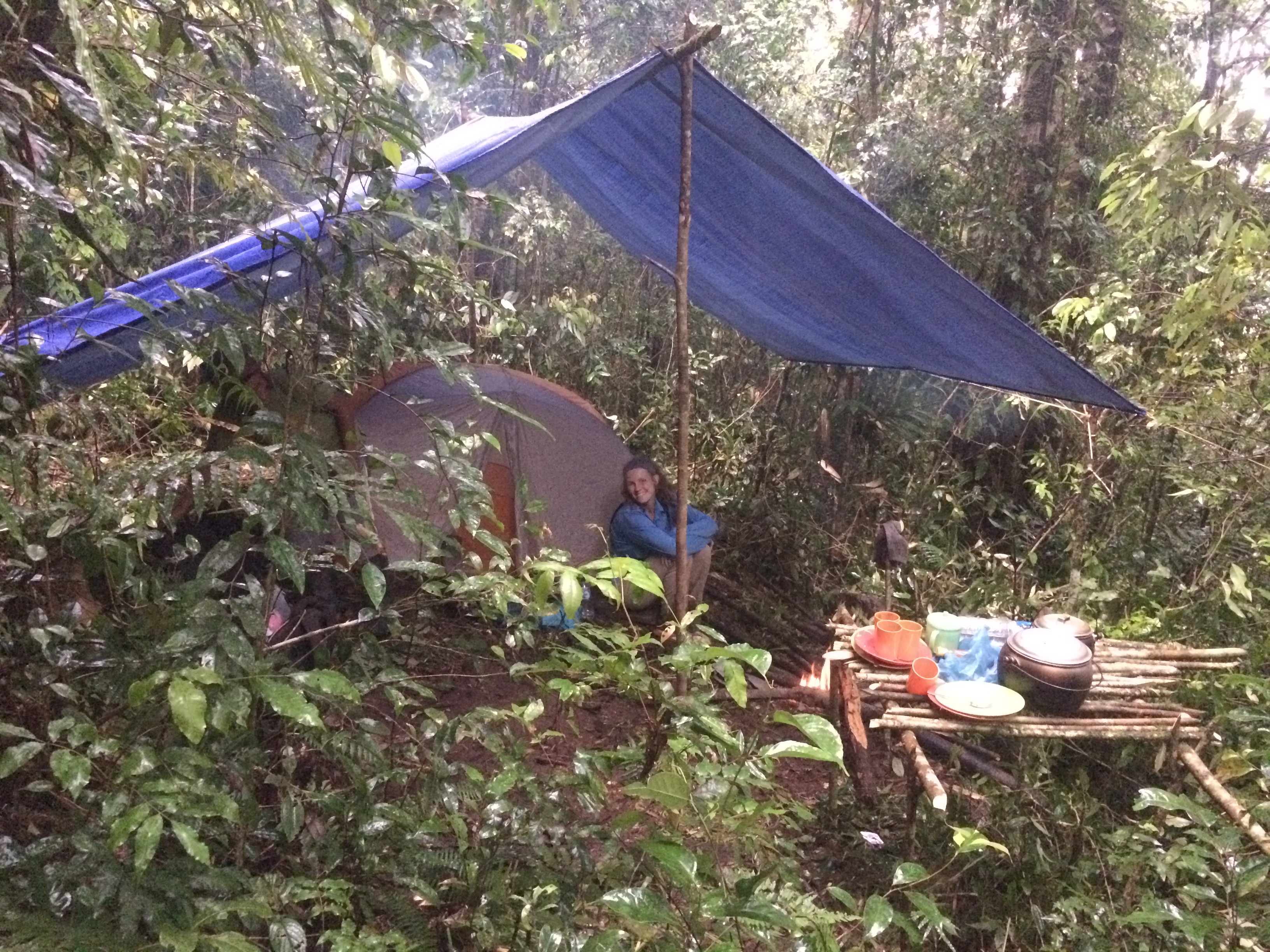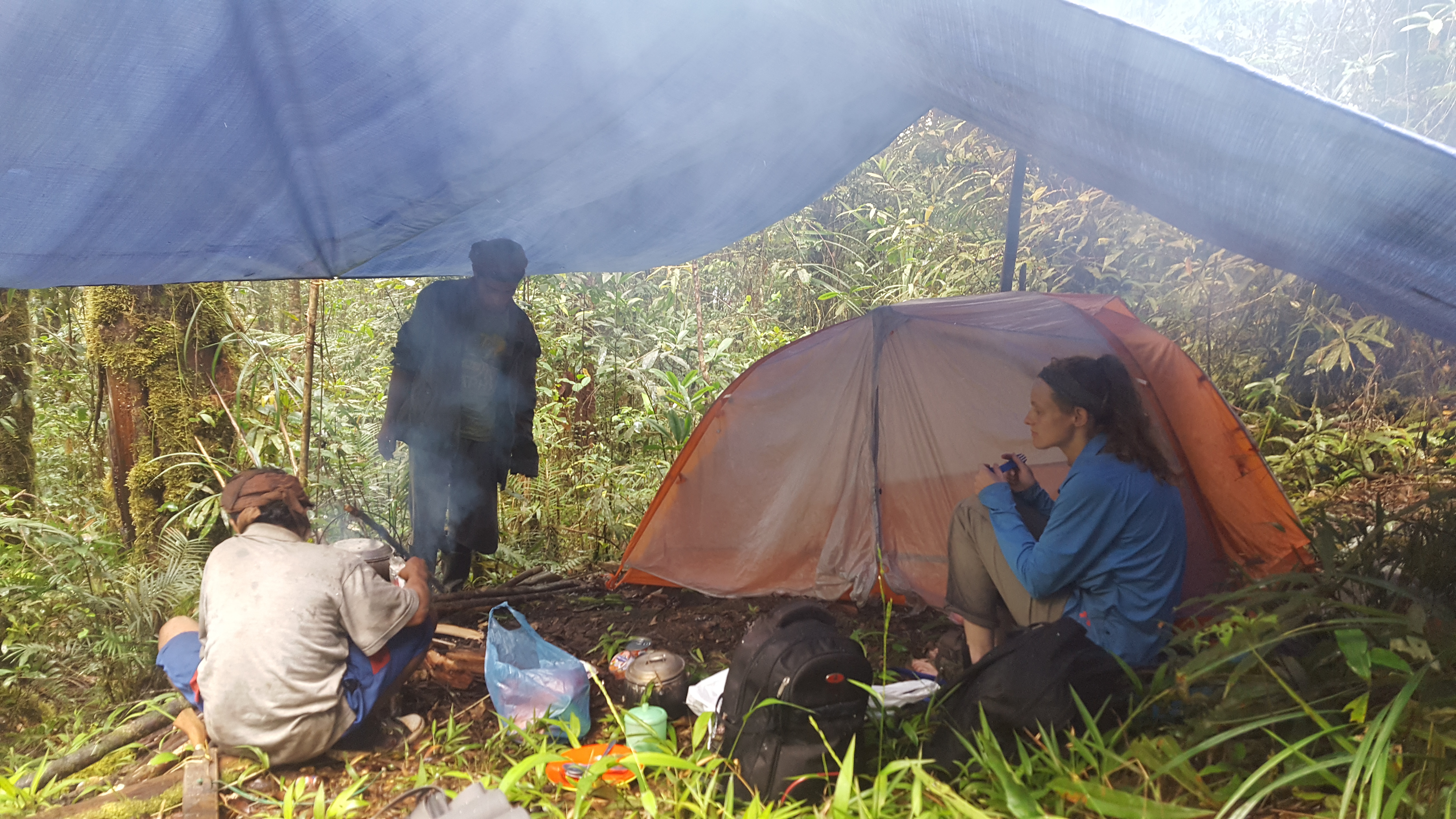 Thankfully it wasn’t long before we found a flat spot and decided that we would spend the night here, at 1450m elevation, just up from a stream and surrounded by pristine forest in hopes that we could continue up the ridge and get high enough for Madanga. We helped our guides set up the tarp that we had brought and then proceeded to set up our tent underneath it. The blow up Thermarest air mattress, Marmot sleeping bag, and Thermarest pillow I brought along to make my night of sleep more comfortable were snuck into the tent before they could see what they would likely deem “unnecessary luxuries.” Our guides simply slept on the ground outside.