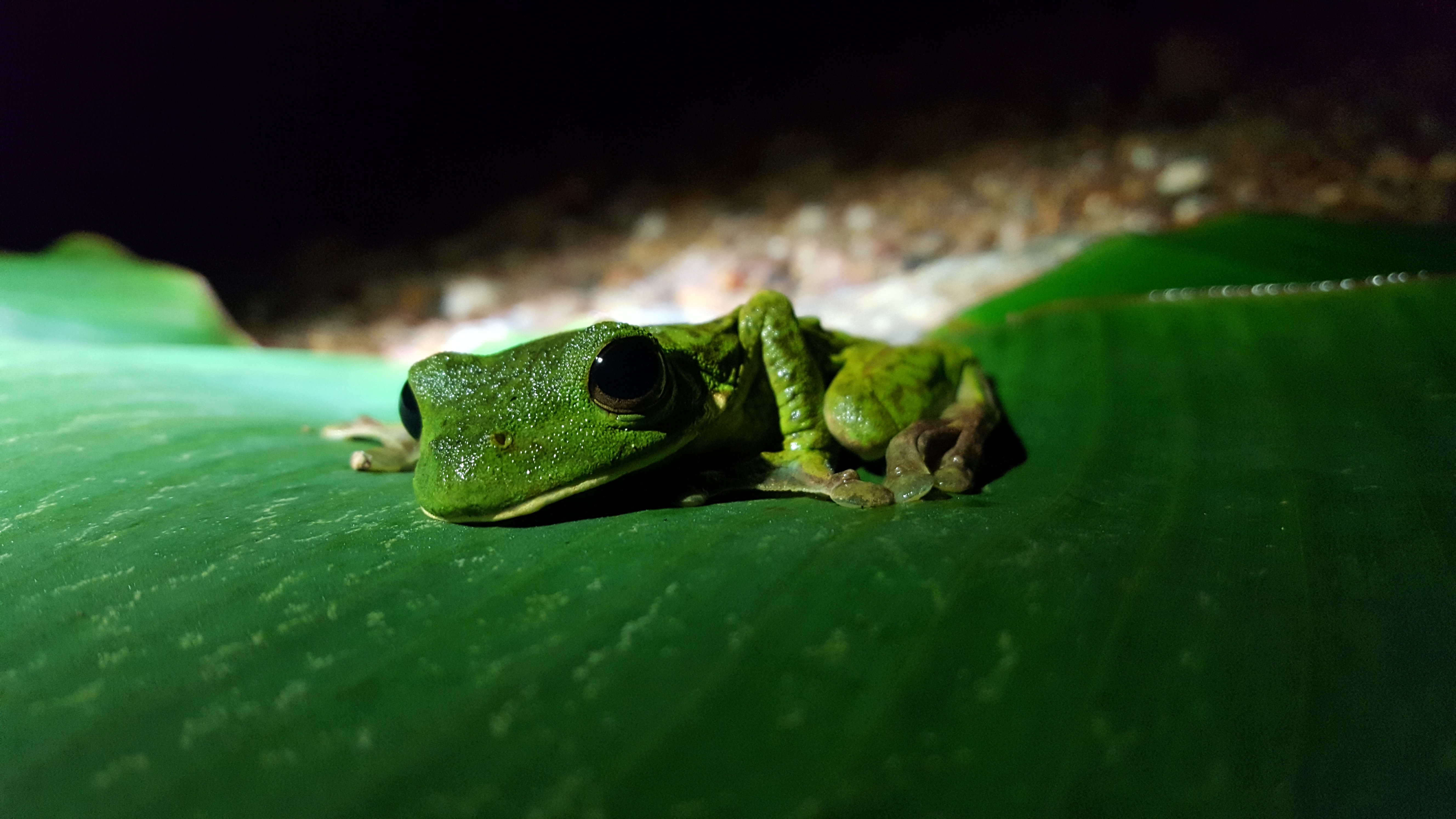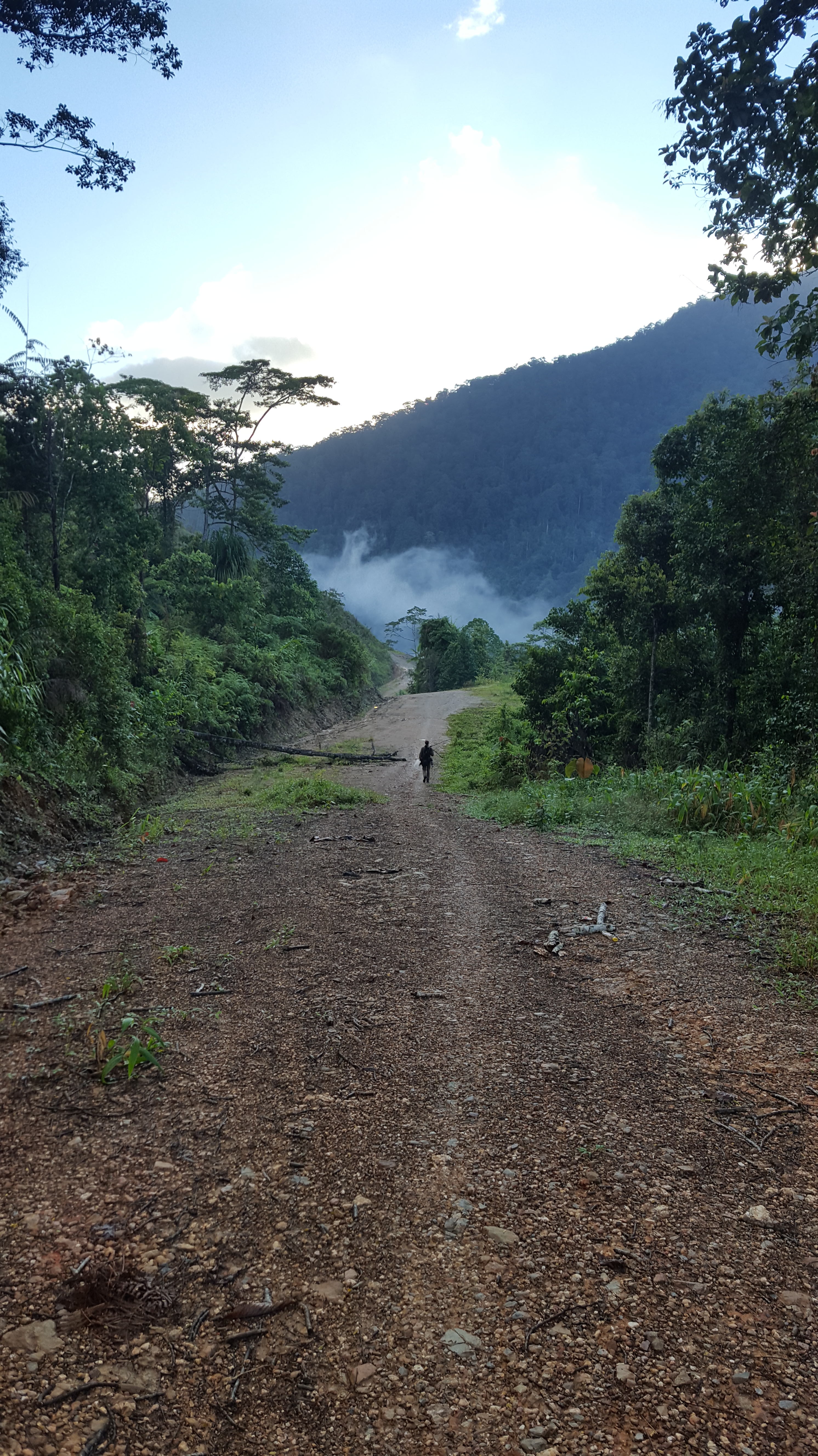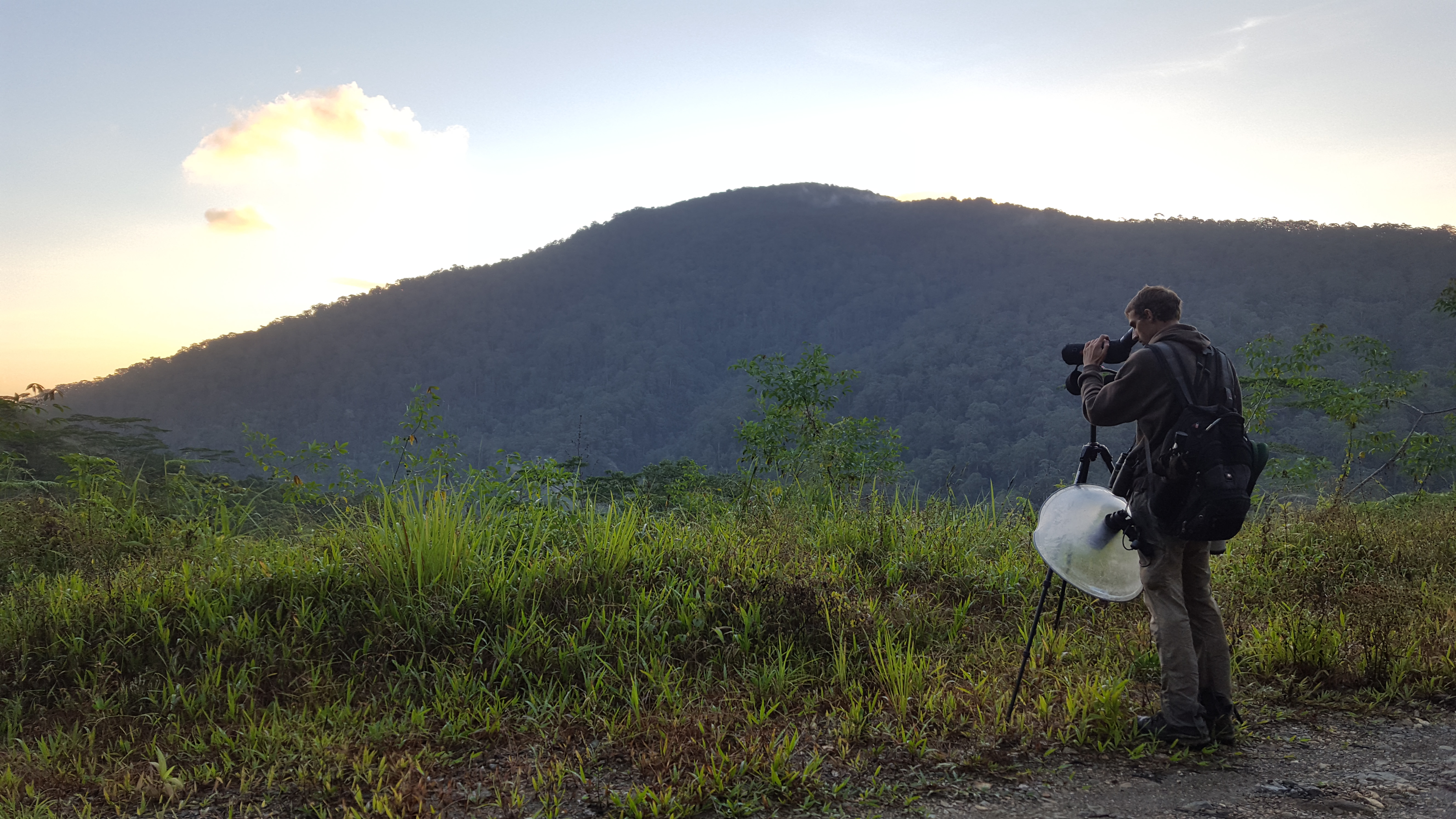 The next morning we packed our bags early and started back in the same direction as last night with the intention of birding slowly back to the pick-up point, a 3-hour’s walk away. We coordinated that in exchange to keep the nice tarp one of our guides, Ronnie, would carry my bag and the village leader’s son, for a small fee, would carry the other. We didn’t get much sleep that night. We were out late trying for owls and then started walking at 3 o’clock in the morning so as to continue trying for this darn Hantu Boobook! Ross who typically never puts a tape on repeat was getting desperate and started playing the boobook call more frequently. Have I mentioned that this tape recording was rather strange? (Hint: I did.) Anyway, the recording consisted of a very loud call and a much softer call in the background. We didn’t know which call was actually the owl. We figured it was the more prominent of the two calls, but the more prominent call didn’t match the description given in the book of how this owl should sound. Regardless the author of this recording is very a reliable recordist so surely he wouldn’t have it mislabeled. We continued playing the boobook and in doing so apparently called in a Black-lored Parrot. As it flew over calling back to us, we realized the “owl call” was indeed the background noise and that the main recording was definitely a Black-lored Parrot! To put it into perspective, we knew this nocturnal parrot existed but birding groups rarely seem to see it. It’s nocturnal and it’s a parrot. AKA a nearly impossible combination! We’ll take it!