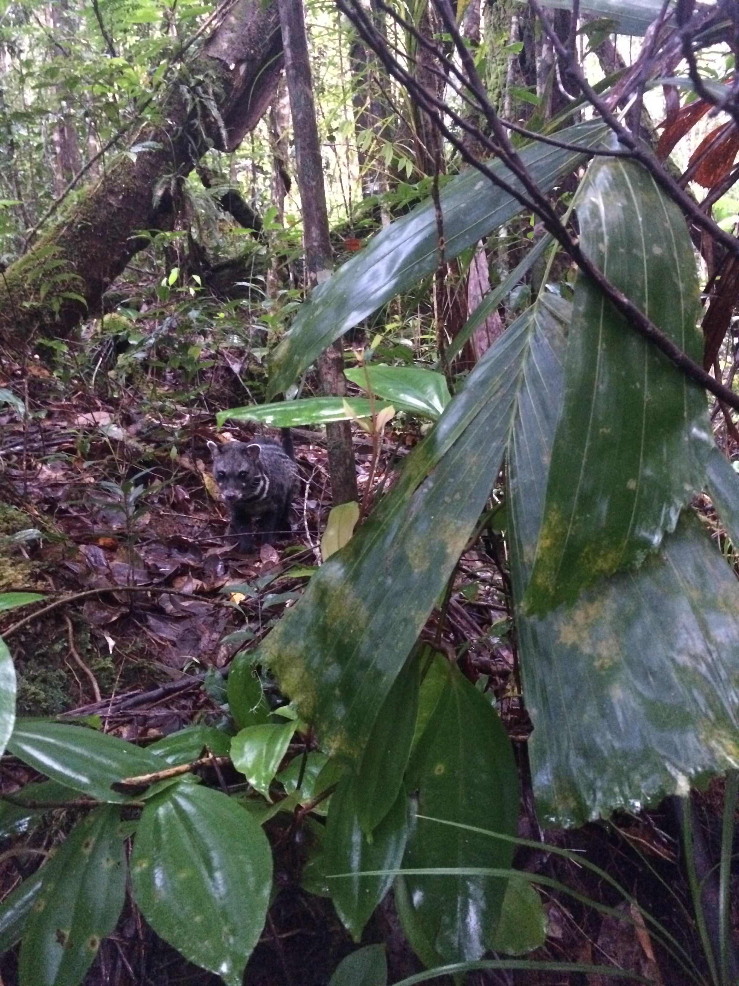 The following morning we set off up the mountain. The trail was very steep but was pretty manageable and in most parts very decent for hiking. We were impressed that we gained nearly 200m in only a short distance. We took the morning slow and birded our way up which worked well for our guides because they could take multiple smoke breaks during the steep sections. At one point we stopped in a small gully when we heard a Buru Pitta calling. Ross and I had our guides wait and we crawled into the brush to play tape. Apparently a Malay Civet thought he was about to have a pitta breakfast and came sneaking up behind us thinking the tape we were playing was a real bird. We turned and I kid you not, the civet was 3 feet away. We certainly weren’t the meal he was expecting. He froze and Ross snapped a few pictures on his iphone before the beautiful black and white printed mammal scurried away. Photos on Ross’s 100-400m lens would have been much higher quality, but the little guy was probably too close to get a shot in focus anyway! The pitta never came in so we continued walking. Buru Thrush and Buru Grasshopper-warbler proved to be vocal and we managed several sightings of those two targets.