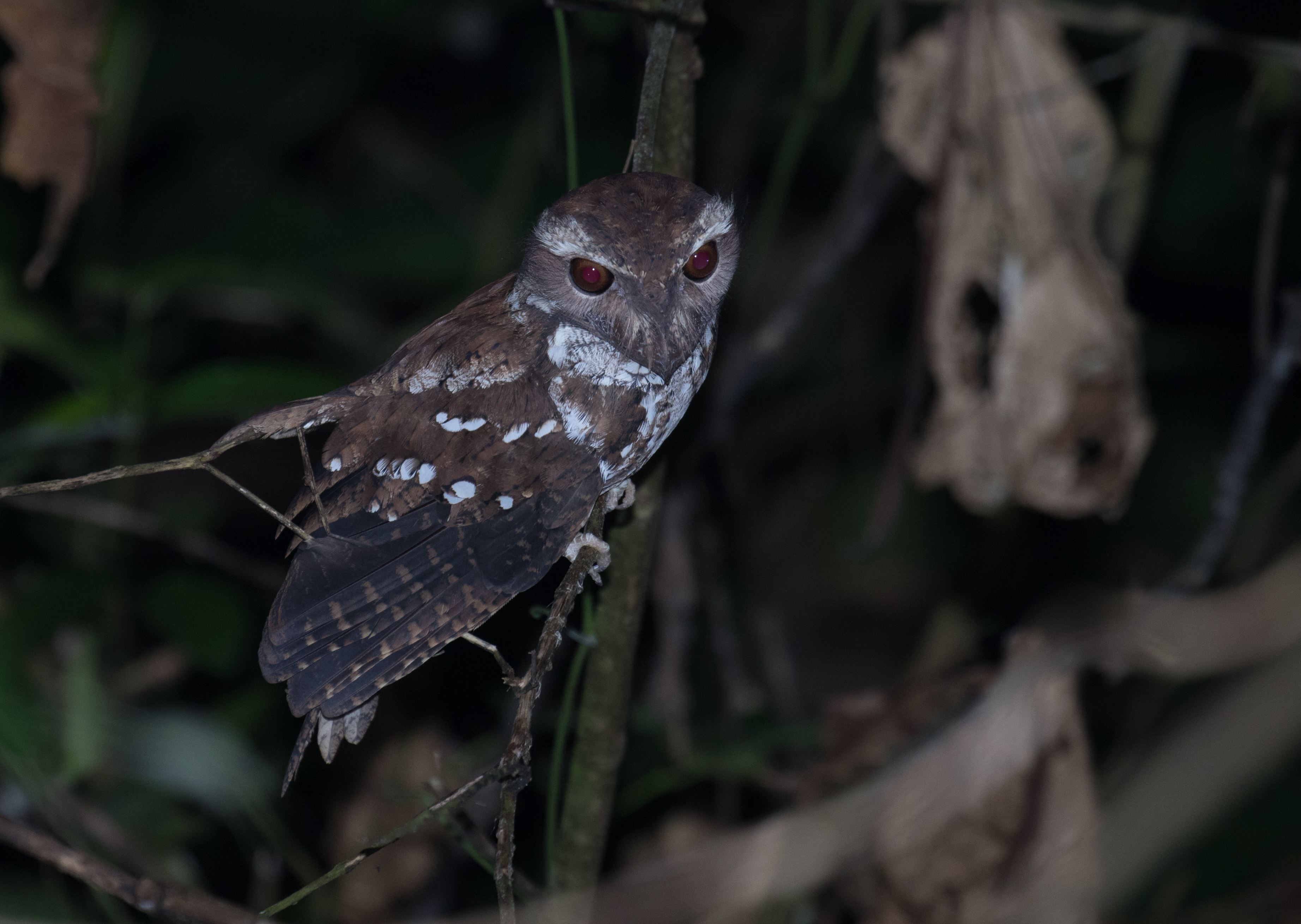 Upon arrival, we dropped our bags and hit the road to do a little birding. We hadn’t even made it to the road when we saw a group of four guys walking with scopes, cameras, and binoculars in tow. It was obvious they were visiting Raja Ampat for the same reasons as we were and we soon learned this was the independent Swiss bird group that our Swiss friend Julien mentioned to Ross when he told him we were visiting West Papua. It was also the first time that Ross introduced himself to someone and they took one look at him and asked if his last name was Gallardy! (Thanks for that David – it was too good not to share!) We joined them in walking the road and picked up a few birds with the highlight being a Hook-billed Kingfisher that was briefly spot lighted just as it was getting dark. Evening turned into night and day birding turned into night birding where we focused on finding one of two frogmouths in the area, Marbled Frogmouth. (The other target frogmouth happened to be on a day roost near our homestay that we could easily tick later!) It took a bit of effort, but eventually Ross managed to get a responsive bird to come in close and we all had excellent views of a Marbled Frogmouth eye-level to where we were standing.