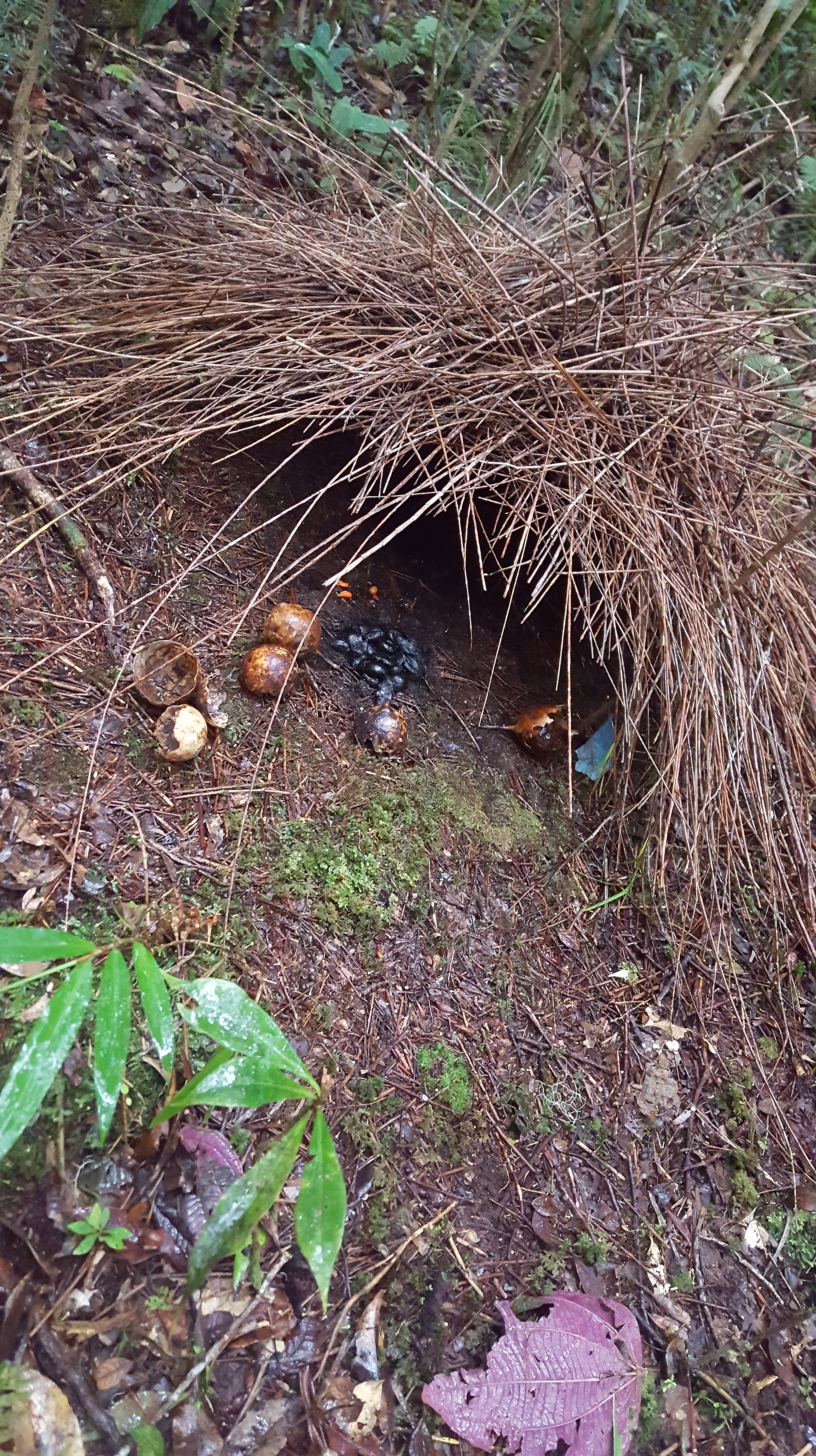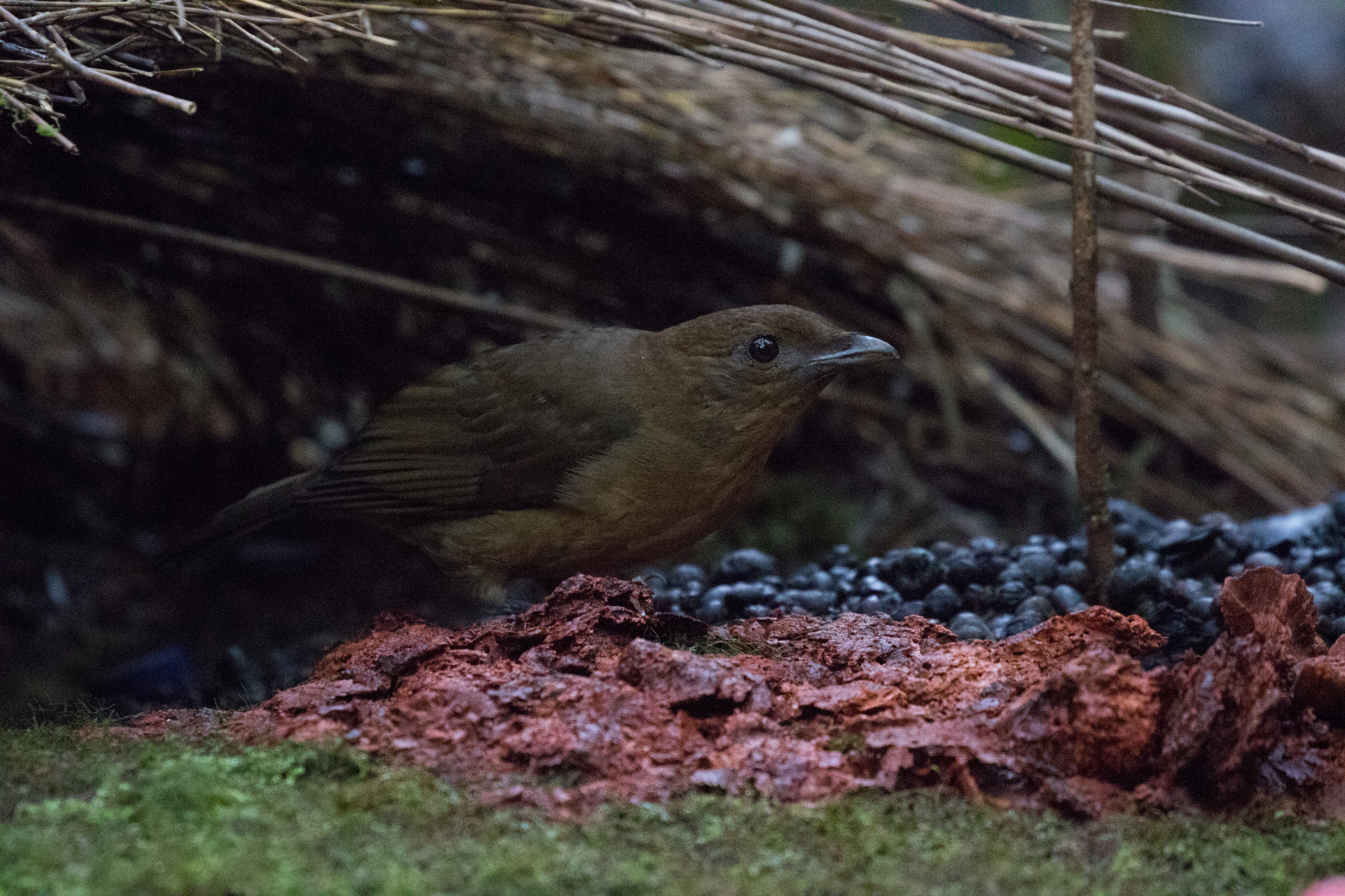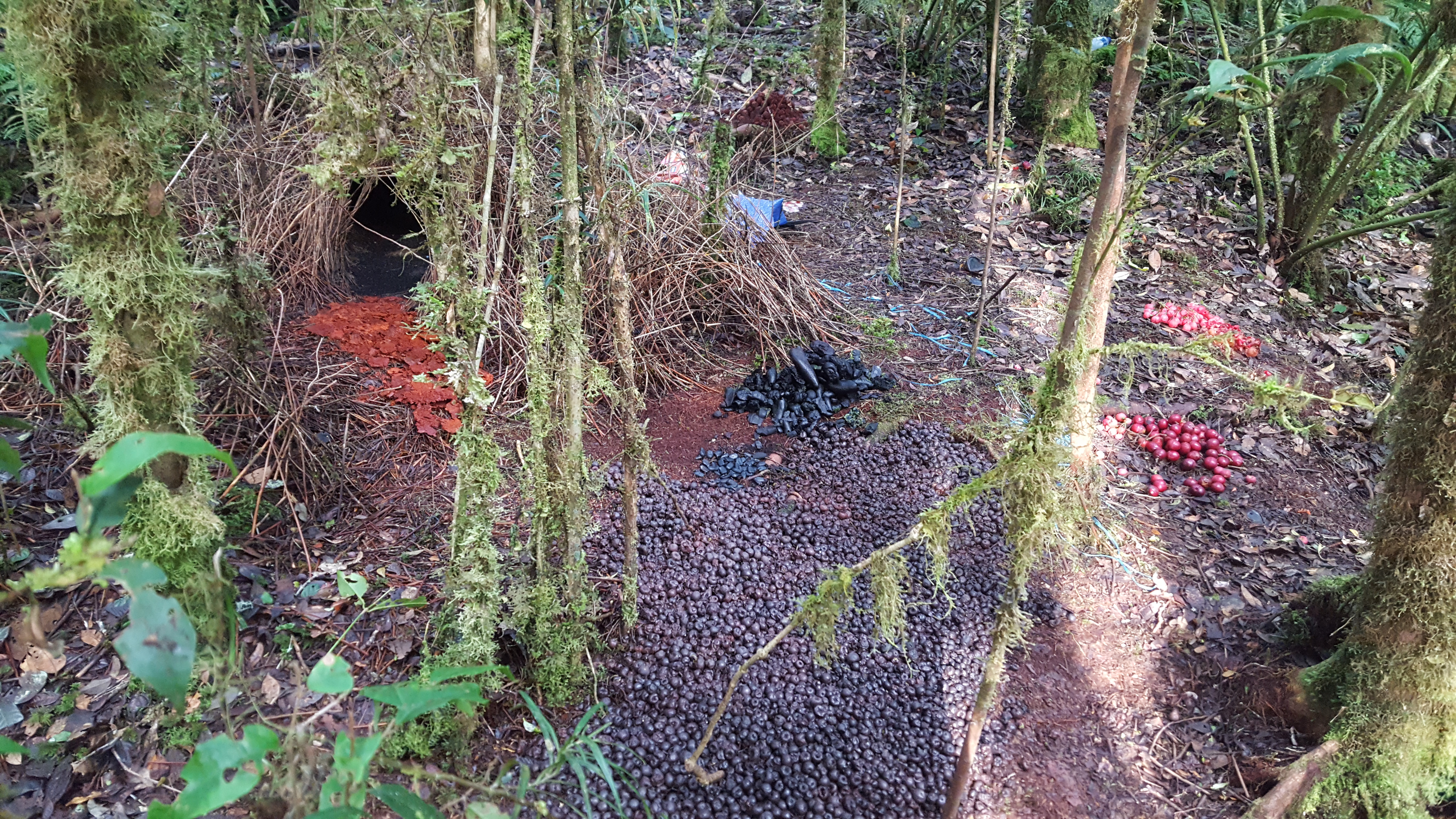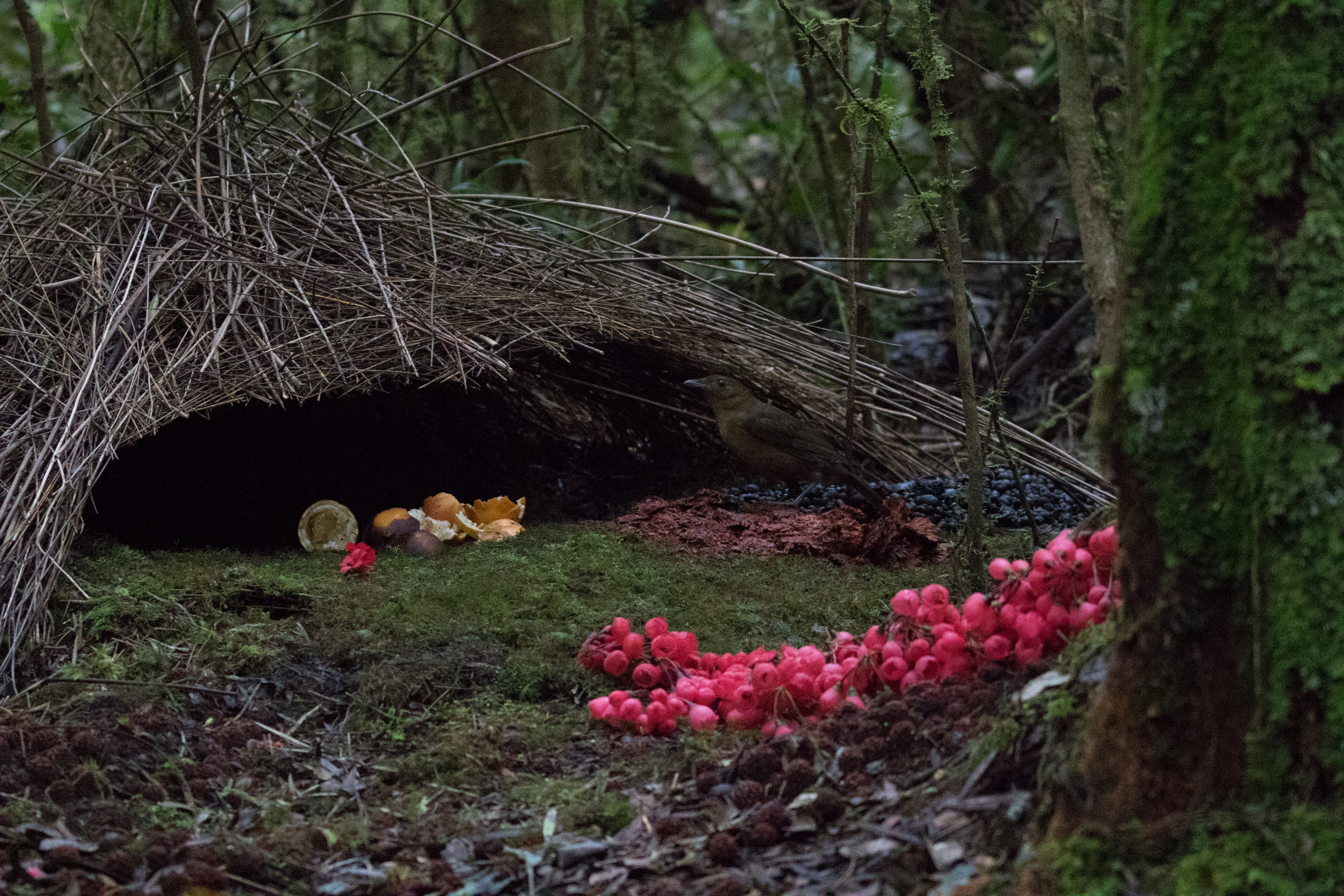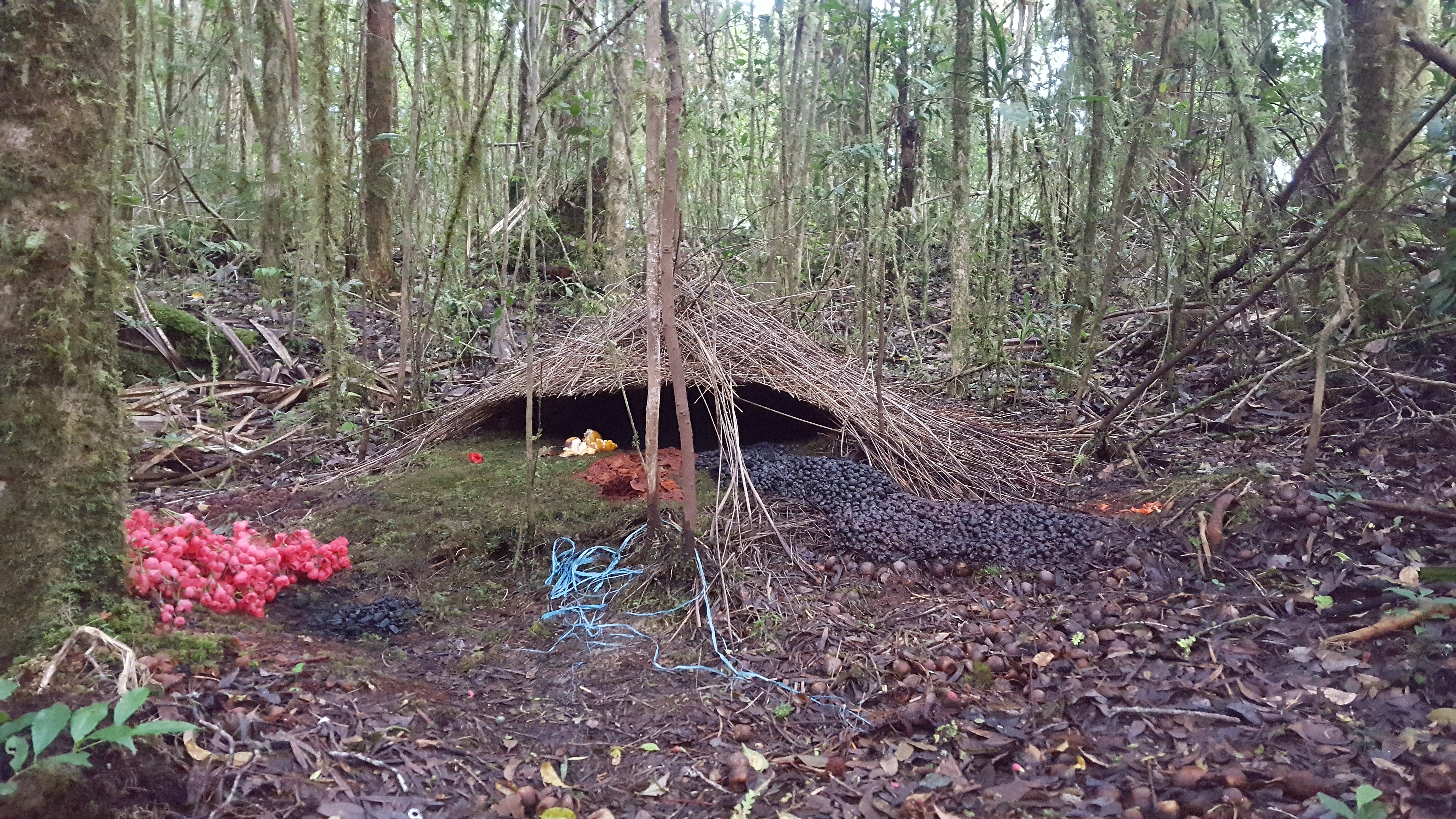 Claudia and I walked back a bit before the guys and sat in a Voglekop Bowerbird hide and watched as a male came in to make sure everything was spick and span. This little guy is quite the architect and landscaper. Just seeing the structure he built and the colorful organic materials outside was super impressive. Small pink flowers piled up next to a bunch of dark black beetle carcasses with burnt orange mushroom walkway all made for a very nice garden. Later in the day the guys joined us in the hide but the bowerbird had gone away and didn’t reappear until after we had been kicked out of the hide by one of the Koreans. We didn’t realize at the time that only one guy was taking over the hide because we certainly could have fit into the other hide that had been built next door instead of walking to a very unimpressive bower where the bird never came in. When we did find out that the other blind was empty we did sit inside and have nice views of the bird at his structure.