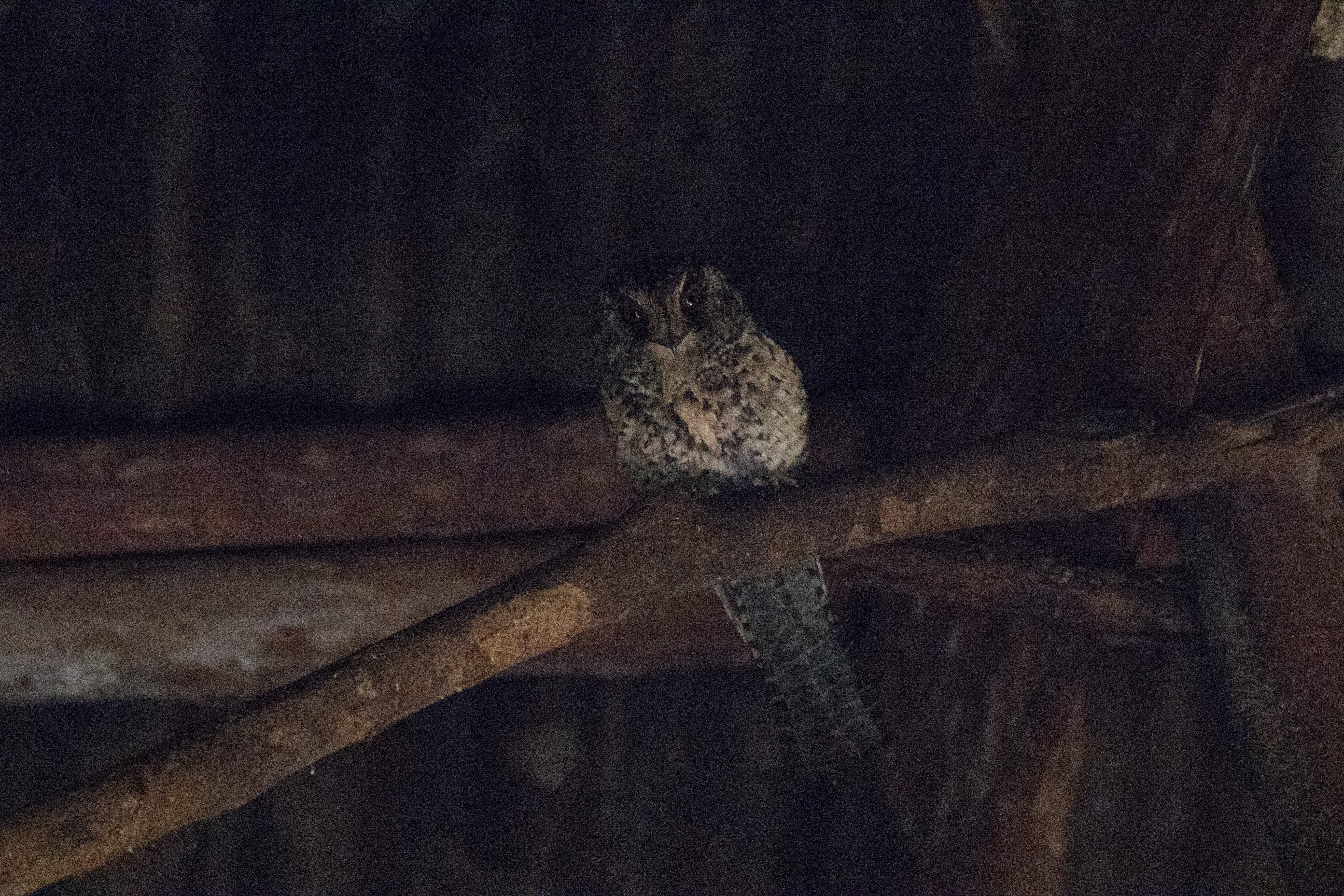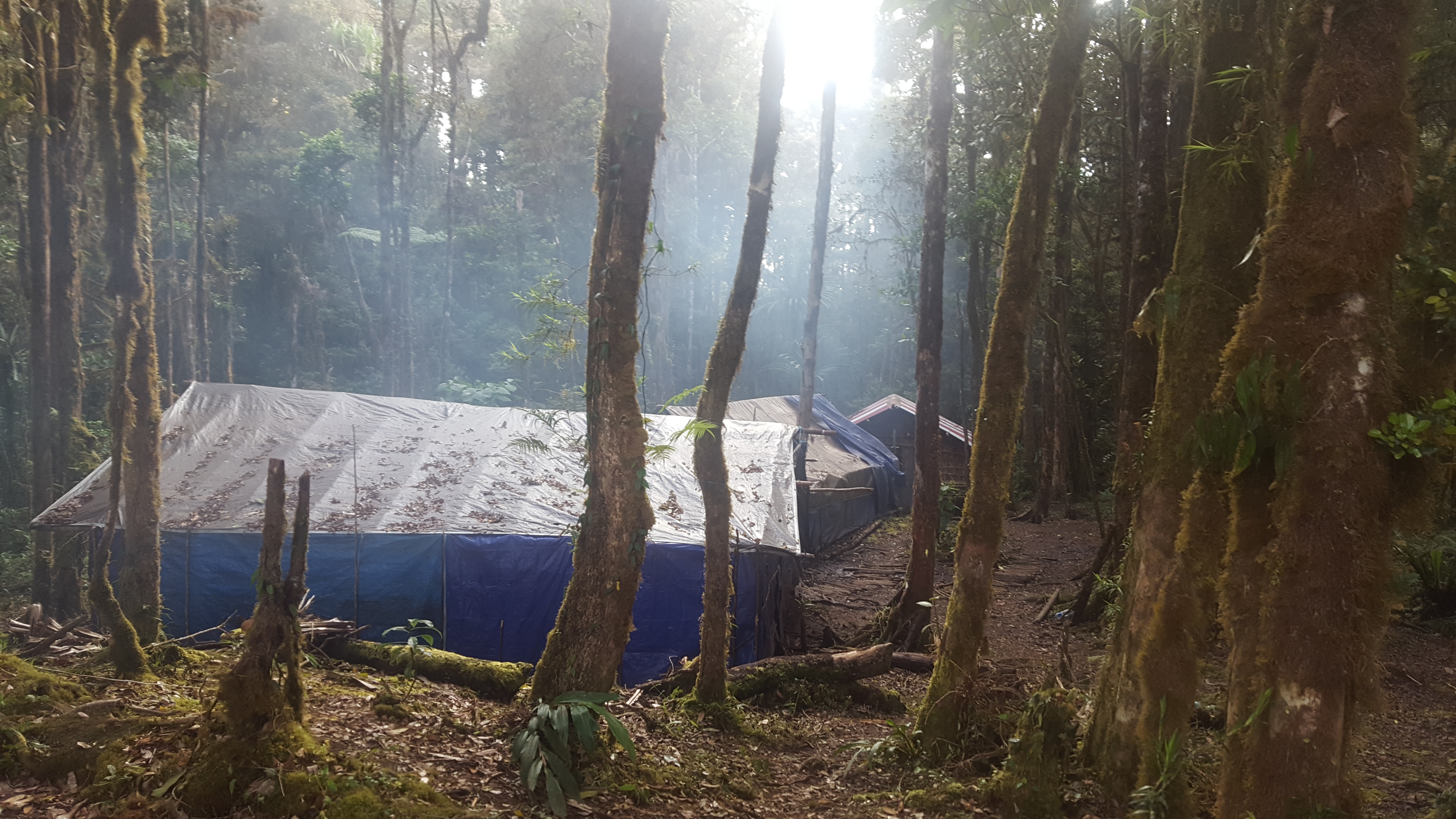 The next morning we woke up early and made our way up the steep trail to sit in a Western Parotia BOP hide. Just as we all sat on the bench, it broke! (I guess the ‘blind fee’ doesn’t go towards maintenance like it should…) Despite the lack of bench we hung out in the blind waiting for a Western Parotia to come in and display to any females in the area. Unfortunately the Western Parotia that we had was not even interested in picking the leaves up off of his once clean patch of ground, let alone dance. We still could see him very well and hoped to sit in another blind later on. From the blind we birded the trail back down to the homestay not seeing much except a Green-backed Robin, Long-billed Honeyeater, and Large Scrubwren. That afternoon we hiked up the mountain towards our destination known as ‘German Camp’ taking our time and birding the trail slowly. It was a very productive afternoon having views of Modest Tiger-Parrot, Marbled Honeyeater, Mountain Meliphaga, Vogelkop Scrubwren, Tit Berrypecker, Long-tailed Paradigalla at a nest, and Lesser Ground-Robin along the trail. We didn’t arrive at the campsite until early evening. German Camp, as it is known, is a rather robust campsite chalk full of tarpaulin structures and pre-built platforms to sleep on found at a higher elevation where certain birds occur. That night we set up our tents ate a quick meal and headed out into the forest to try for the Feline Owlet-Nightjar that was not found on a day roost during our walk up. We heard a few interesting calls during the night and Ross managed to make a few recordings and used those recordings to call a Feline Owlet-Nightjar into the tree above us. Surprisingly the bird was much higher in the tree but when Stephan finally spotted it we all managed nice views!