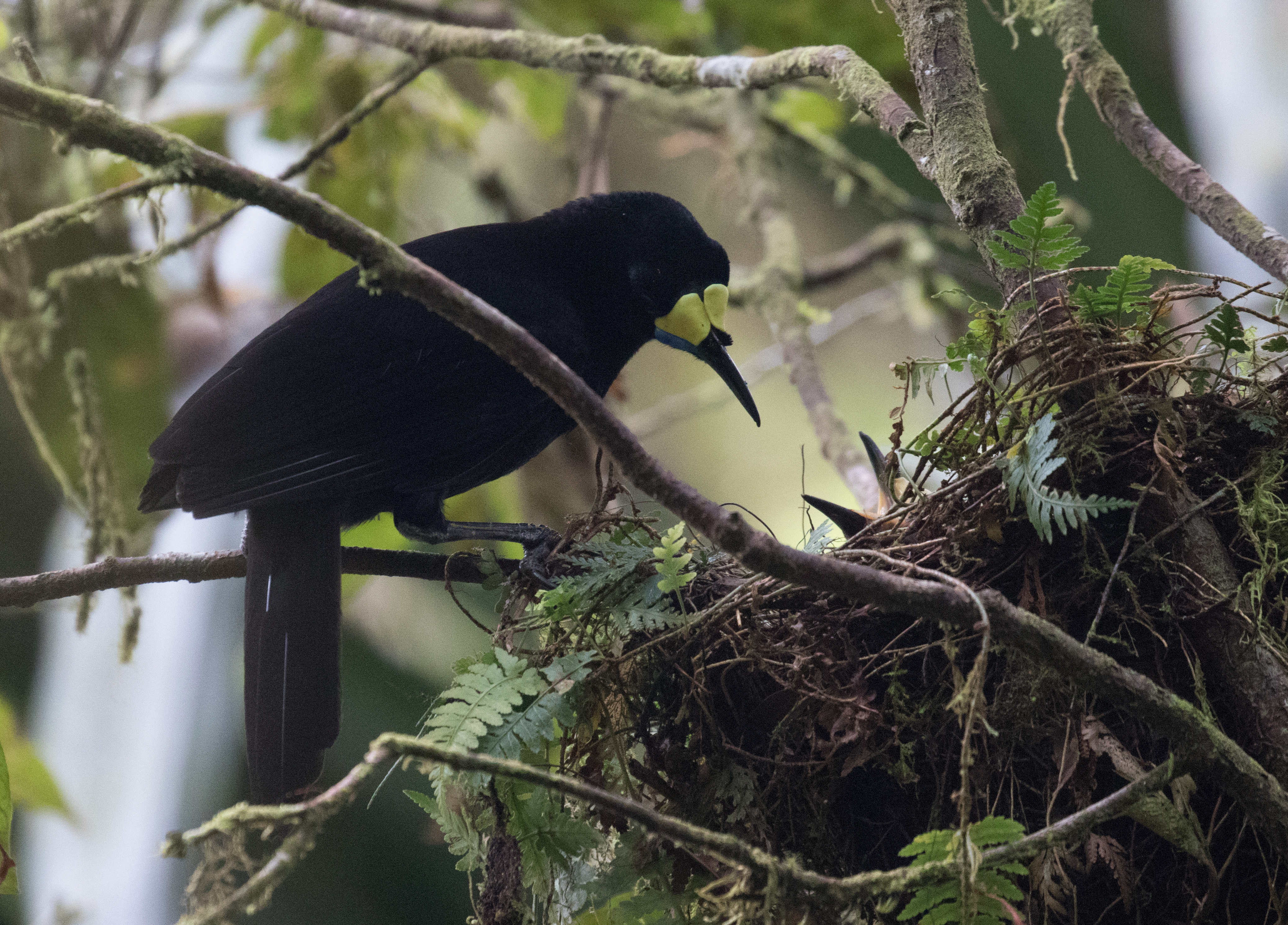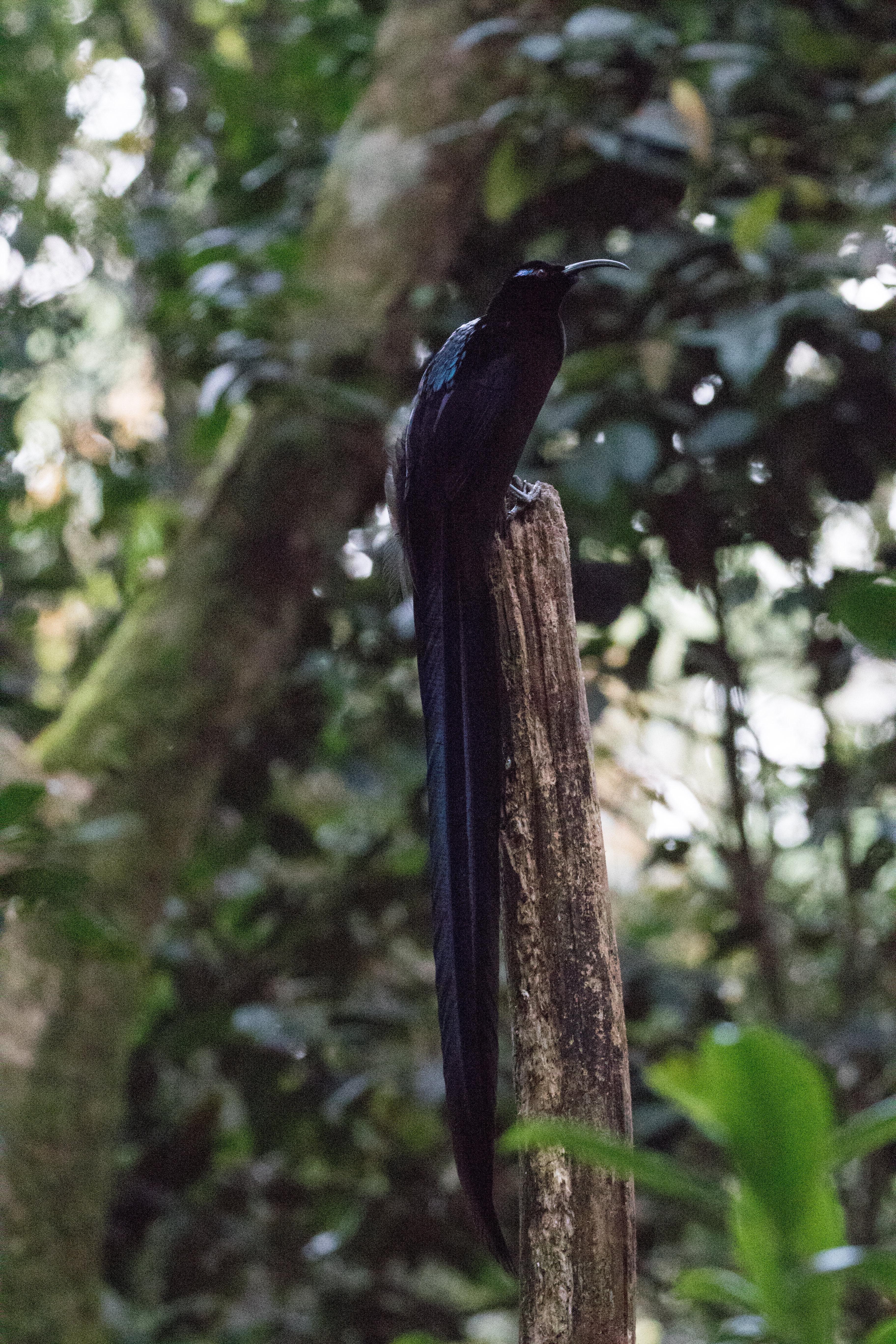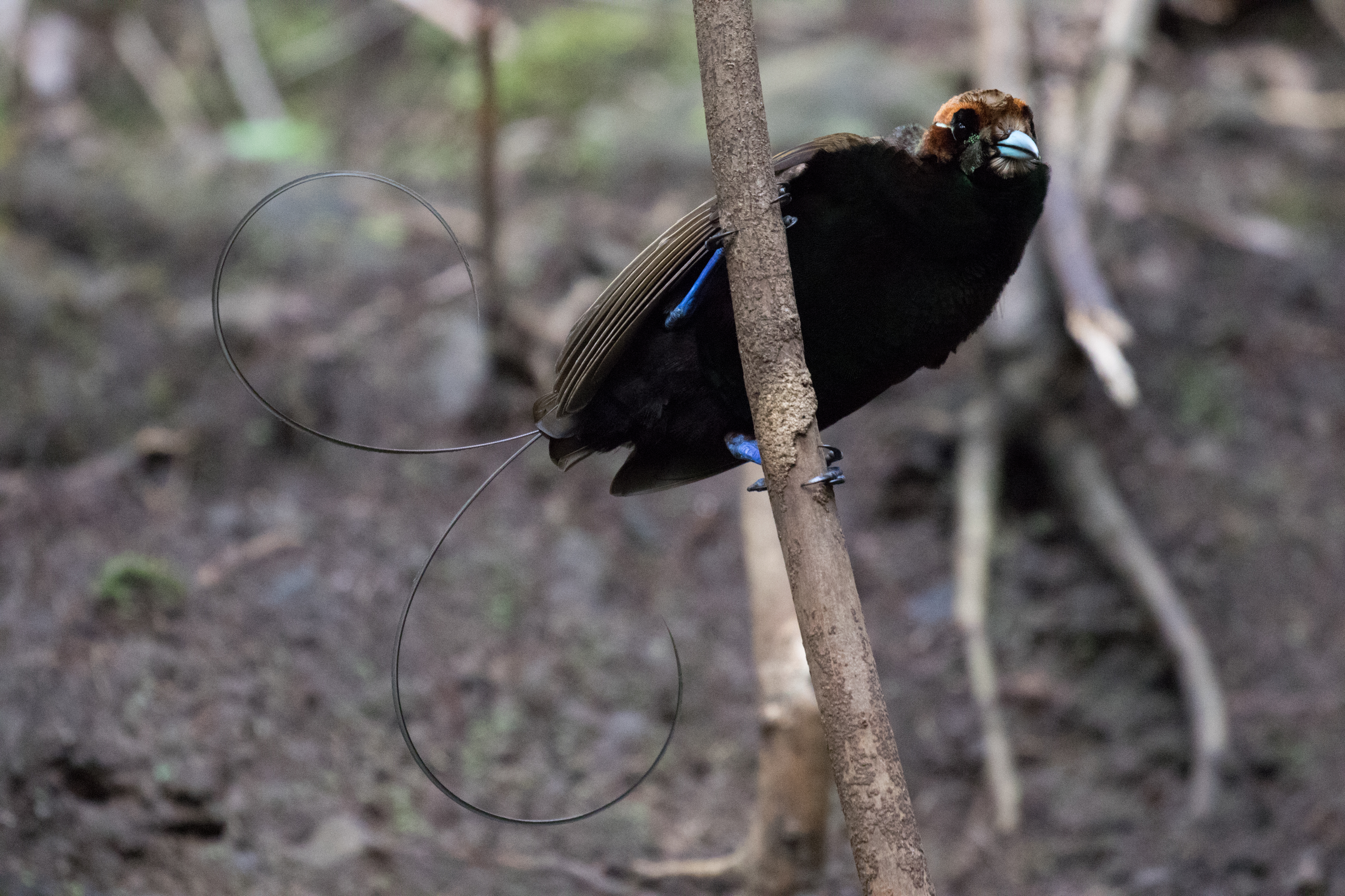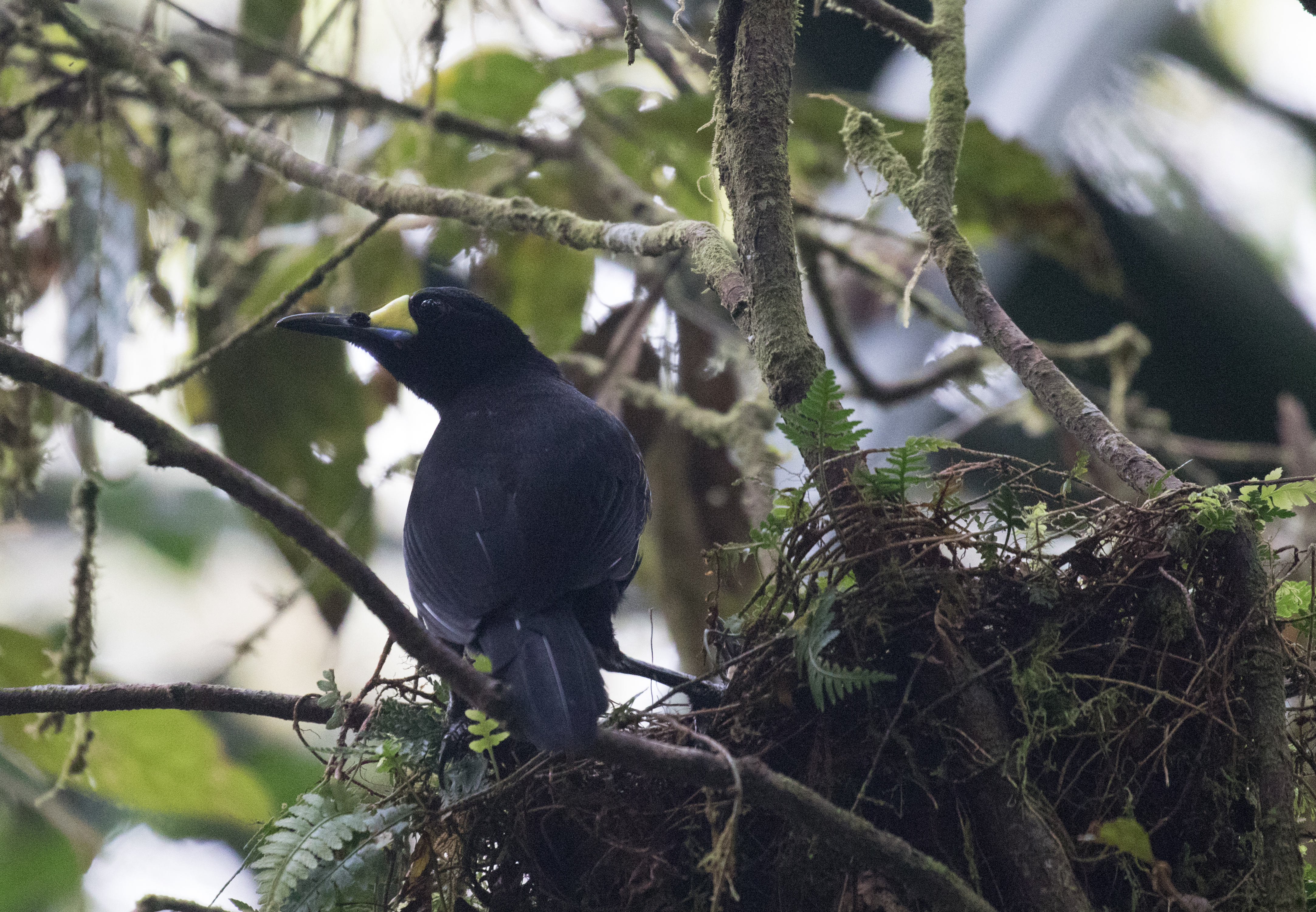 Arguably one of the best birds to get at the elevation of German Camp is Black Sicklebill, a large black bird with a very long tail that displays on the top of trees. There was a group of Korean men filming for a documentary on this bird so they pretty much had the blind booked but we had enough room to sneak in with them and watch as this massive Black Sicklebill came and perched on a broken snag calling at the top of his lungs. He didn’t do any fancy moves but just sheer size and length of tail was impressive enough. From the blind where we sat we also spotted Lesser Ground-robin and had perched views of a Modest Tiger-parrot who came into the exact area where the sicklebill was sitting. From the blind we hiked up a bit higher in elevation to an area known as ‘Japanese Camp’ but this camp is nothing more than a small clearing that may have once served as a campsite. The main target for this area was Arfak Astrapia and after about an hour of looking we finally saw a single Arfak Astrapia. We spent most of the day in the area around Japanese Camp and had a number of other good birds including Brehm’s Tiger-Parrot, Papuan Lorikeet, Cinnamon-browed Melidectes, Regent Whistler, Black-throated Robin, Smoky Robin, and a Spotted Jewel Babbler sitting on a nest. Despite finding many new birds we never had even a glimpse of Dwarf Cassowary which is very shy and very rare.