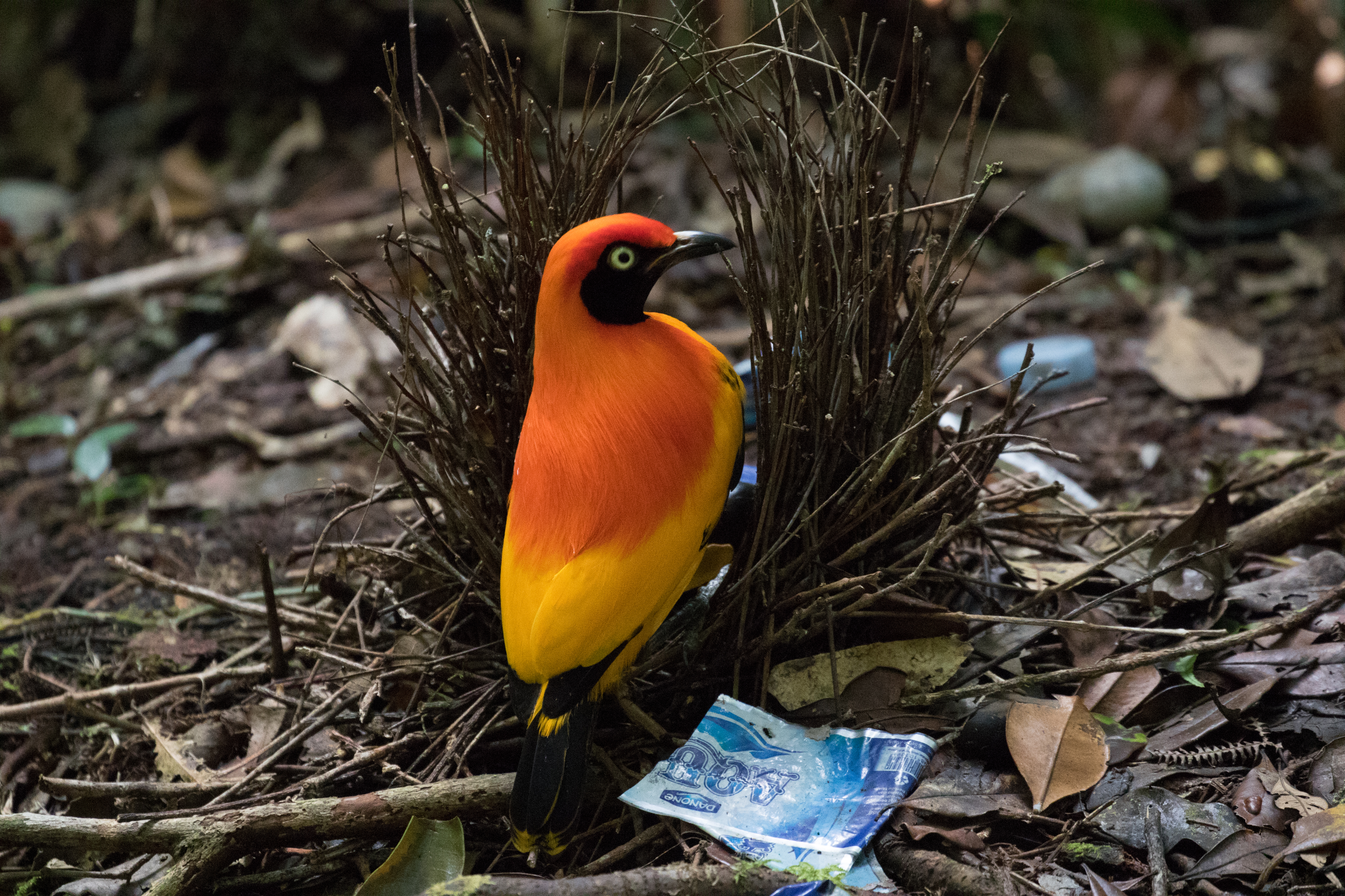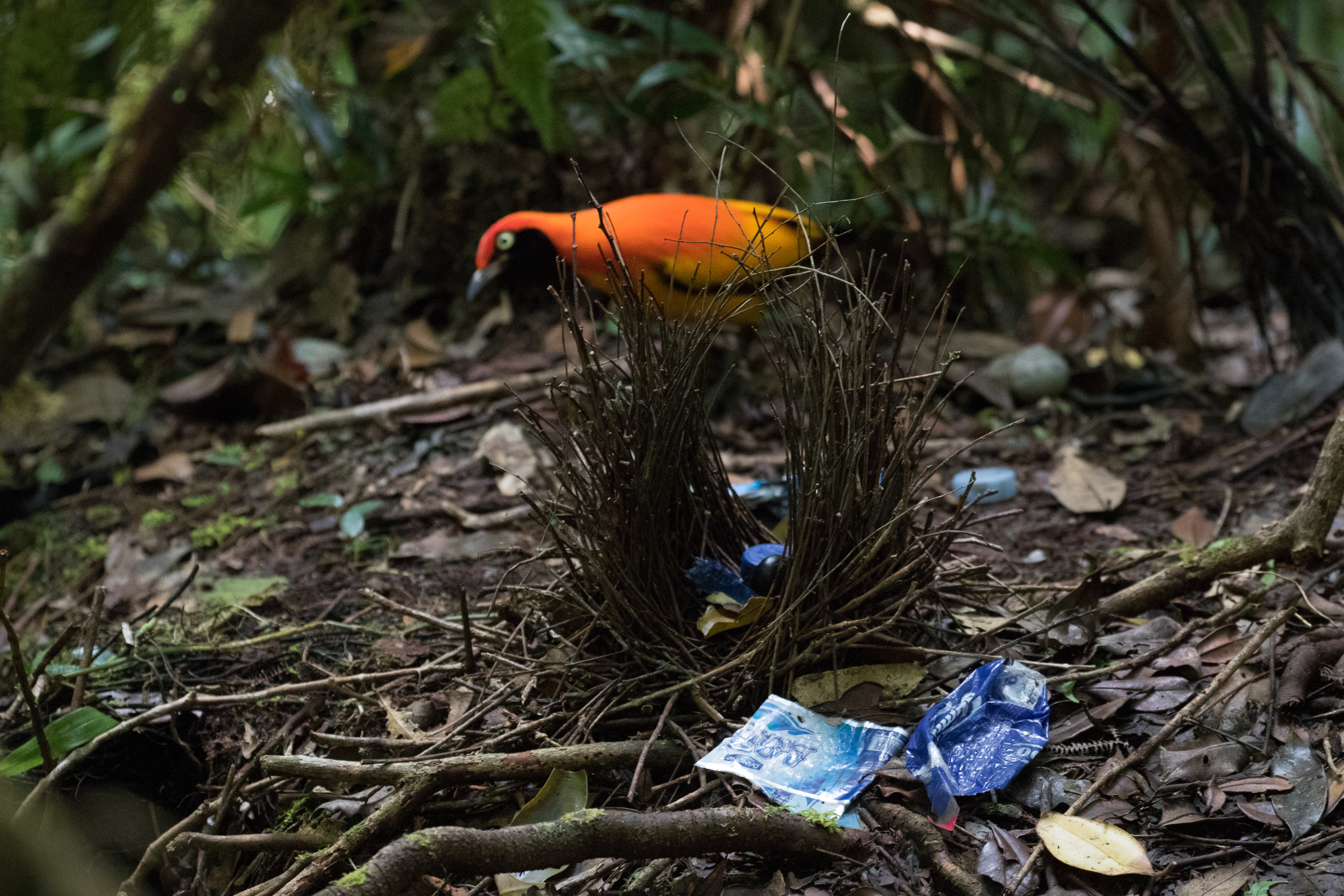 When we arrived to New Camp we found that the trail to get down was super steep, muddy and downright dangerous. New Camp is in fact new. Zeth informed us that he only started setting it up two months ago! Already we had a successful trip and surely this site will make it onto the birding circuit in no time! Camp as we saw it was basic but we set our tents up under the tarps and were lead away to a Masked Bowerbird hide that Zeth created. Unfortunately getting to the hide was a bit of a challenge and was much further than we anticipated but after we arrived and sat down into position we were treated with excellent views of the stunning orange and black Masked Bowerbird who came to do some maintenance at his bower. This bowerbird has a tendency to decorate its bower with blue items. Unfortunately nowadays a lot of blue that they find is plastic and his bower wasn’t exactly as beholding as he had hoped. I’m sure a female bird might beg to differ.