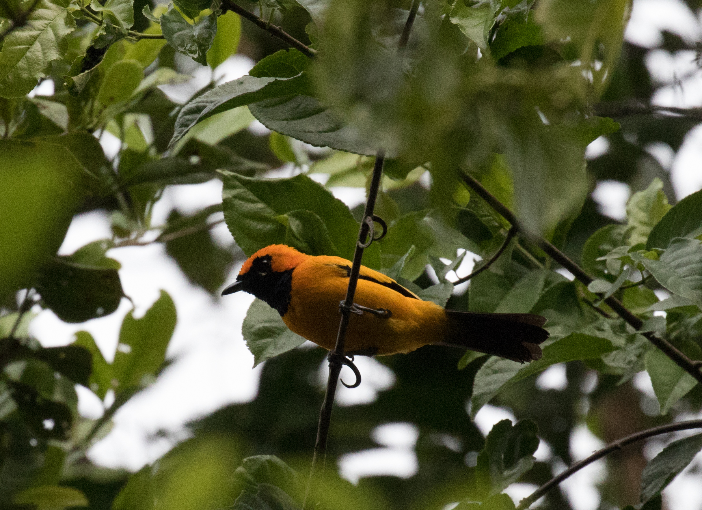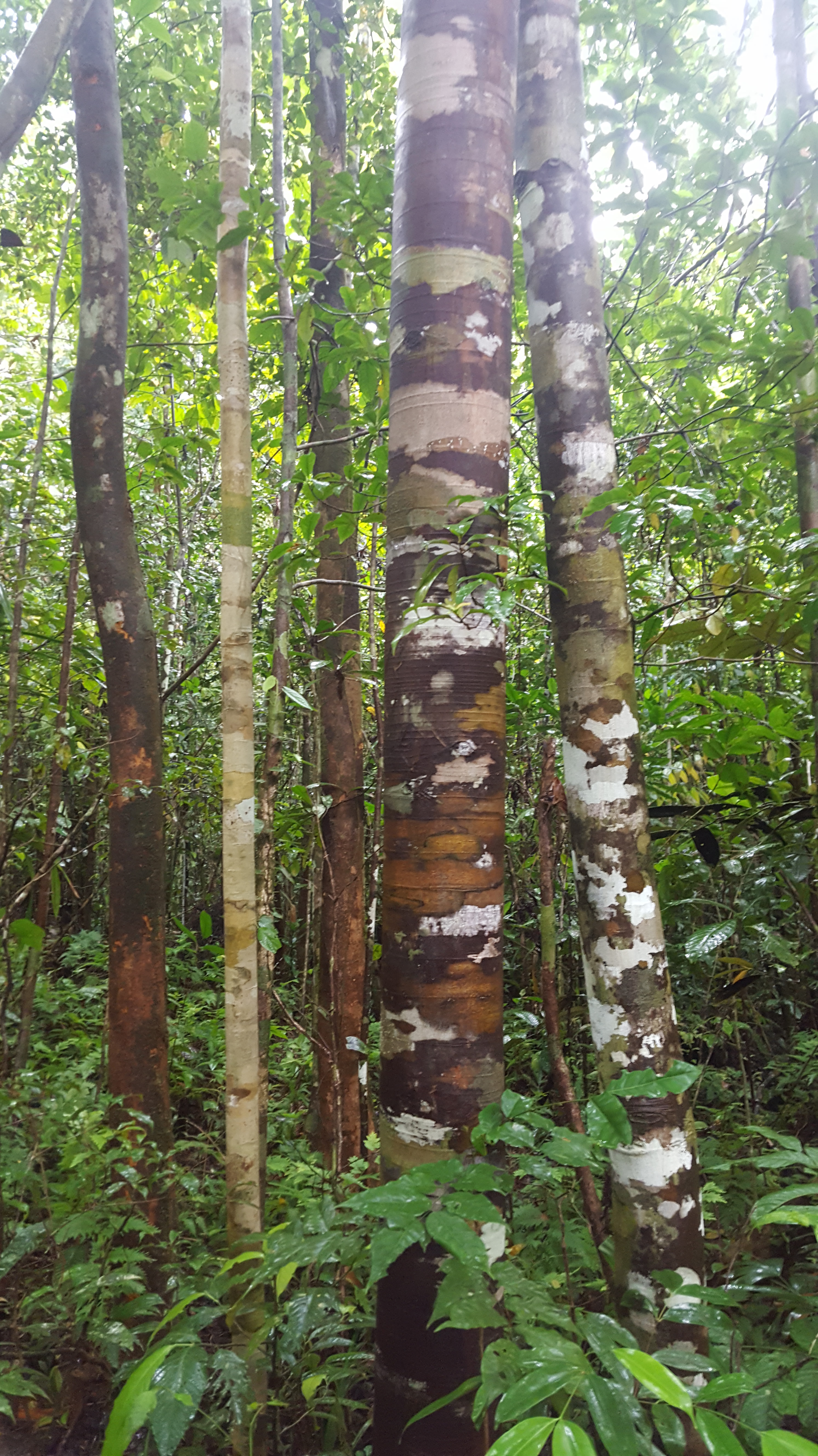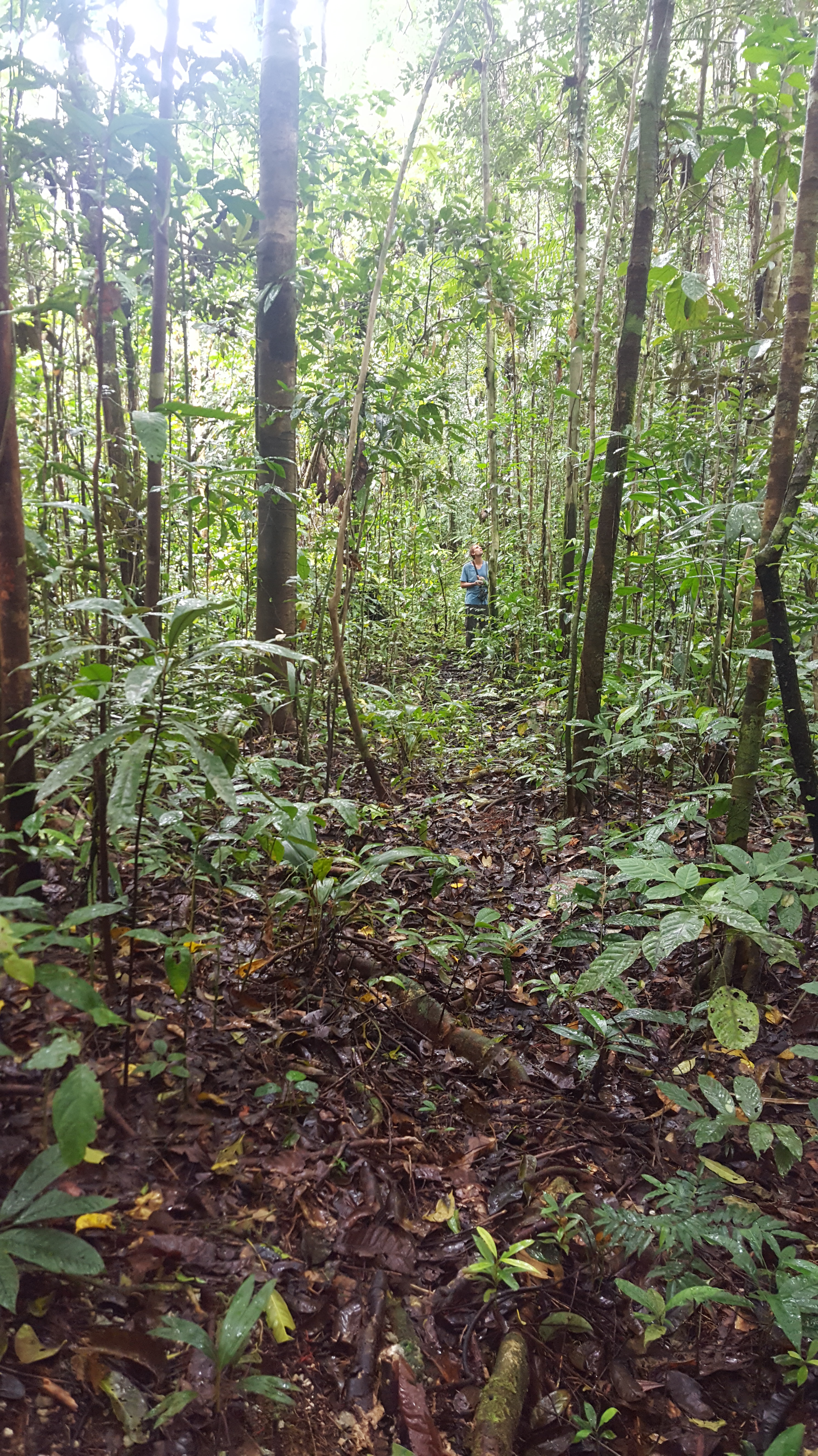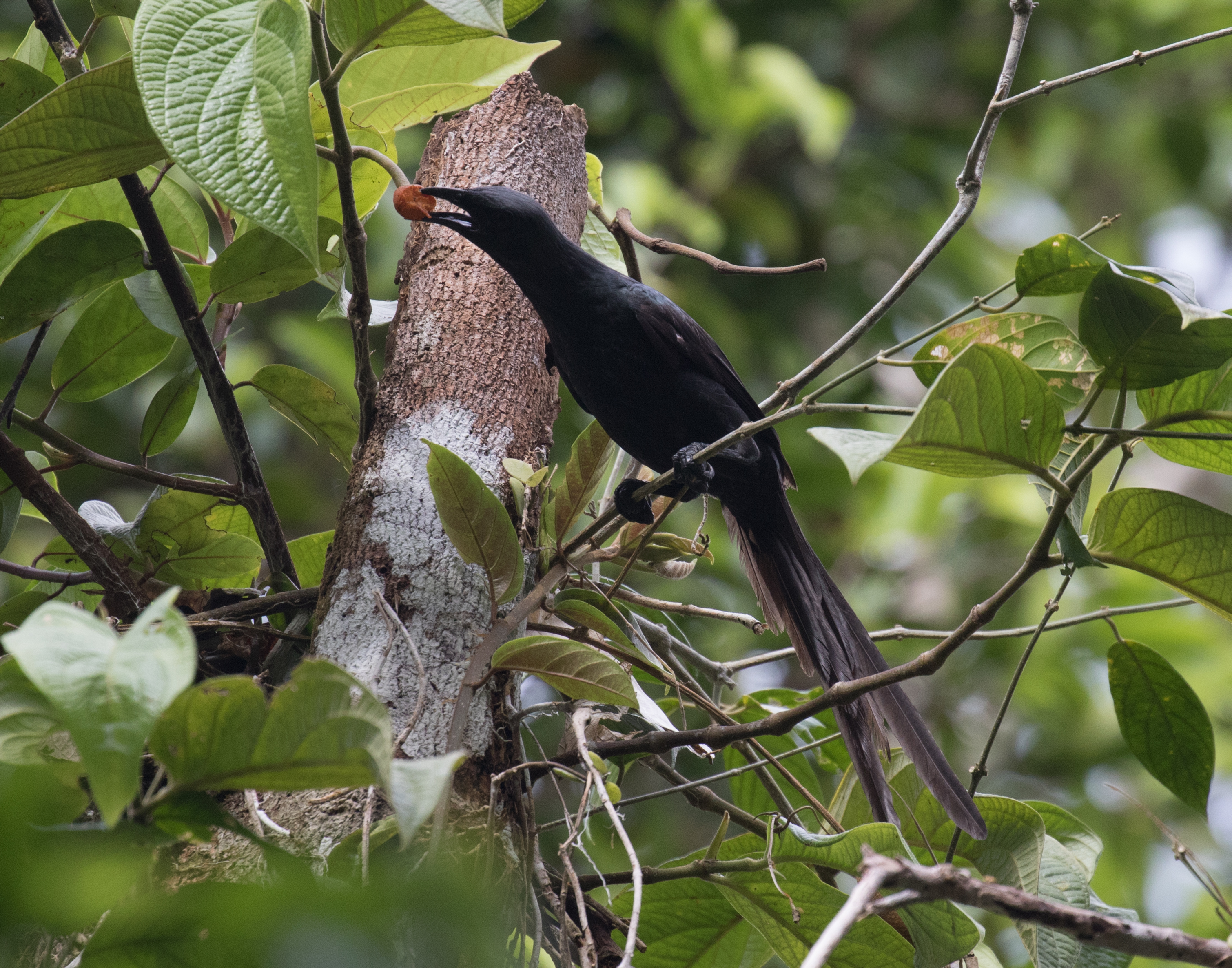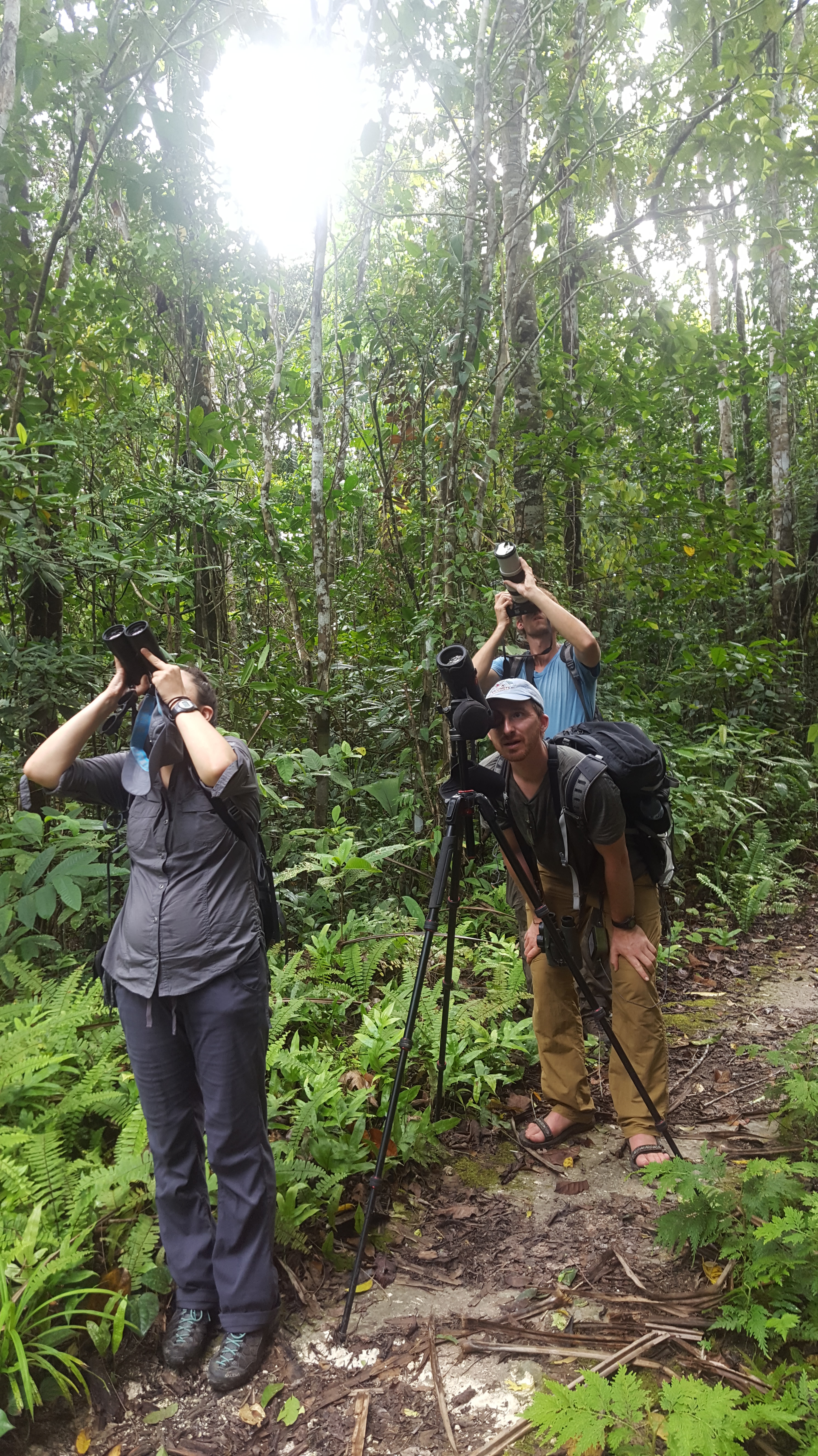 Surprisingly only two targets remained for Stephan and Ross, Biak Coucal and the local ssp of Drab Myzomela, but they would happily take better looks at Geelvink Pygmy-parrot if given the opportunity. Biak Coucals are large birds, ones you wouldn’t think would be hard to miss, but although we heard at least two dozen over the course of our time in the area, we still hadn’t seen one. Each time a bird sounded close we would sneak into the forest after it and just when we thought we were standing under the exact tree the bird was in, it would shut up and another (likely the same) bird would call from far away. We had no idea if these darn things were flying out unnoticed or simply shutting up and sitting still. We noticed that the vast majority of people visiting Biak, at least those whose trip reports we were reading, had these as a heard-only. These things seemed to not be noticed by anyone! We walked all morning chasing into the forest each time we heard one call but each time no such luck with actually seeing the bird. Most times we dashed into the forest Claudia would remain on the trail happily content with photographing the crazy insects, and 9 times out of 10 Stephan joined Ross when he would go running into the forest after a coucal. Soon Ross became adamant that the birds that we thought were “close” were in fact much further away than we thought. So instead of stopping at the obvious distance, he was going to continue into the forest and at one point dashed into the forest with only me behind him. It was that 1 out of 10 times that Stephan decided to stay back on the trail with his wife that I spotted the all dark and skulky Biak Coucal sitting in a tree. Ross also managed decent views and soon the two of us started whistling the ‘we have something good’ whistle. Stephan comes running in. The coucal we were watching creeps up the tree and jumps into the open but ducks behind a leaf just when Ross snaps a photo. When Stephan was no more than 3 feet away the bird jumps away before he catches a glimpse. Funny how that always seems to be the case. And this was when the rain began. Ross went to put his camera away while Stephan went walking down the trail after the bird. We all meet back out on the main trail and Stephan and Ross, determined to see this bird and see it better, go back in. It began to rain harder and harder. Claudia and I sat huddled under our umbrellas thinking how crazy these avid bird-watcher husbands we have are. It had to be at least 30 minutes before the two of them come out of the forest soaking wet but smiling with success. Or at least Stephan was smiling. Ross never saw the bird again and apparently, as the story goes, he yelled to Stephan that he was going back out to the main trail at the same time that Stephan was whistling that he was looking at the bird. Neither of them heard each other. Both of them ended up very lost on the small identical trails deep in the forest trying to make their way back to Claudia and me. Lucky that they ran into each other though! If it hadn’t been for the fact that Ross carries a GPS with him, they could have stayed lost because the way that Ross thought was back to the main trail, was actually in the exact opposite direction! Thanks to the handy GPS, they found their way back to us and we all started on the walk out with lunch on our minds.