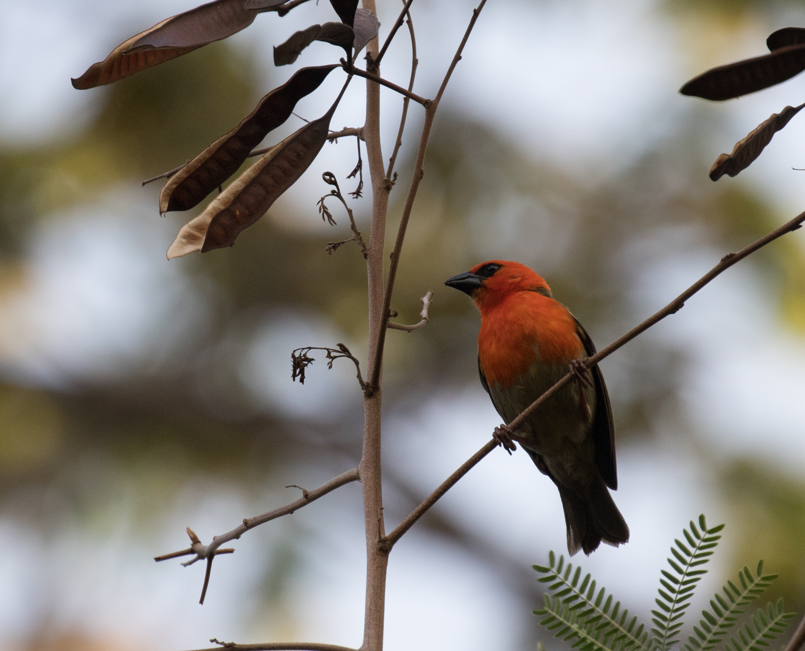 The walk back in along the trail didn’t provide any sightings, but when we arrived at the same clearing we had spent all morning at, we heard the distinctive song of an Anjouan Fody calling nearby. We had actually heard them in the morning as well, but didn’t spend much time tracking one down since we figured they’d be fairly common. This time it was a priority and we quickly found a male singing from the top of a nearby tree. Although we had now seen all of the island’s endemics, I still wanted to get pictures and recordings of the scops-owl so we waited around for dusk.