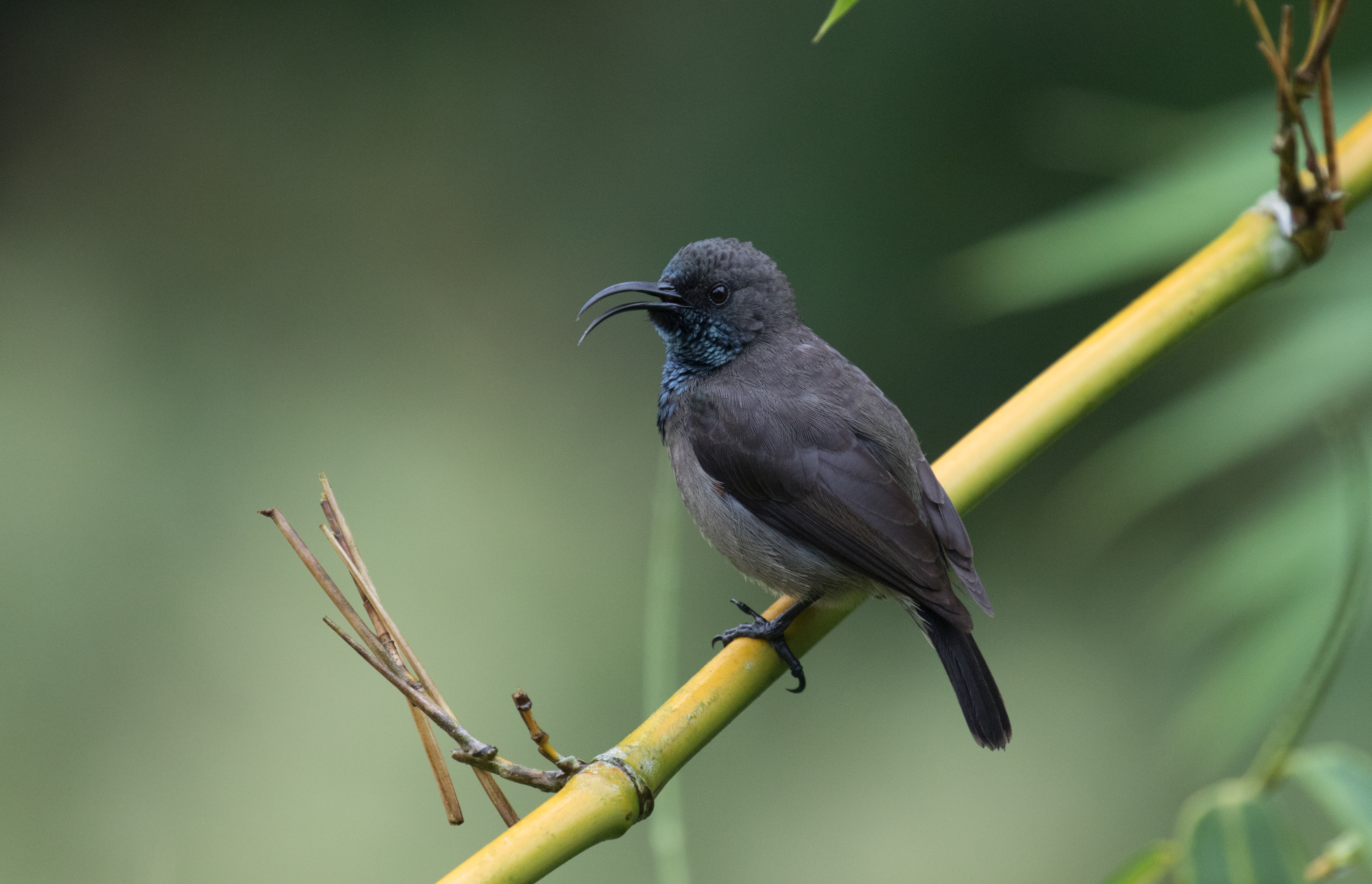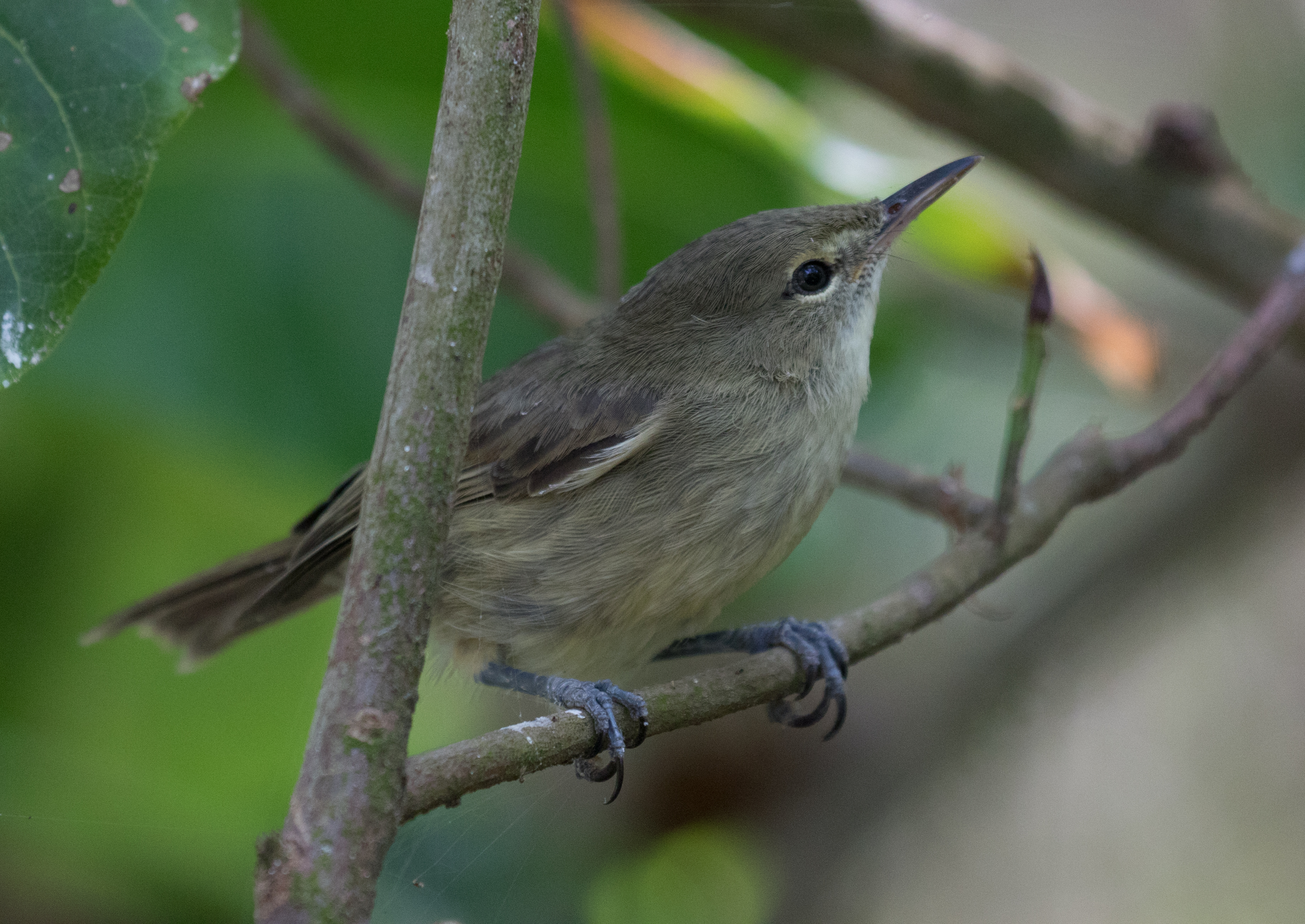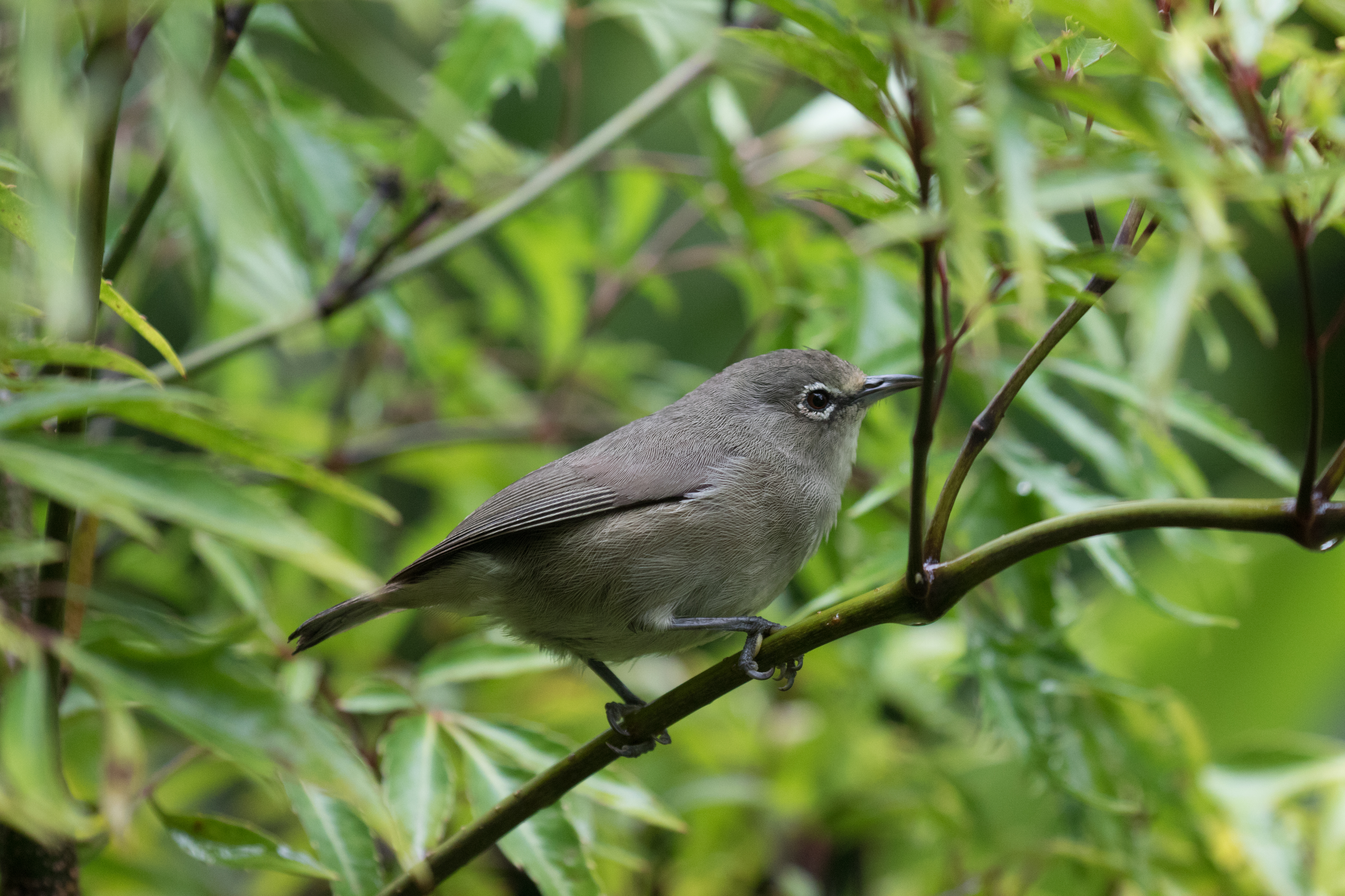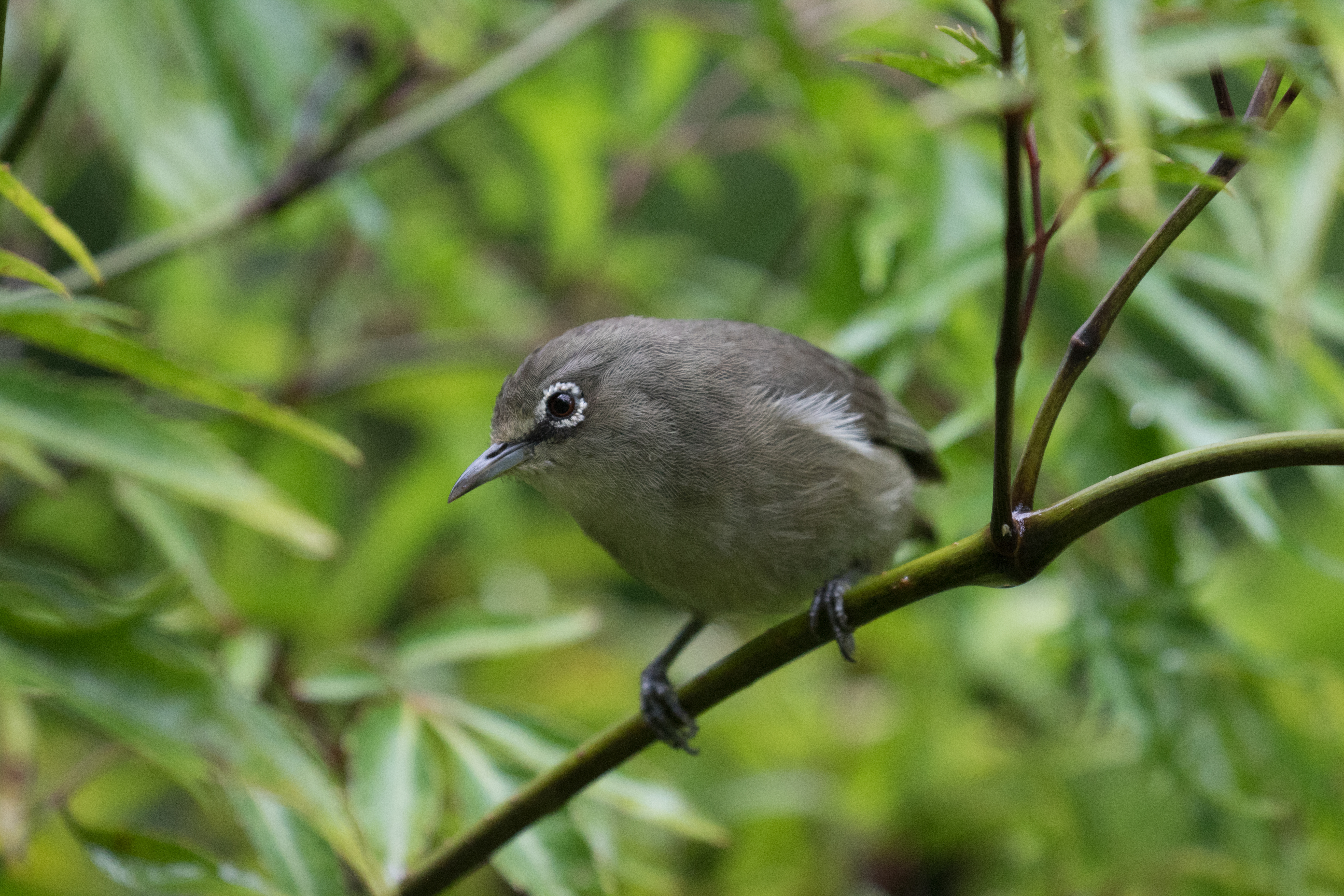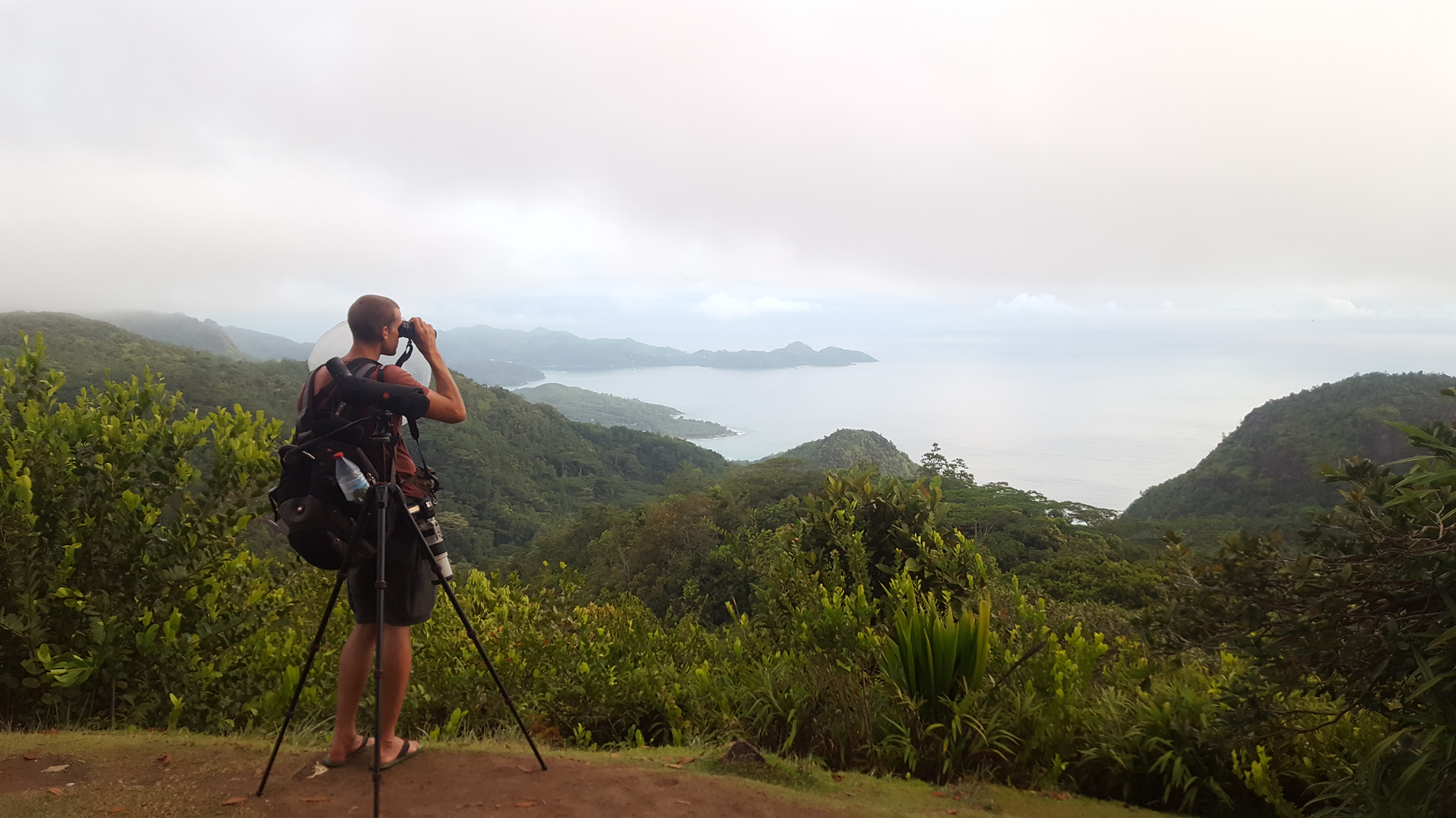 It was already dark when we landed in The Seychelles on the island of Mahe and my delay going through customs certainly didn’t help, but I was just lucky to be in the clear! Who knew that pesky layover in Madagascar would have been so problematic?! At the airport, we picked up what felt like the most sketchy rental car of our lives (no rental agency, no detailed paperwork, just one man who dropped off a car) and made our way to a windy road on the opposite side of the island where Ross and Josh were determined to find one of the most difficult birds of the trip, Seychelles Scops-Owl. I was exhausted (and still partly jet-lagged) and was intermittently sleeping in the back seat of the car when Ross came back to get me. I am taken only a couple meters down from the car and had perched eye level views of a Seychelles Scops-Owl! It was nearly 2am, but the bird that so many birders complain about being impossible was found! Although the night was halfway over, we still managed to set up our tents and camp in order to get a bit of rest. We opted to sleep in until 5am instead of getting up at 4:30, and while the extra 30 minutes of sleep was nice, with an earlier wake up we could have avoided the rain that started at 5am and moisture coated our tents. We quickly tried to pack up and get in the car before all of our belongings were soaked. Quite the alarm clock! The target for the morning was a small, grayish-drab white eye, slightly more plain than other white eyes but slightly more exciting than a plain brown bird. I know what you are thinking, sounds like a serious birders’ dream bird. You’d be right. Ross was not going to miss this one. Unfortunately the weather was less than ideal, with dense white fog obscuring most distant trees, but one of the first birds we heard calling was a song we suspected could be our target white-eye although we never got a look at it. We spent the next few hours walking up the road and checking a few nearby spots before coming back to the first spot near Misere garden when the fog began to lighten and we found an adult Seychelles White-eye with a begging juvenile. Ross managed to get the first public recordings of the species and once we had recordings of their calls/songs getting the birds to come in was extremely easy. You’re welcome, future world listers. This once-challenging bird should no longer be difficult. Ross, being the serious birder that he is wanted to spend a few hours watching, photographing and recording these less than stellar looking birds.