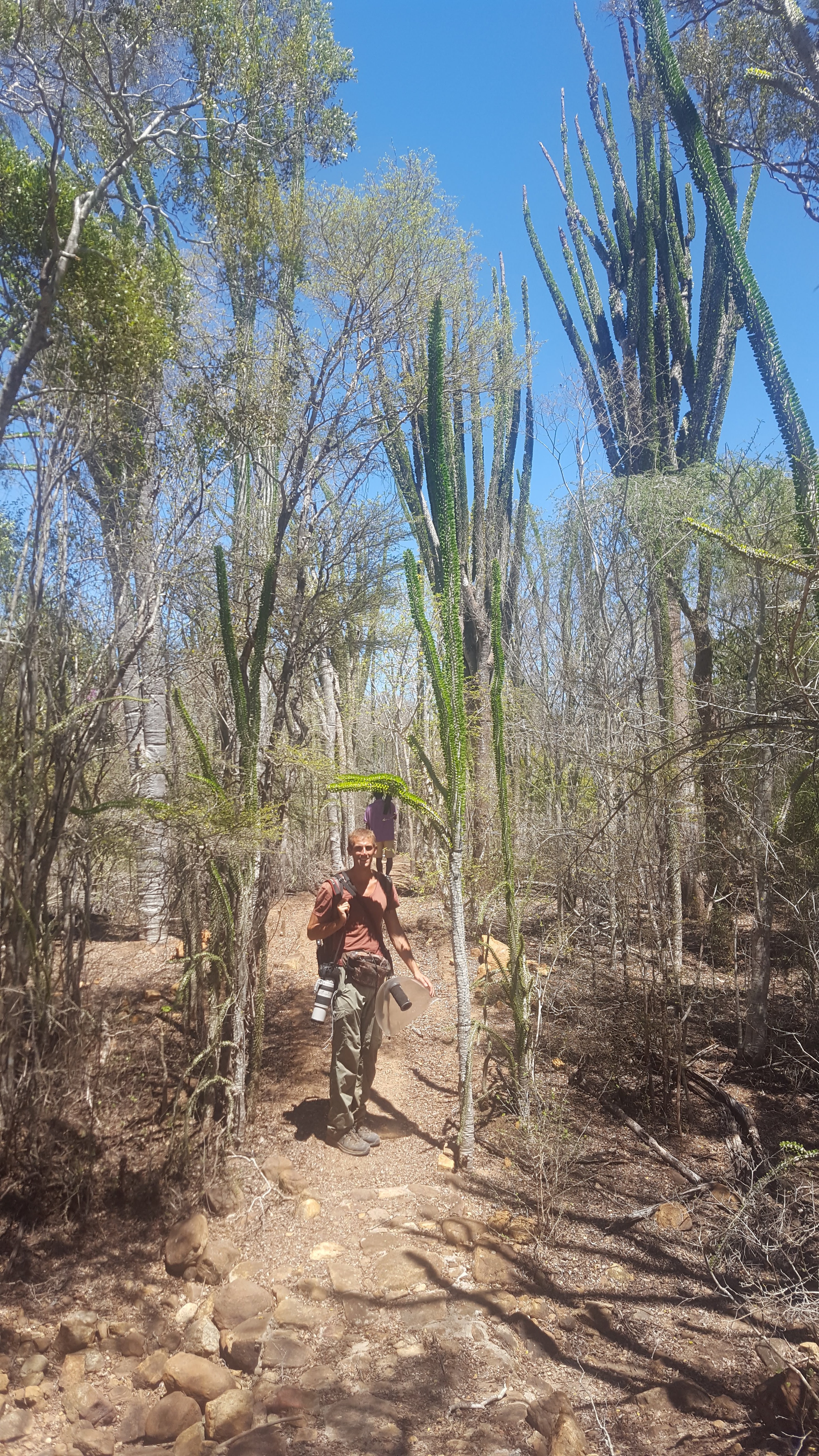 The following morning we headed to the park and, armed with the tickets we purchased the evening before, hoped that now that we could make our full day in the park worthwhile. We met local park “ranger” Ferdinand the evening before when he turned us away for not having tickets, but this time he happily accompanied us through the trails. Apparently there is a “normal tourist” circuit, but since we really only had one real target, we explained that we weren’t your average tourists and would much prefer being taken to a high point in order to scan over the valley. Luckily Ferdinand knew of a spot and took us to a rock gully that had a bit of an overlook. There wasn’t a close hillside to scan by any means, but there was half decent visibility. Before long the guys (aka everyone but me) had picked up on a rather stout flying raptor and determined it to be Banded Kestrel! Unfortunately for me I was up the hillside a bit further scanning a different direction and by the time I ran down to where they were standing, I never got on the bird. However, that being said, now that Ross, Geoff and Josh had a good look at a true Banded Kestrel, they were more convinced than ever that the kestrel we all saw fly over while in Ankaranfansika was in fact banded. But at the time no one wanted to count a bird as a lifer if they weren’t 100% sure so it simply went down as a kestrel sp. Lucky for me, they were now quite certain and I had in fact seen the bird in Ankaranfansika so missing this flyover wasn’t as big of a deal! (Judge me if you want, but I was more than prepared to count a bird that I had seen if everyone else in the party was certain that it was the target we needed!) We scanned the hillside a bit more before me, Ross and Josh walked with Ferdinand to get to another view. While walking we either had the same bird that they saw earlier, or another individual but sure enough a Banded Kestrel was above our heads. Ferdinand was the first to spot the bird and it was so high above our heads that we had no idea how he saw it because he didn’t even own a pair of binoculars! This was the fourth time that he impressed us with his laser-like vision and we had no idea how he was finding these distant raptors! Madagascar Kestrel outnumbers Banded by at least 30 to 1 but in our morning we managed to see at least one, maybe two, individuals! Along with that we all crossed Lafresnaye’s Vanga off of the list and joked that we surprisingly had managed more than one new bird for the day! It was funny because lately we had been struggling to see anything new, which becomes typical when you reach the end of your trip to Madagascar where there is such limited diversity. We were however enjoying this unique dry, spiny habitat, seeing several iconic baobab trees and the Didierea madagascariensis, commonly known as the octopus tree, were beginning to green up during the start of the rainy season.