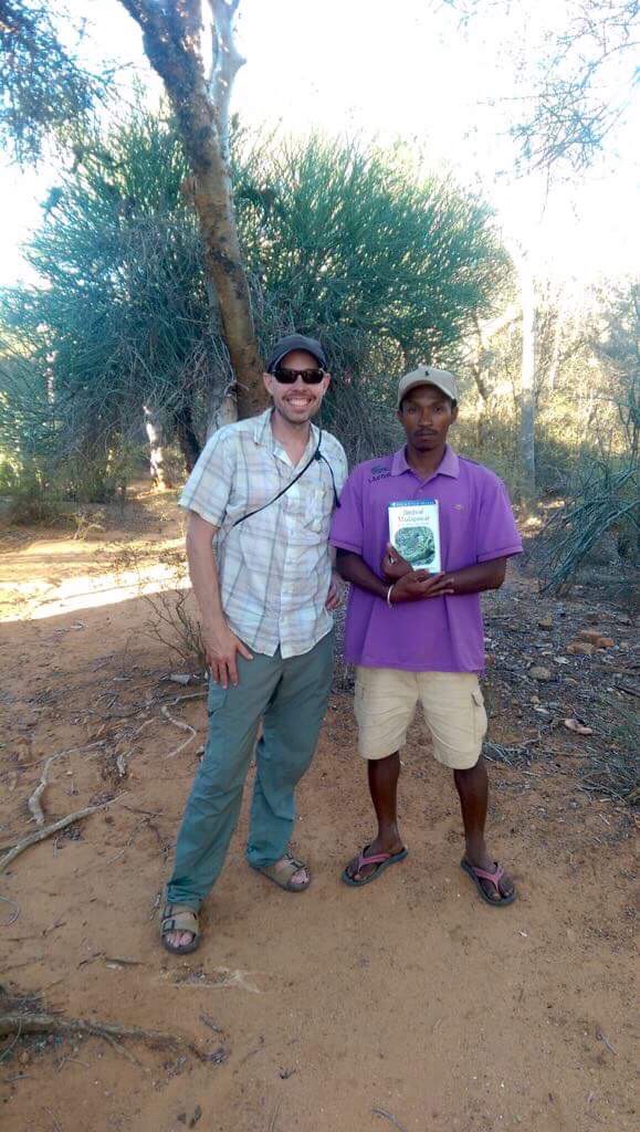 Originally we hoped to stay until after dark and do a night walk specifically looking for the rare and elusive Fosa, Madagascar’s largest land mammal which looks like a mix between a wild dog and a puma. Ferdinand explained that without a night ticket that was not possible. We soon thought that the “night ticket” was a made up ploy to get us to drop the idea but with a lot of back and forth and for the right price, eventually Ferdinand agreed, but our driver was not keen on the idea and lobbied that it could not be done because of police safety checks on the roads. Eventually we conceded to not going out and I think Ferdinand was a bit disappointed to lose out on the extra (significant) income. I don’t think a lot of tourists visit Andohahela and if they do, they definitely aren’t asking to go out at night, so we might have been some of the first people with these kinds of requests. For anyone else hoping to visit Andohahela, I would recommend simply camping in the park so you can stay until after dark. Lucky for Ferdinand, in an act of kindness, Josh decided to give him his copy of the Birds of Madagascar book! Now those laser eyes will be able to identify the birds he sees and can (hopefully) pass this information down for generations to come!