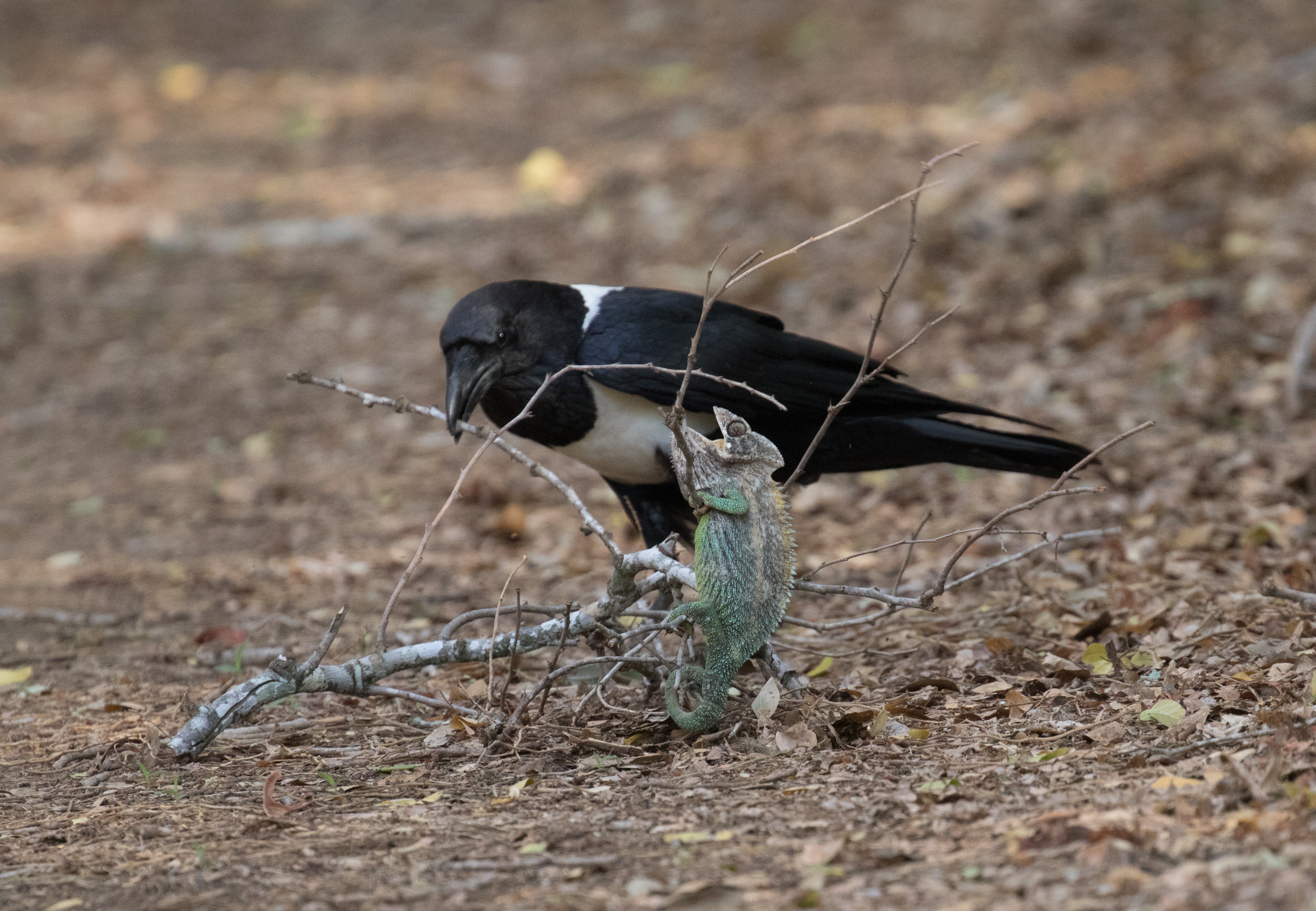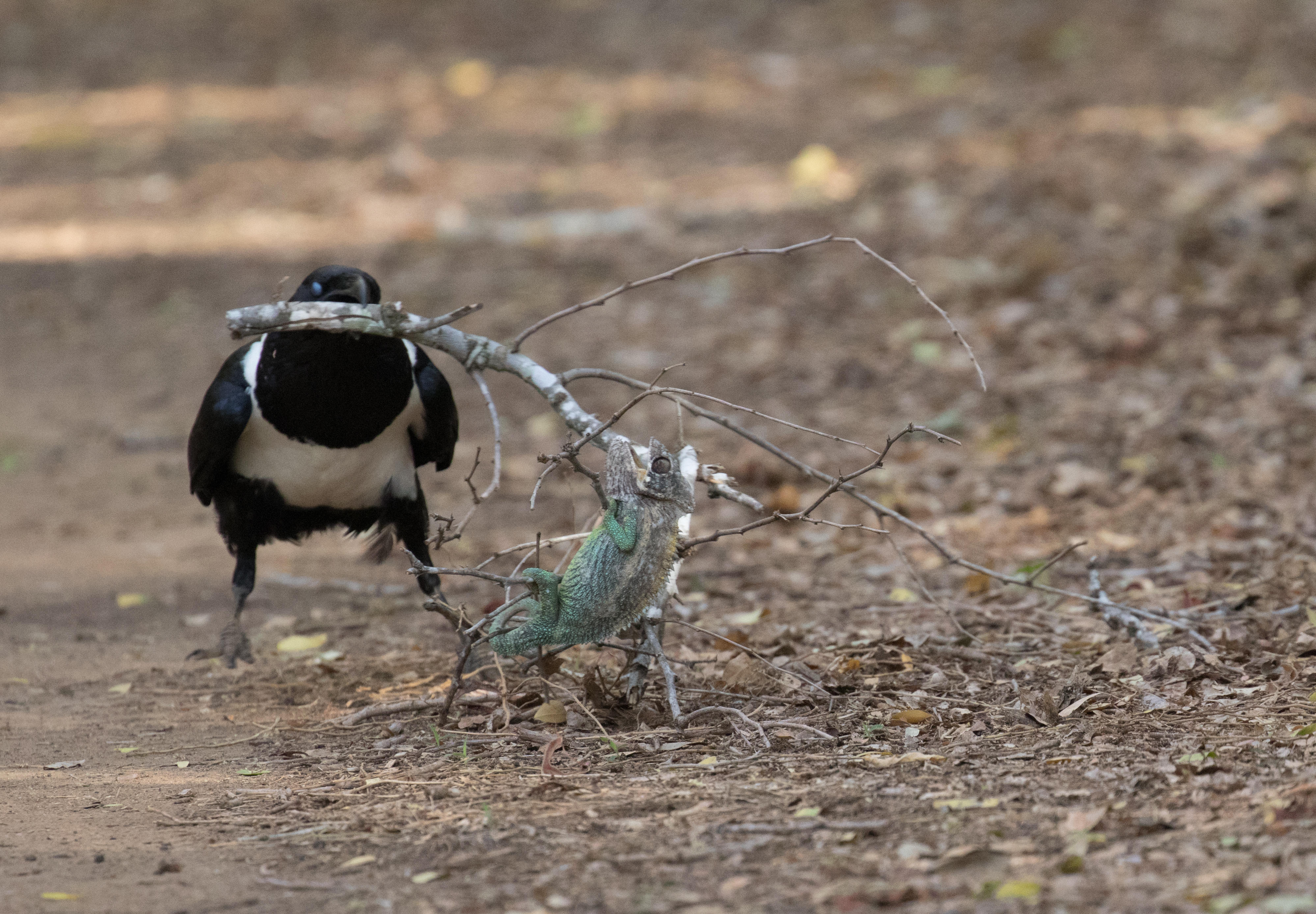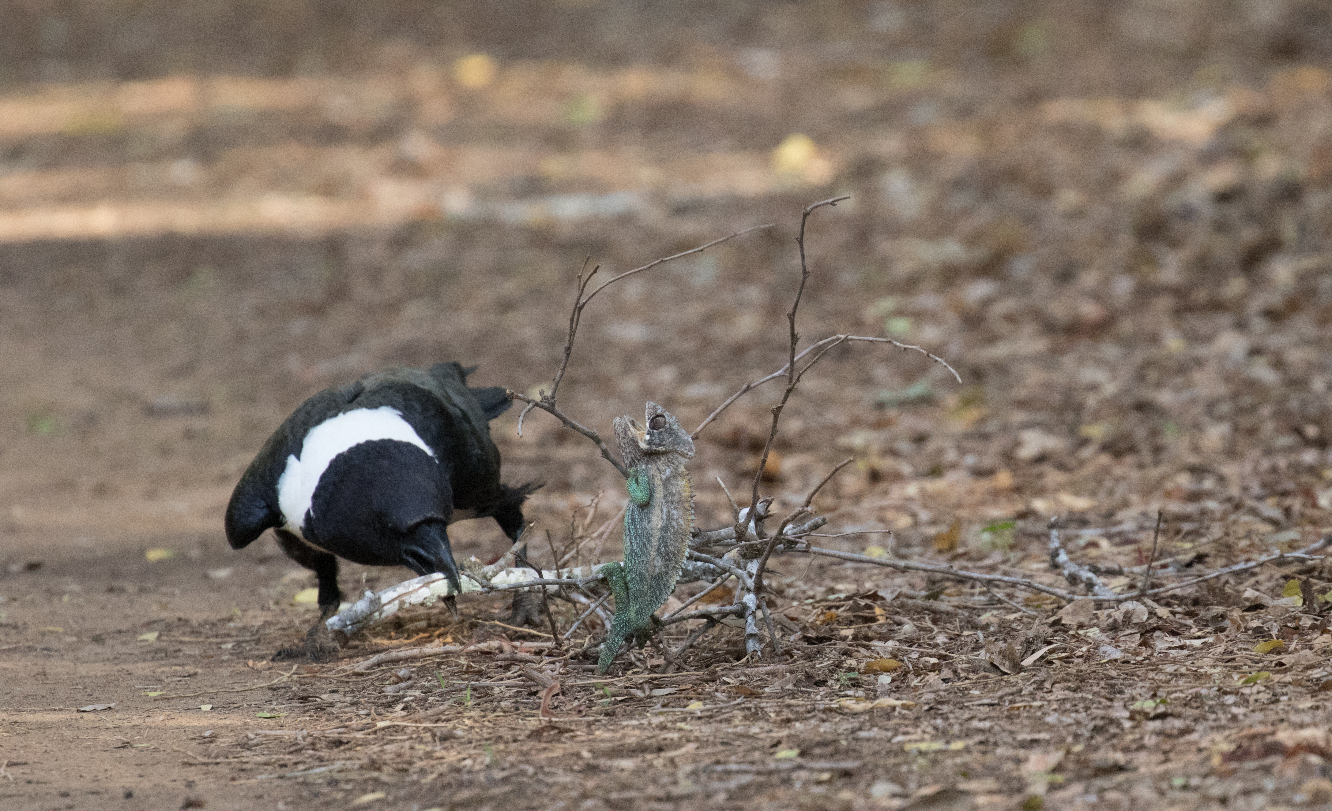 Our last morning in Berenty was a very chill one that Ross and I spent meandering the trails searching for lemurs. We weren’t exactly expecting to have one of the coolest experiences ever. We were walking down a trail when Ross heard some lemurs calling in the distance that he hoped to go photograph. I stopped him because a Pied Crow was sitting in the middle of the trail playing with a branch. I told Ross I would rather watch the crow so we decide to check it out a bit closer. Turns out that the branch the crow was playing with had a Oustalet’s Chameleon on it! The crow likely broke the branch off of the tree and now was working to break off smaller branches so the chameleon would have less to hold on to. We watched the crow drag the branch back and forth until he eventually got it out from under the chameleon and that was essentially game over. The crow then grabbed the chameleon by the tail and proceeded to pick it up and drop it a few times. We were feeling a bit sad for the chameleon but such is the circle of life. It was one native species eating another. Perhaps if it was a common introduced POS (such as a Common Myna) attacking a rare endemic we would have intervened, but more often than not it is best to just let nature play out the course. It was still super neat to see and we walked away wondering how we ever got so lucky to witness something so neat! (The more time you spend outside the higher the chance to have the opportunity!)