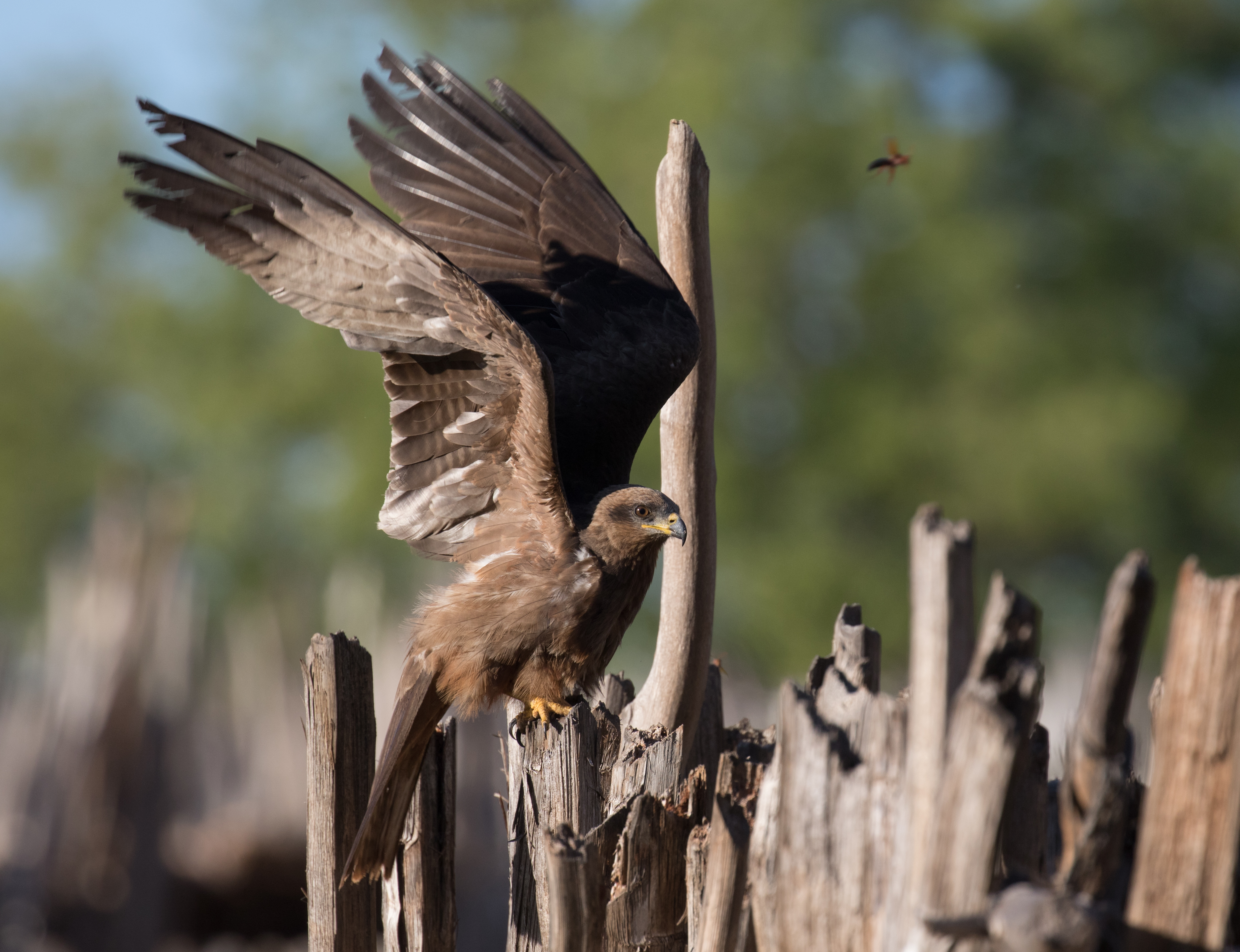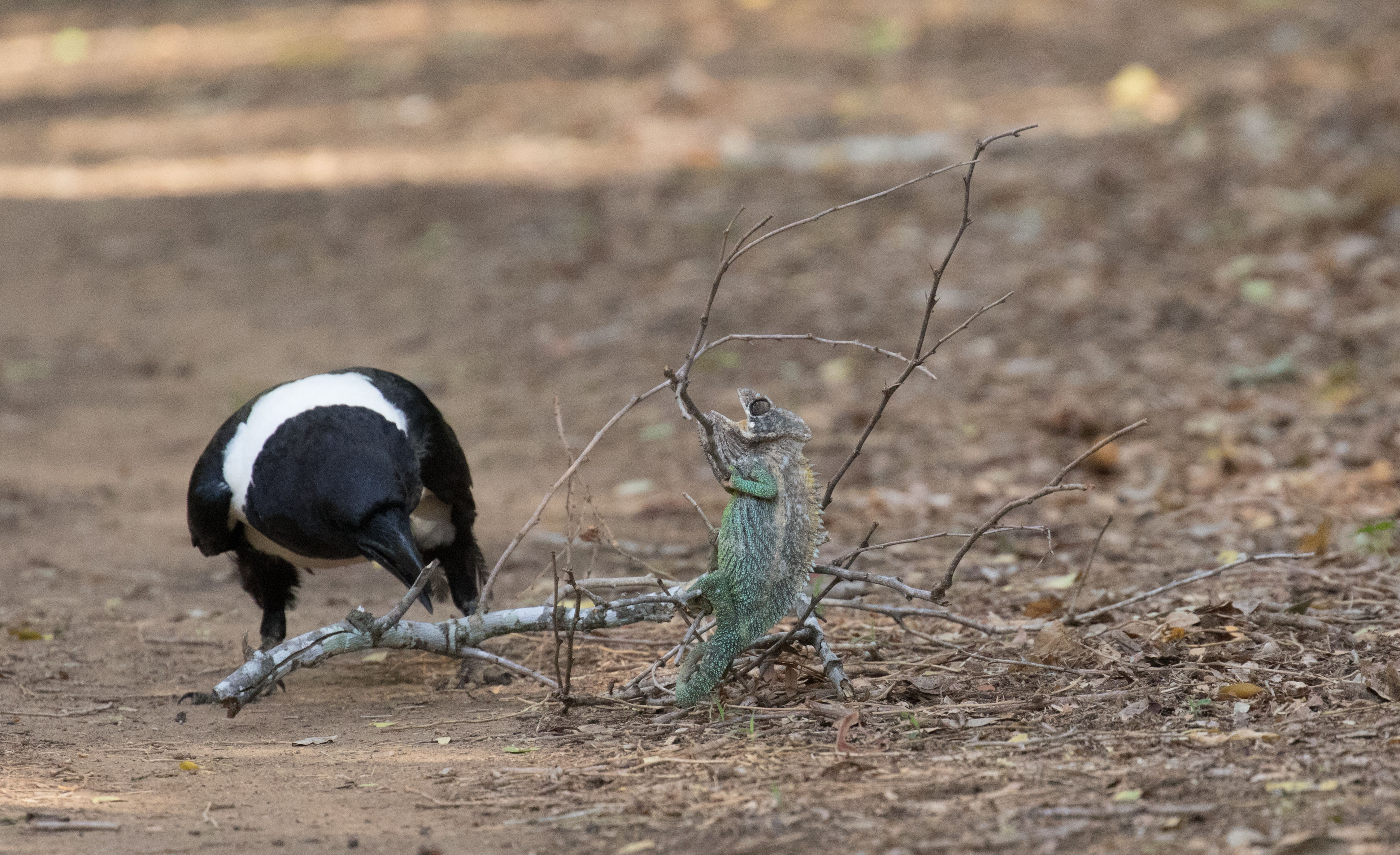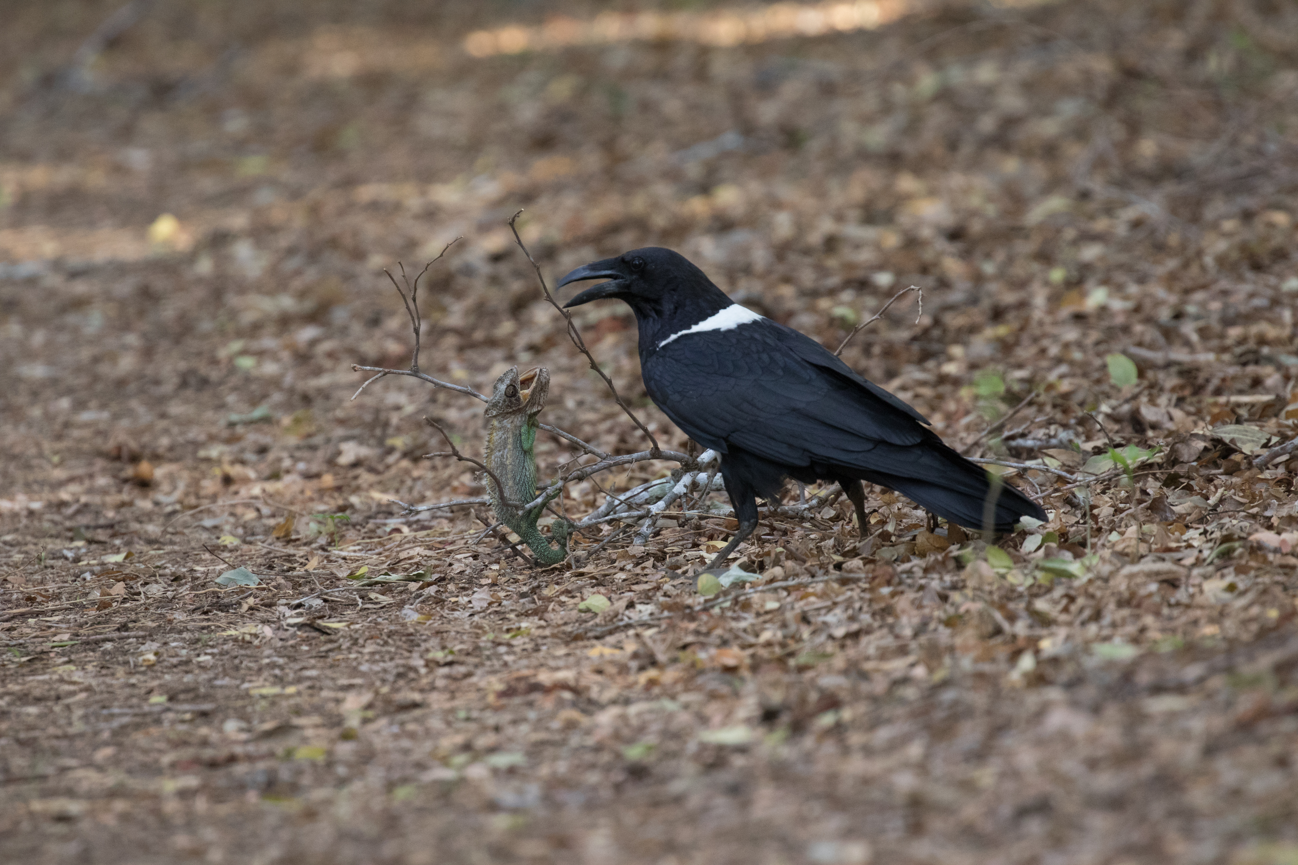 Our last morning in Berenty was a very chill one that Ross and I spent meandering the trails searching for lemurs. We weren’t exactly expecting to have one of the coolest experiences ever. We were walking down a trail when Ross heard some lemurs calling in the distance that he hoped to go photograph. I stopped him because a Pied Crow was sitting in the middle of the trail playing with a branch. I told Ross I would rather watch the crow so we decide to check it out a bit closer. Turns out that the branch the crow was playing with had a Oustalet’s Chameleon on it! The crow likely broke the branch off of the tree and now was working to break off smaller branches so the chameleon would have less to hold on to. We watched the crow drag the branch back and forth until he eventually got it out from under the chameleon and that was essentially game over. The crow then grabbed the chameleon by the tail and proceeded to pick it up and drop it a few times. We were feeling a bit sad for the chameleon but such is the circle of life. It was one native species eating another. Perhaps if it was a common introduced POS (such as a Common Myna) attacking a rare endemic we would have intervened, but more often than not it is best to just let nature play out the course. It was still super neat to see and we walked away wondering how we ever got so lucky to witness something so neat! (The more time you spend outside the higher the chance to have the opportunity!)