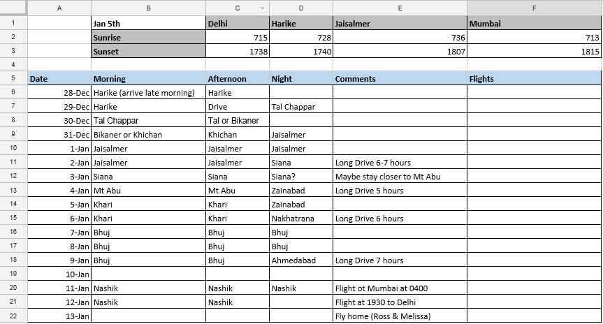 Why India you might ask? Well, this whole India trip was Ross’s idea. He wanted to go see Great Indian Bustard before it goes extinct. Because going extinct it will. There’s not really a good program in place that could save this species before it disappears, especially because habitat loss, power line collisions, and hunting continues to be a huge problem and the population is already estimated to be no more than 100. One hundred. That’s it. It’s a sobering thought, but it’s also motivation to get over to India before this one is gone for good. Certainly there are other species out there that number less and will go extinct soon as well, and believe me they are on the list to see ASAP too, but this one is in a critical situation and took priority. Future birders won’t be able to ‘tick’ this large, grassland dweller and we wanted to be sure we do while it is still an option. It’s one of the heaviest flying birds by the way. So with Great Indian Bustard in mind Ross decided that we needed to get over to India and from there birthed a rough itinerary that has since become more refined as Stephan, Julien and Ross acquired more data. In case you are extra curious, right now that itinerary looks like this: