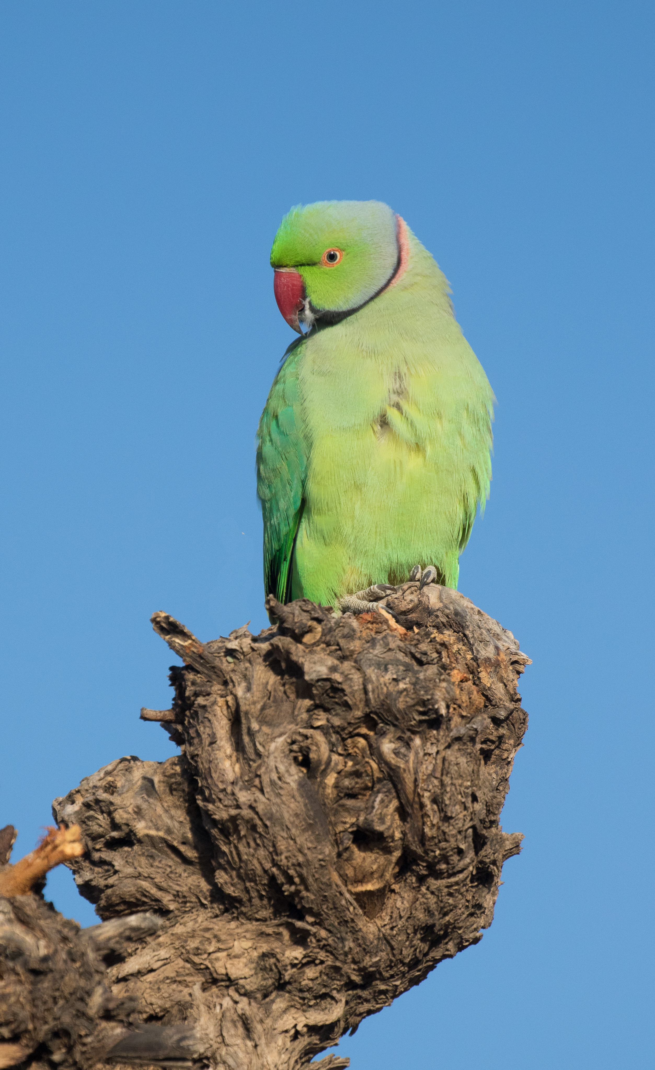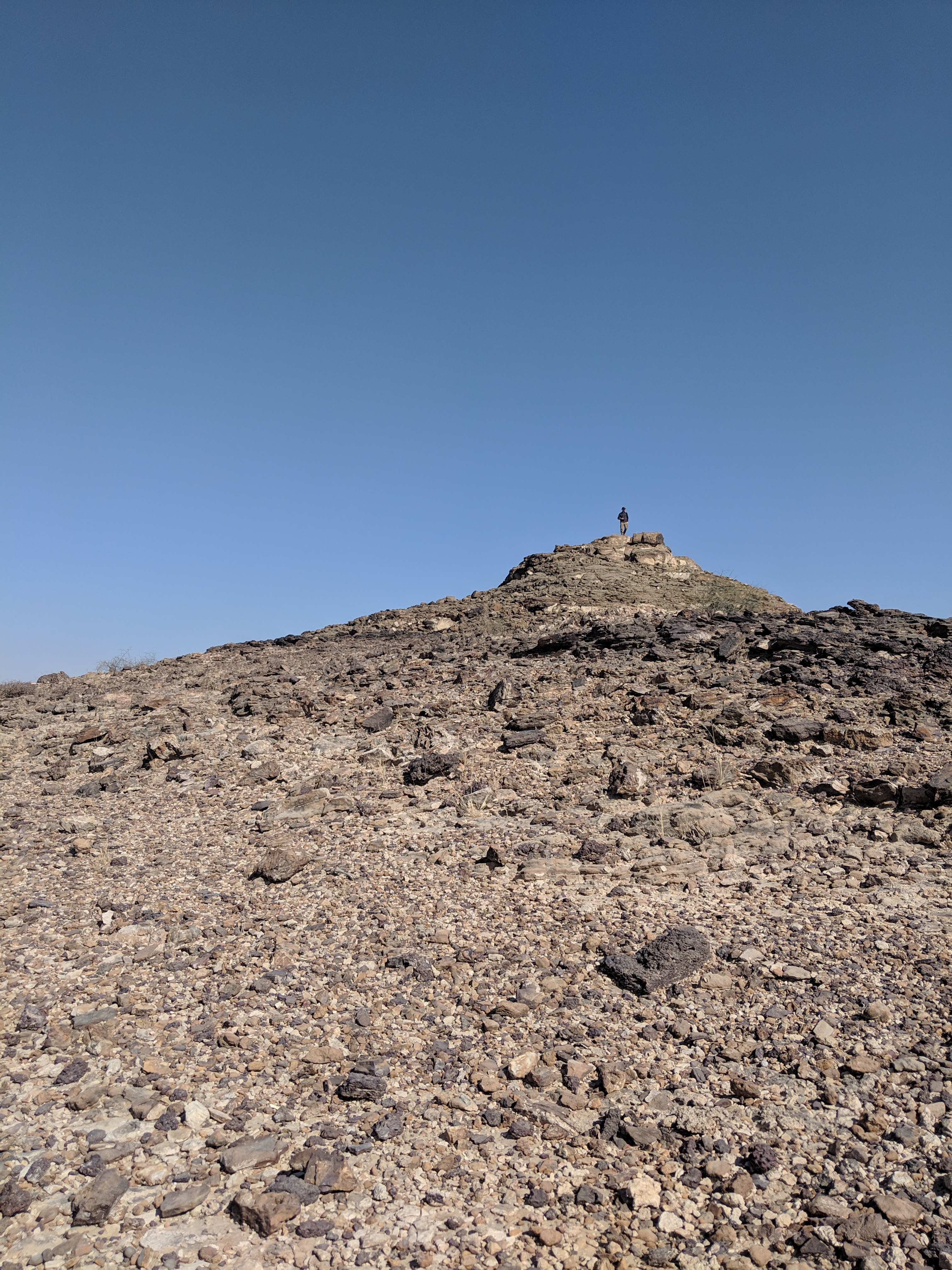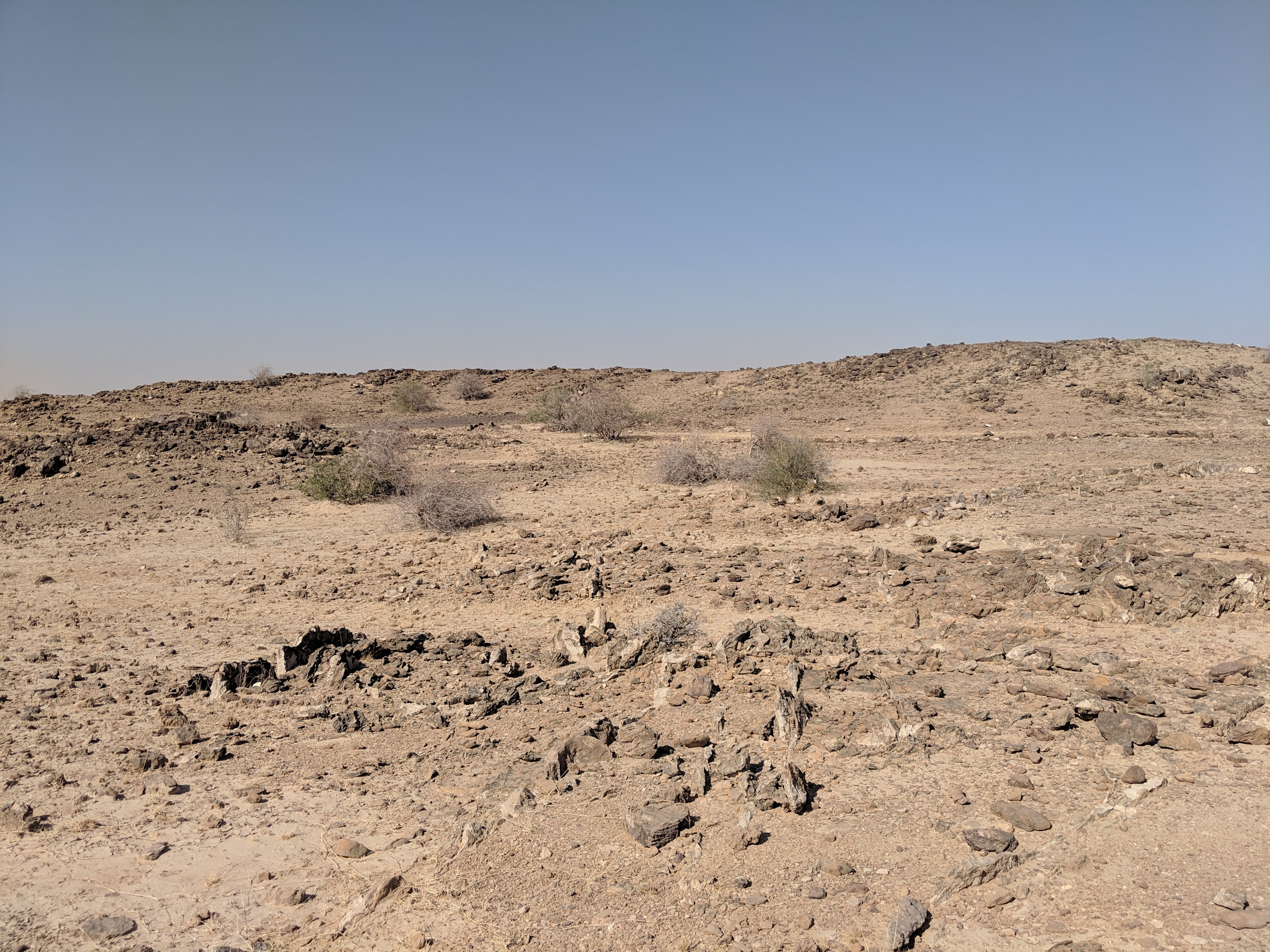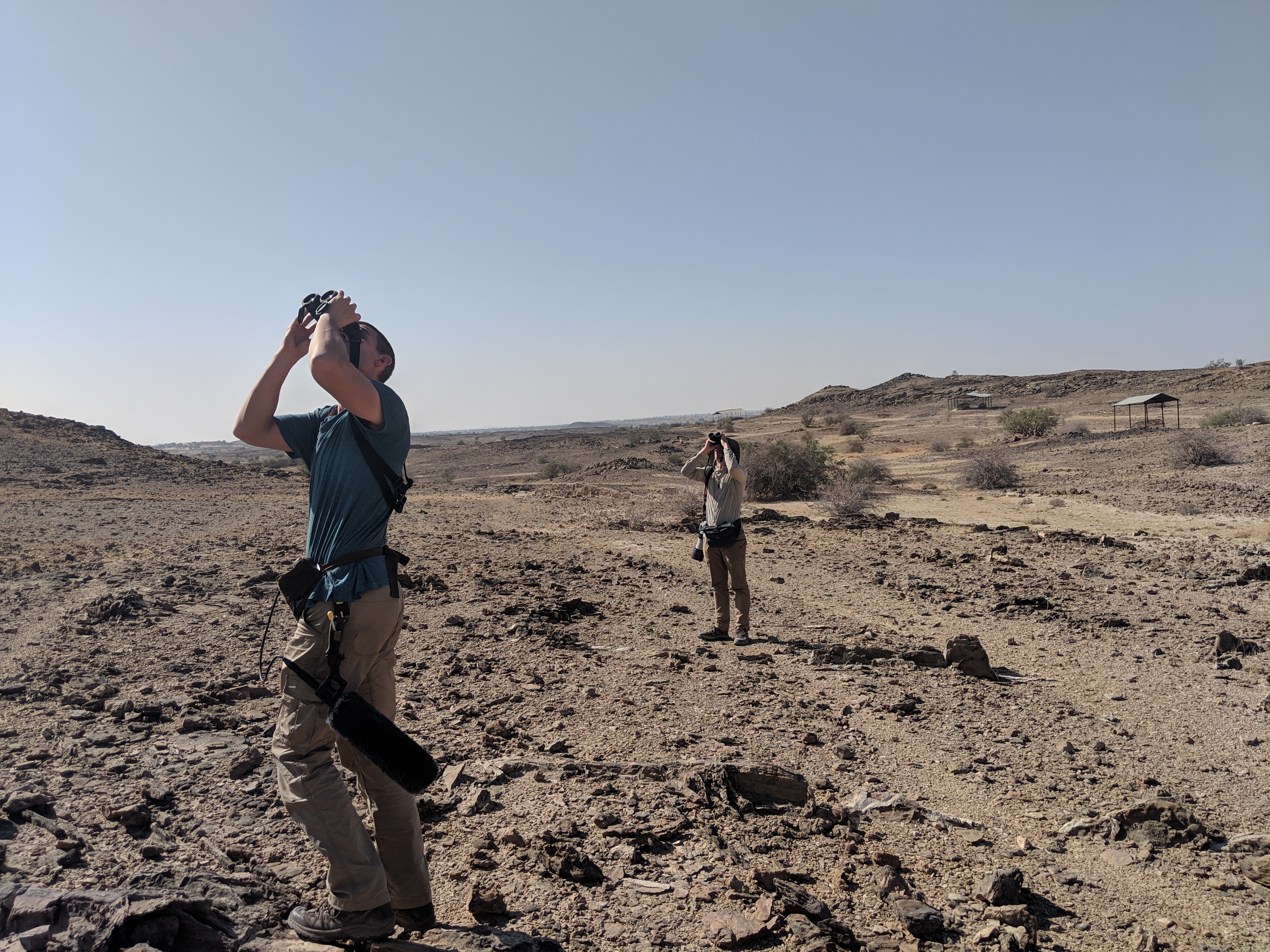 Eventually we arrived at Akhil Fossil Park, just in time for the heat of the day and began our quest for our four target birds in the area. Don’t let anyone tell you otherwise, birds can still be found in the heat of the day, it just might require a bit more effort. The terrain of Akhil Fossil park was a dry, rocky outcrop with a few small rocky hills and small scattered pavilions highlighting petrified wood. It was for these boring fossils that the park was built. (Wait, is it bad to call the petrified trees boring?) It was blue skies with no clouds and 80°F (26°C) sunshine, but despite these conditions we quickly found Red-tailed Wheatear before Julien wandered off and found the first Striolated Bunting. He called Ross and I over, as we weren’t too far away so we could get on the bird too. Two targets in the bag. Unfortunately the group had split up quite far apart which made it a bit of a challenge to gather everyone back at the car so we could head back to where we had the buntings. When we all reunited, we learned that Killian had flushed up a pair of Indian Eagle Owls. We hoped to relocate those on our way over to the buntings but no such luck. To make matters worse, the bunting was also not around when we arrived back at the spot. Stephan and Claudia wandered off to do their own thing in one direction while Julien had stayed behind hoping to relocate the owls Killian had found. Ross, myself, and Killian were walking together when Killian suddenly flushes up a nightjar. Killian the flusher! We watched the nightjar fly knowing that in all likelihood it would be an Indian Nightjar, but the bird flew right in front of Ross and didn’t have any white in the tail which made him question that ID. We called to Julien who was standing on the opposite hillside to say we found a nightjar. He called back to say he refound the eagle owls and a few more buntings. It was a productive few minutes!