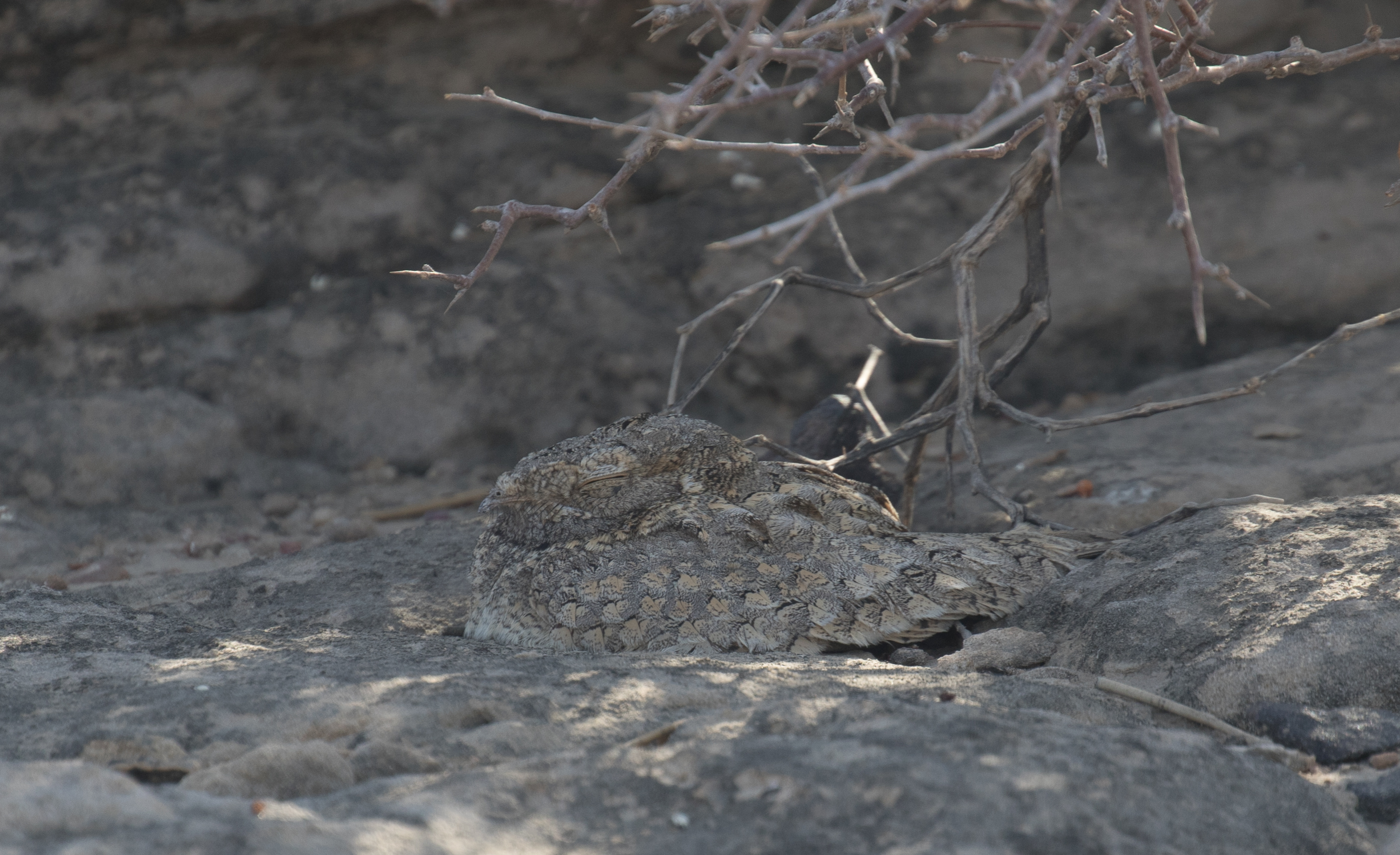 Nightjars are masters of camoflauge and despite seeing the general area the bird landed, the bird blended seemlessly with the terrain and we couldn’t see it sitting on the ground. When this happens the best way to find the bird is to walk close to the landing site and flush it again and hope you do better the next time it lands. Up it went and then down it went, once again perfectly out of sight. At least this time Julien could see it fly as he stood on the hillside opposite of us. When he got over to us Ross quickly checked Julien’s bird book because this was looking less and less like an Indian Nightjar. We had to flush the bird once more but at least this time, once it made its way back to the ground, we had found it sitting. This was no Indian Nightjar. Without question we were looking at a Syke’s Nightjar. This was a good bird. We laughed at how Killian had flushed up two night birds, one of which was a complete surprise. Finally we manage to get Stephan to come over to us and we all stood and admired the light sandy-toned feathers and stunning camouflage, not knowing at the time that this bird was more than just another lifer. We all refound the Indian Eagle Owl when Killian once again flushed them up off the ground. Killian clearly had a knack for flushing up roosting birds!